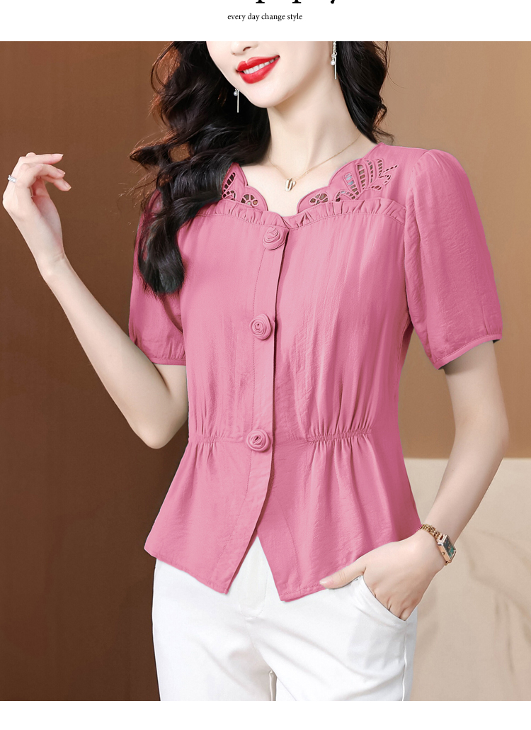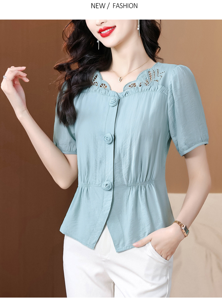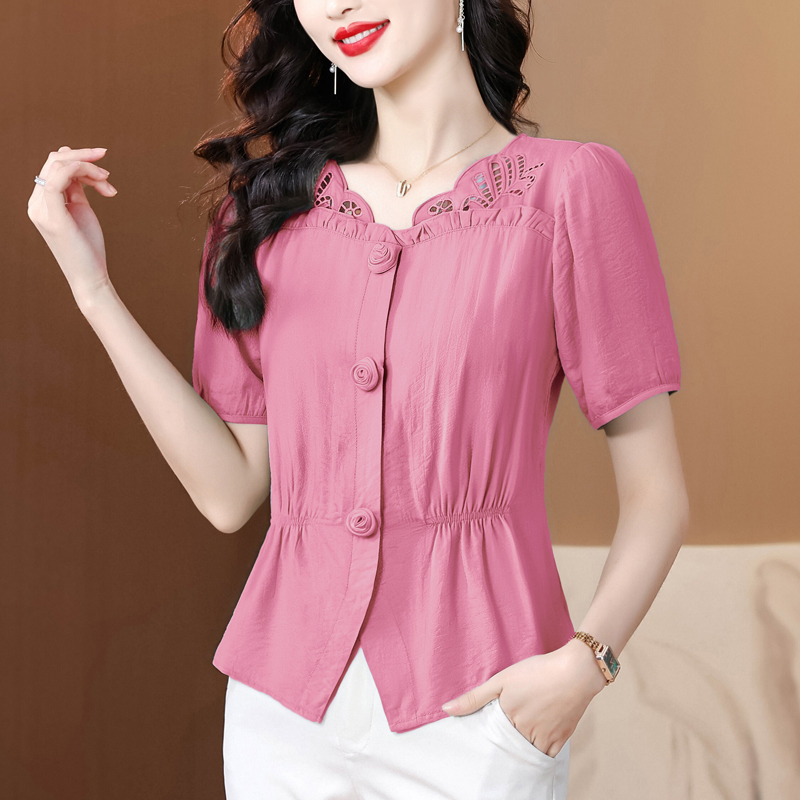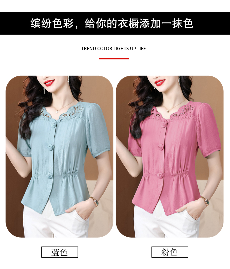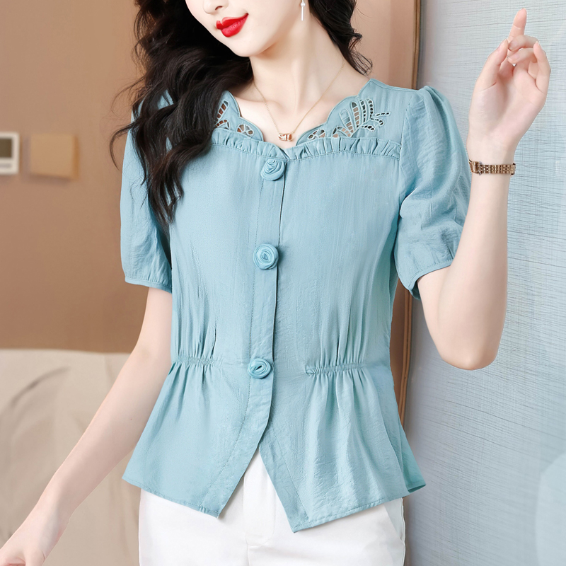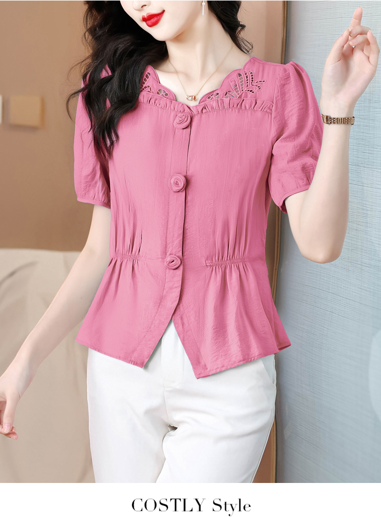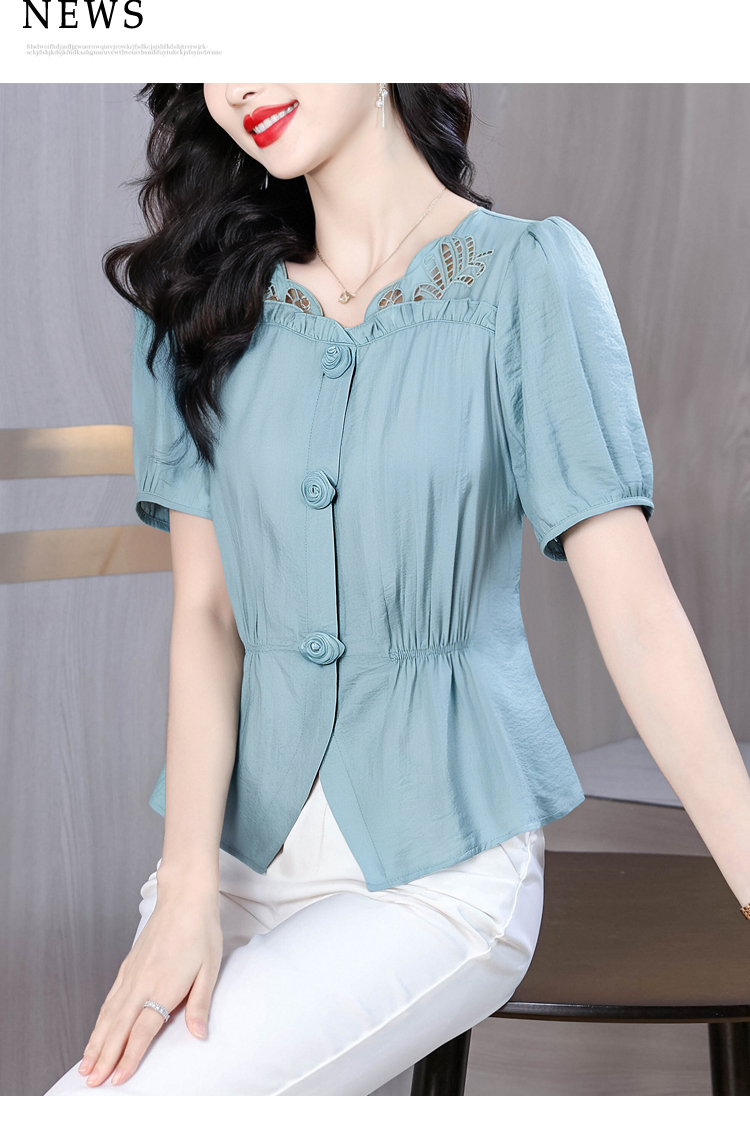 RY2829# 时尚气质短袖衬衫女2026年夏季新款减龄洋气镂空收腰显瘦百搭上衣