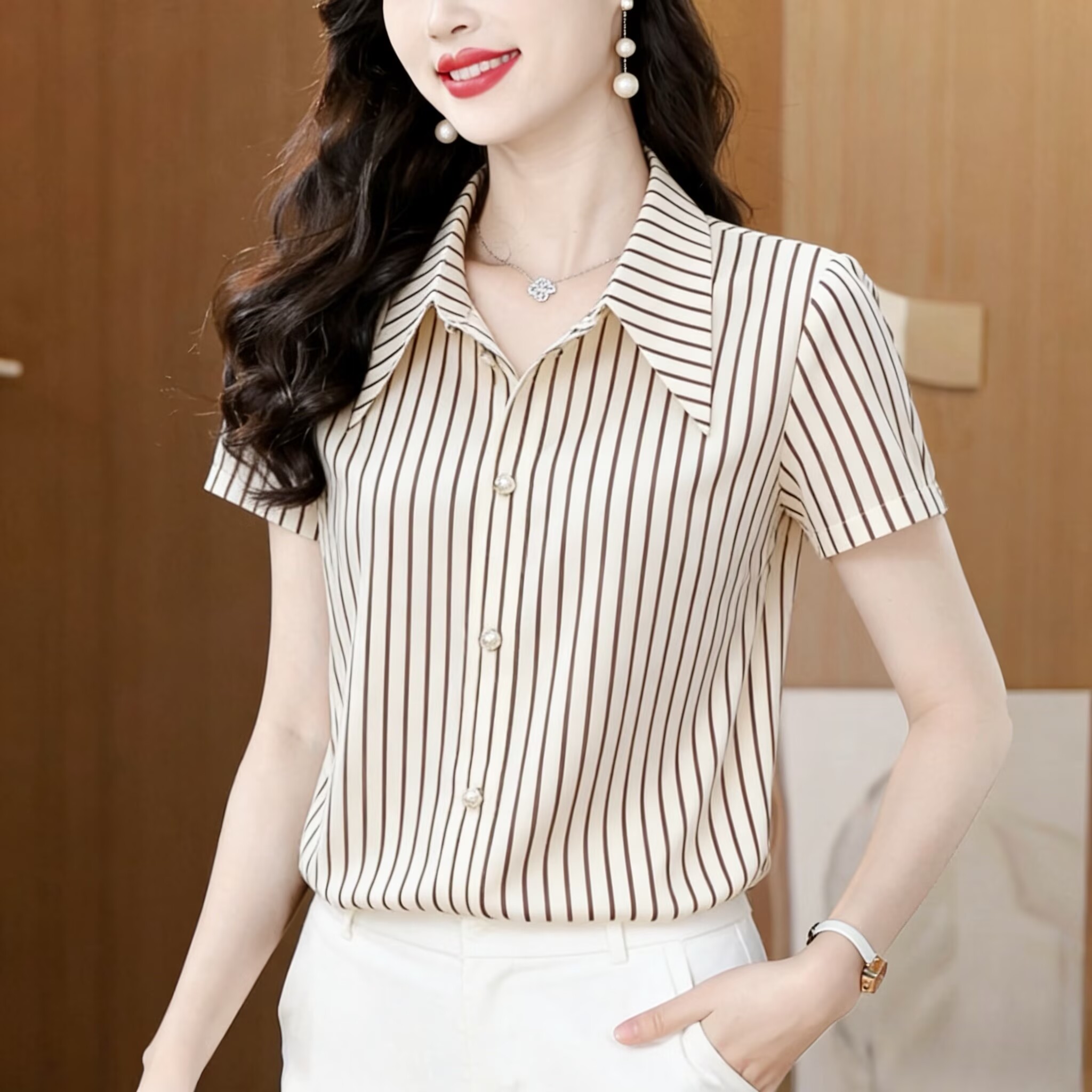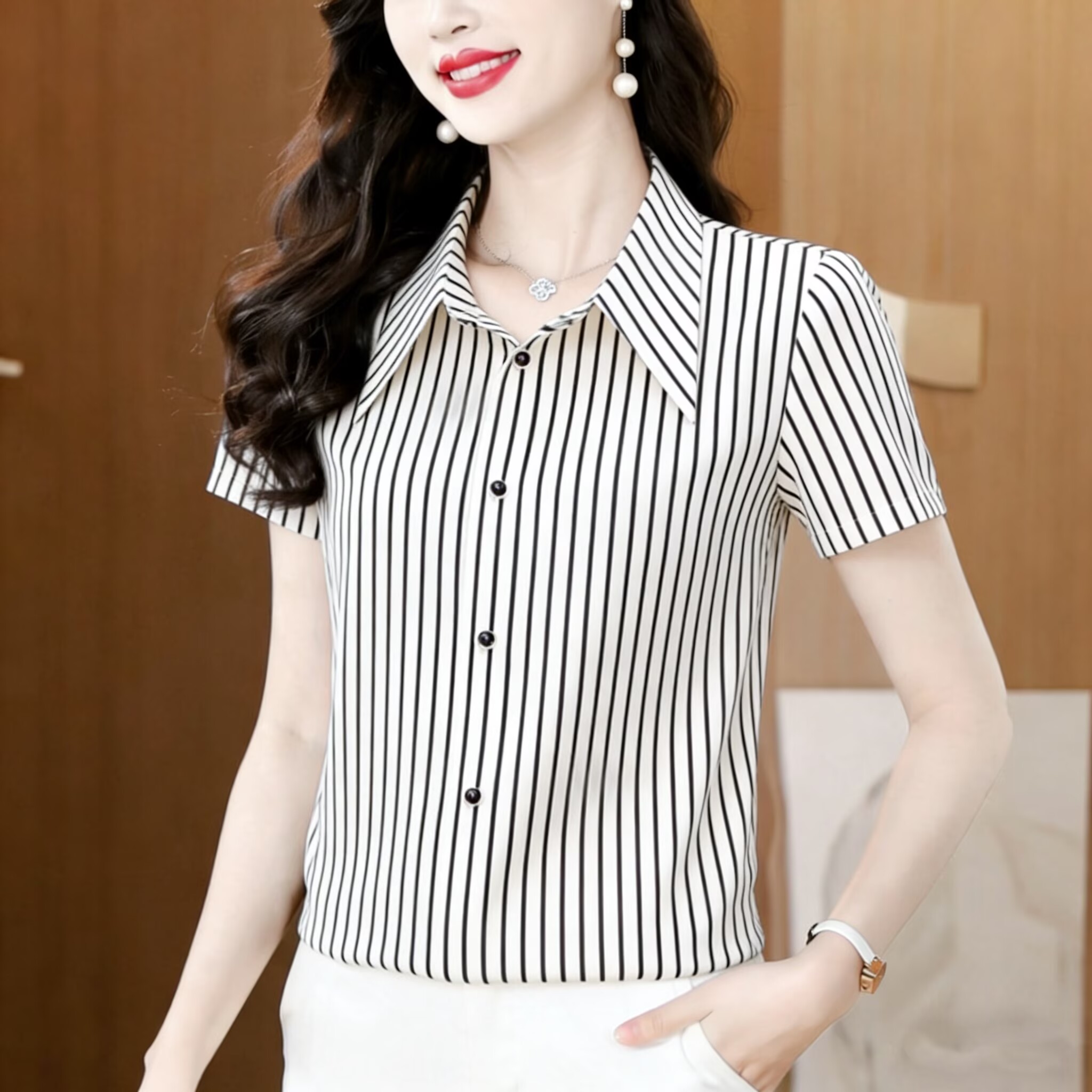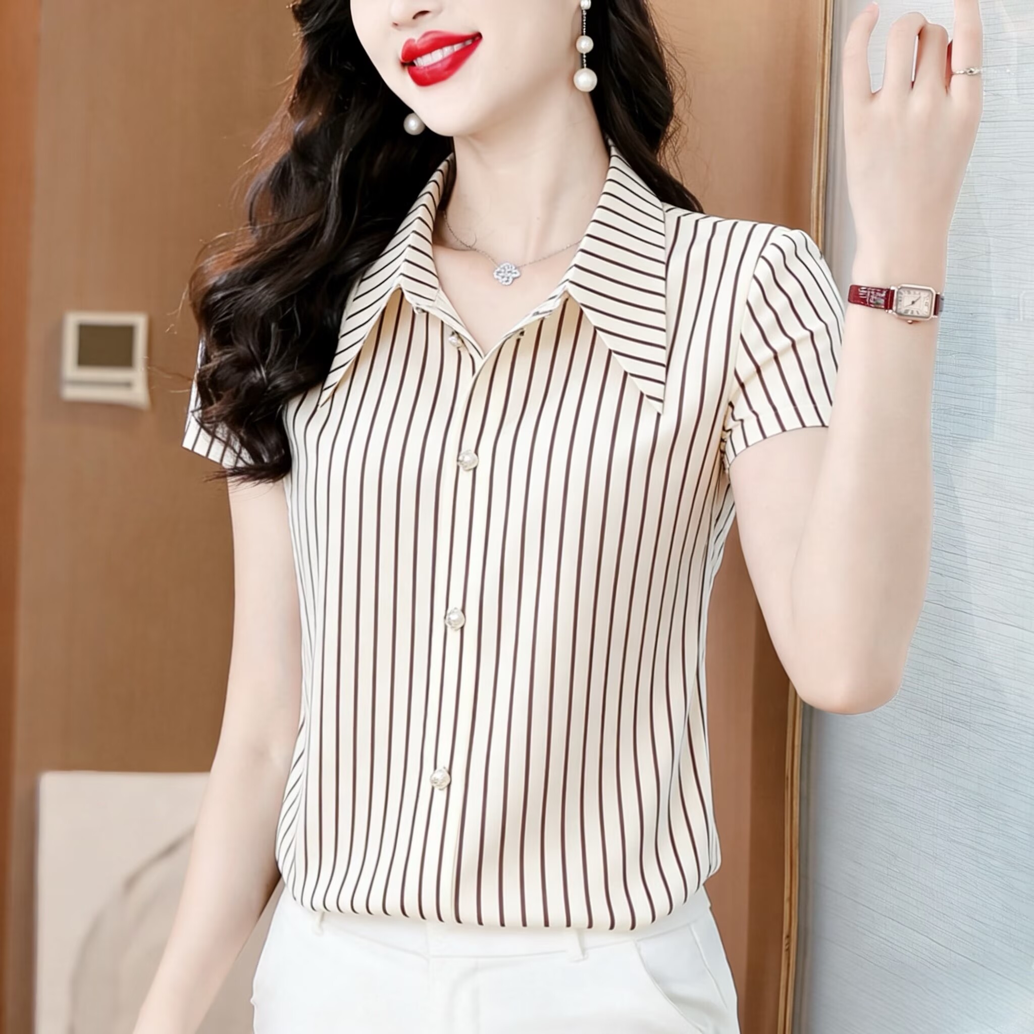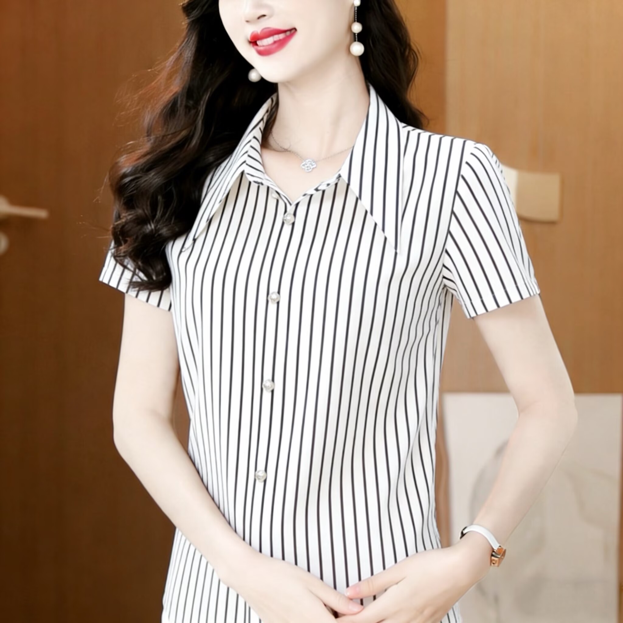 RY2833# 2026新款薄款短袖衬衣时尚宽松洋气遮肚显瘦减龄上衣女