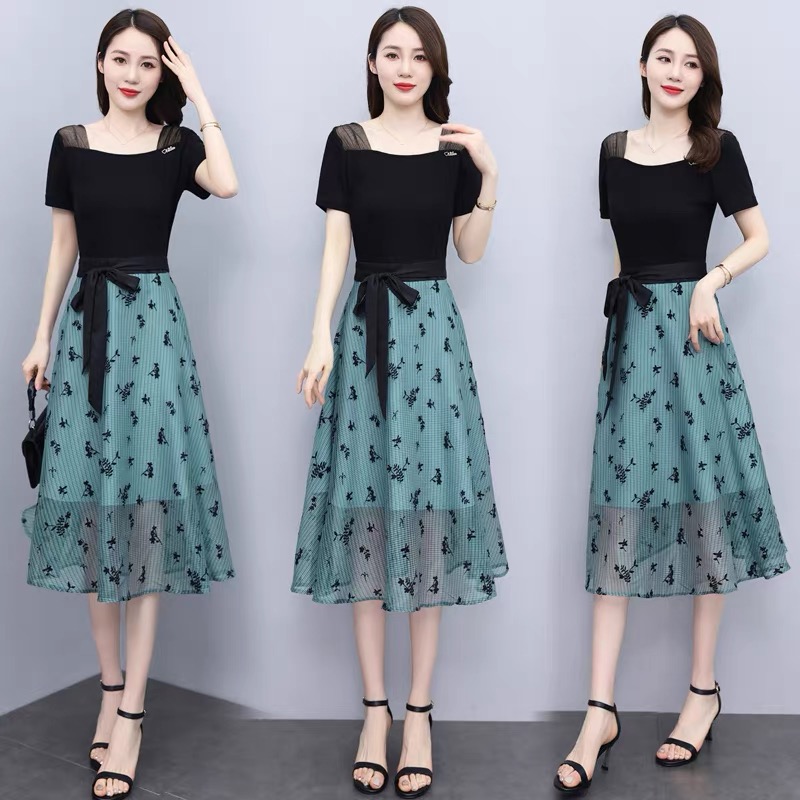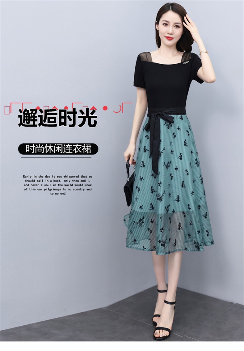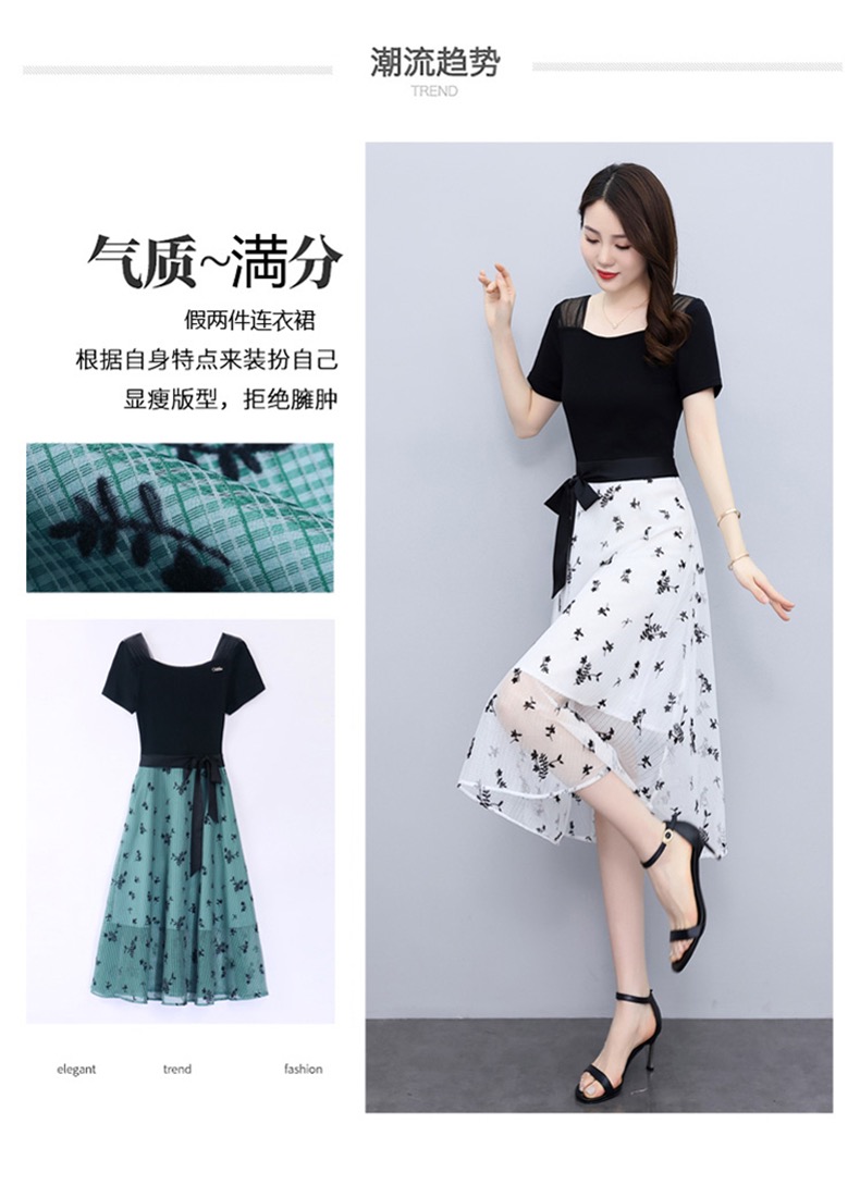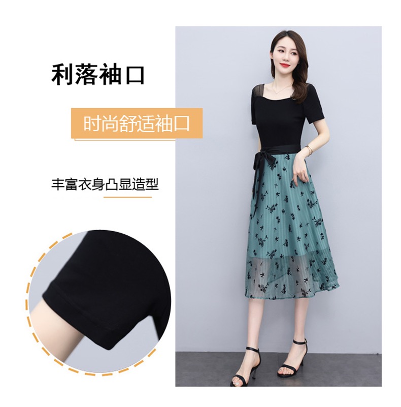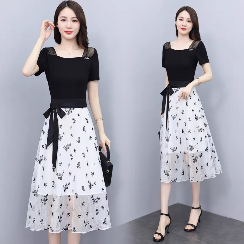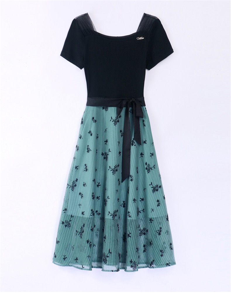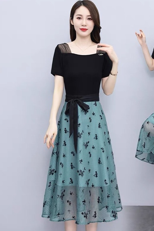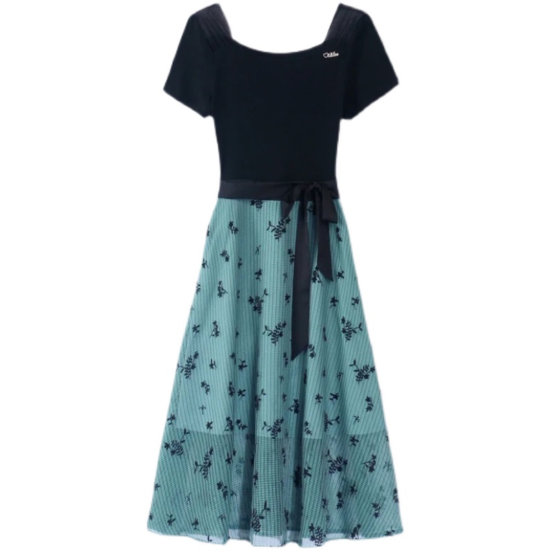 RY2971# 实拍方领印花连衣裙女夏装2026年新款收腰系带拼接过膝通勤a字裙