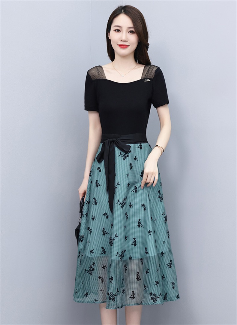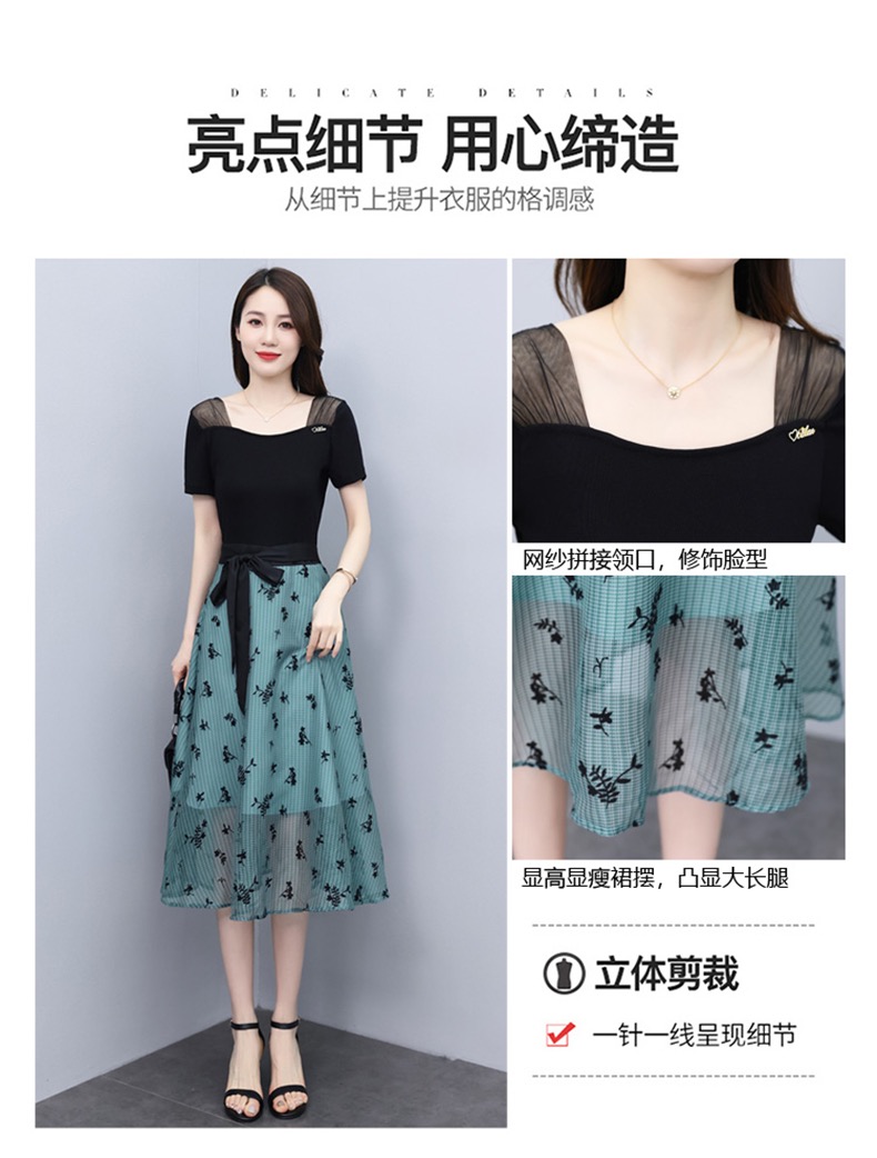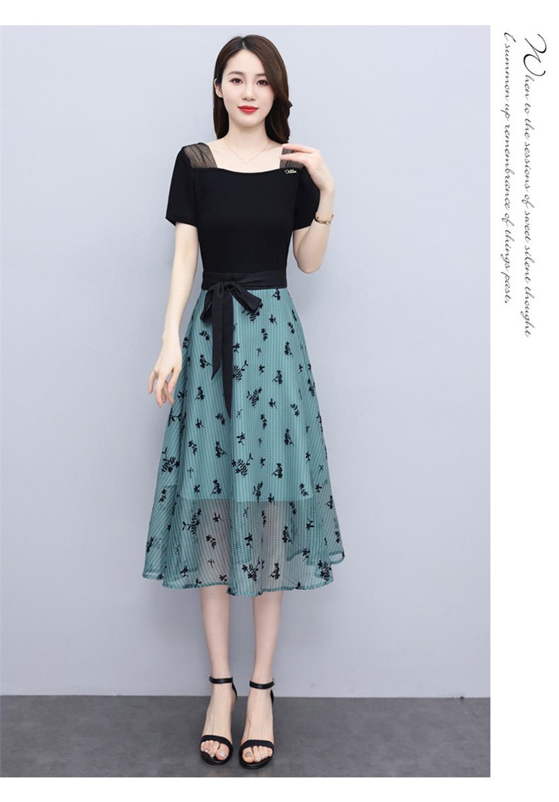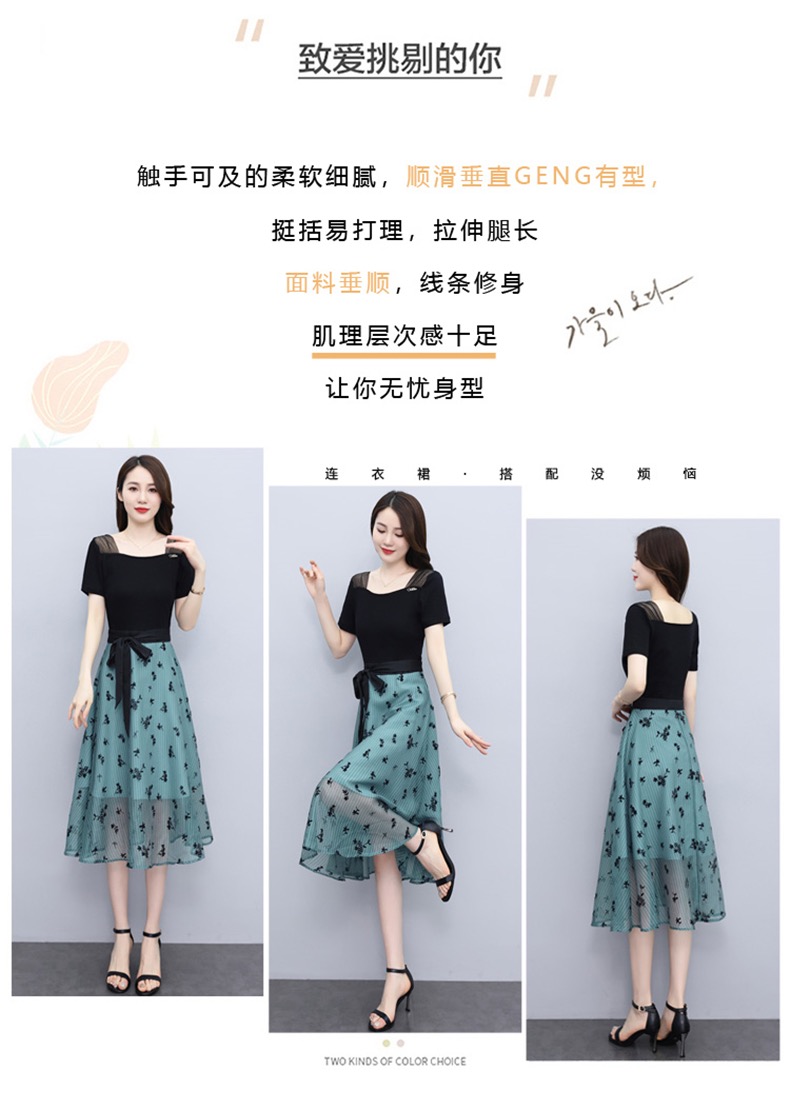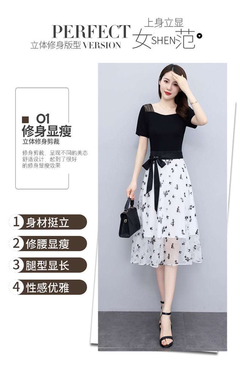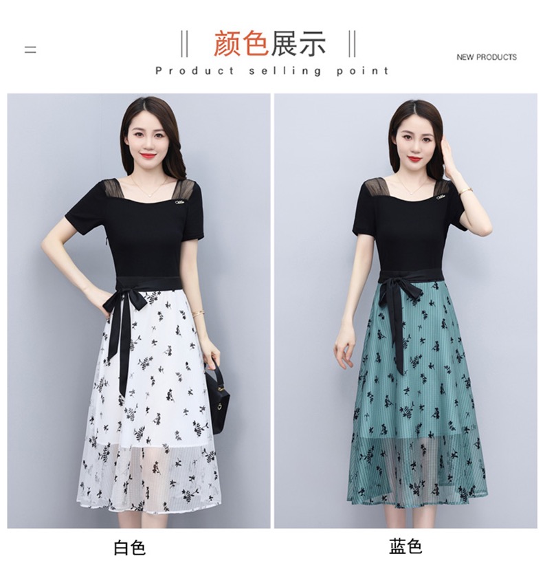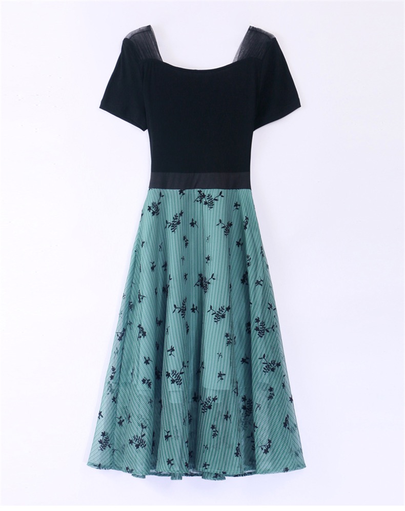 RY2971# 实拍方领印花连衣裙女夏装2026年新款收腰系带拼接过膝通勤a字裙