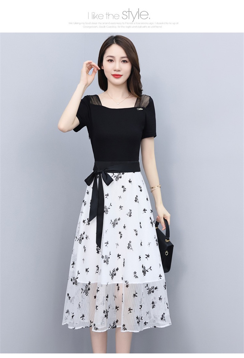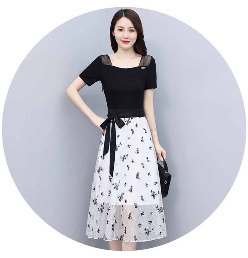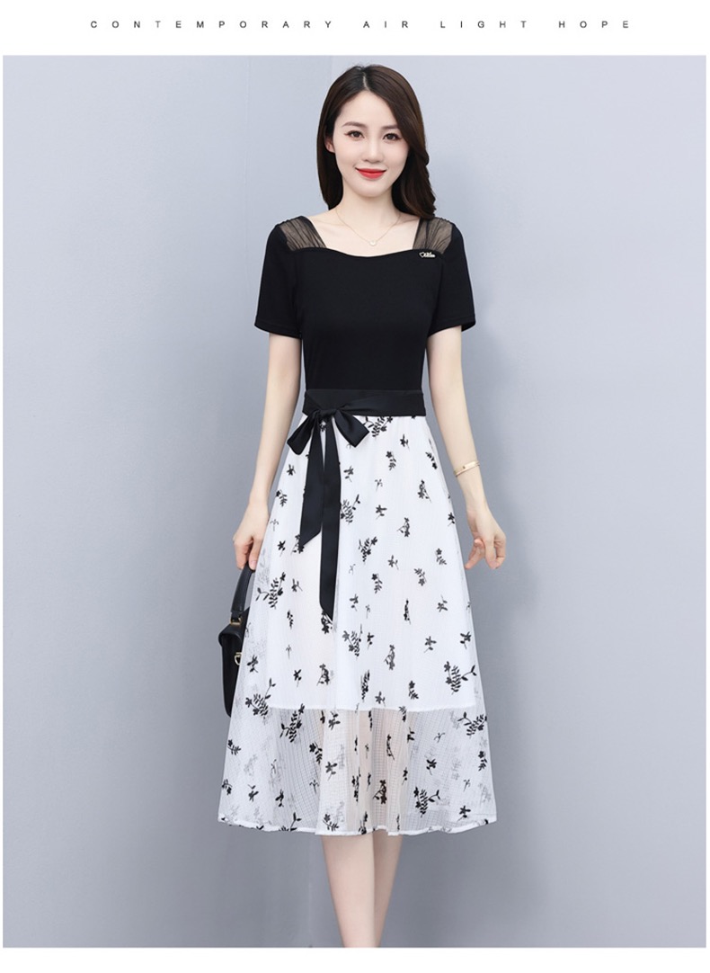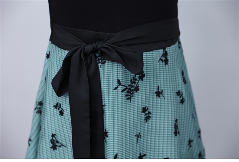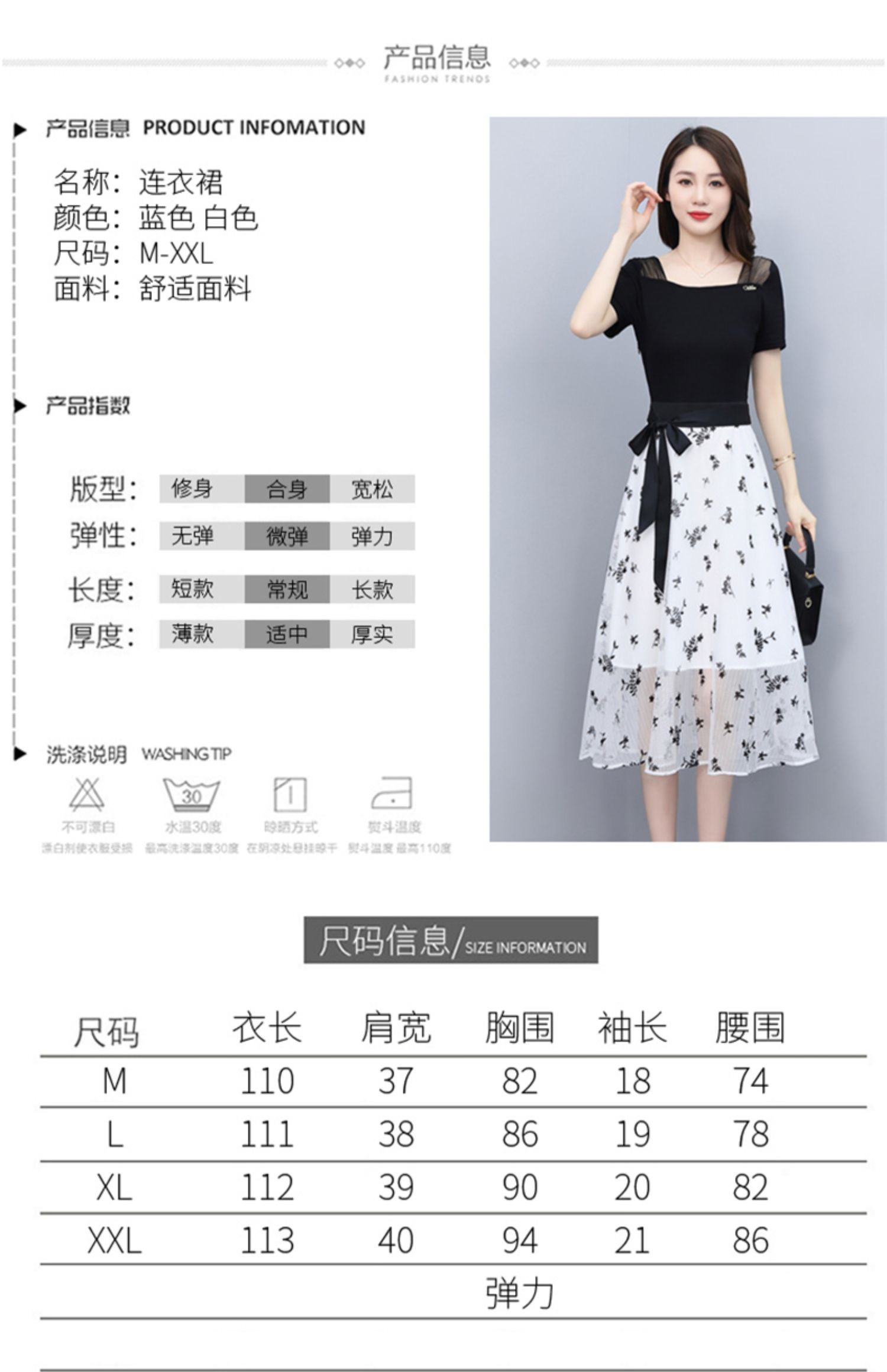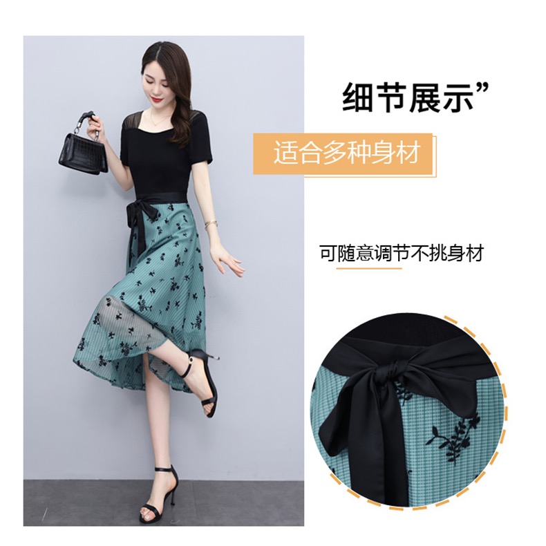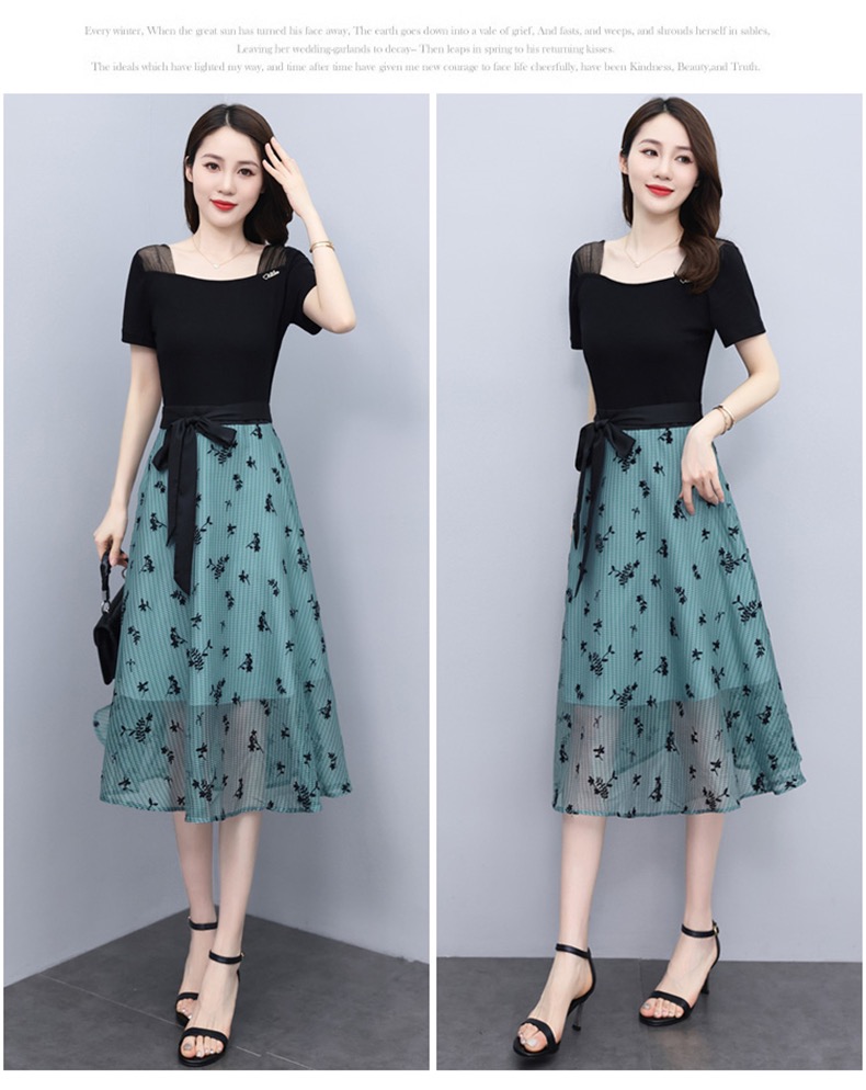 RY2971# 实拍方领印花连衣裙女夏装2026年新款收腰系带拼接过膝通勤a字裙