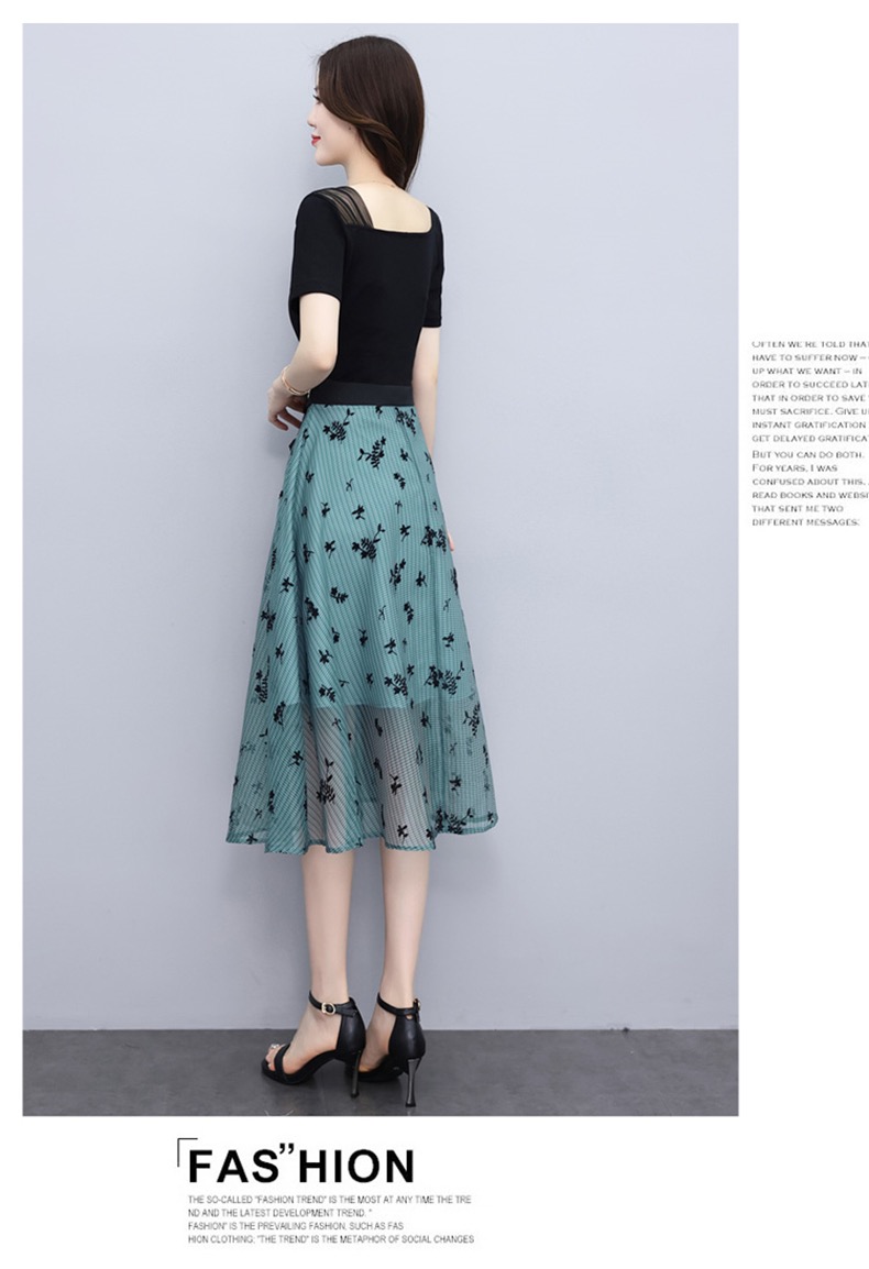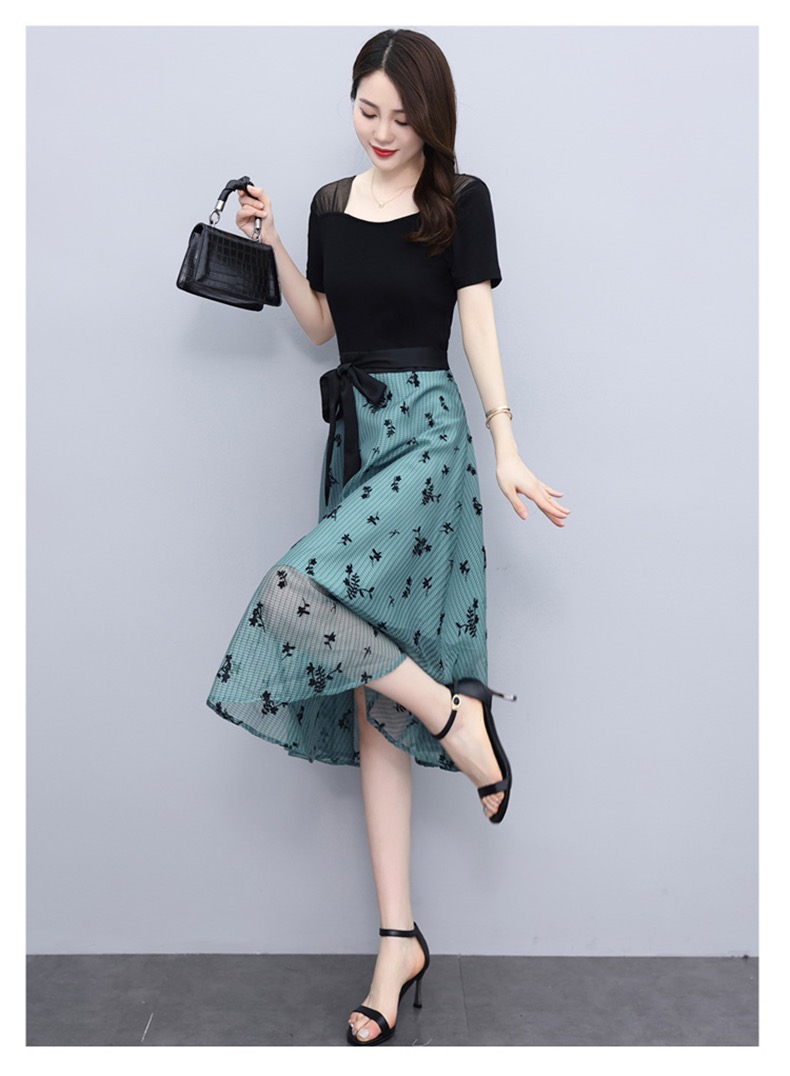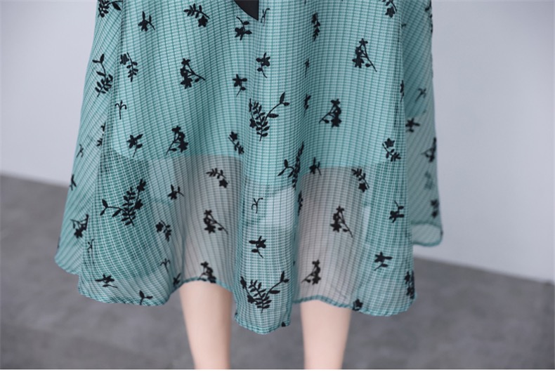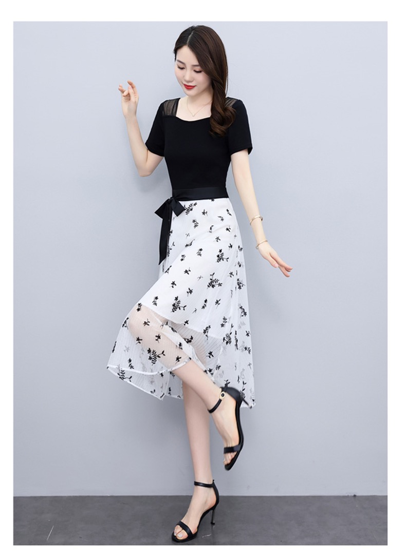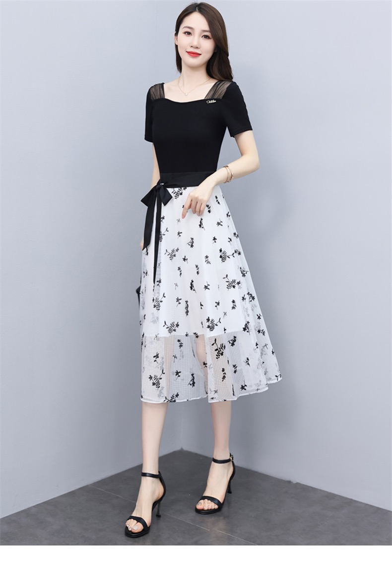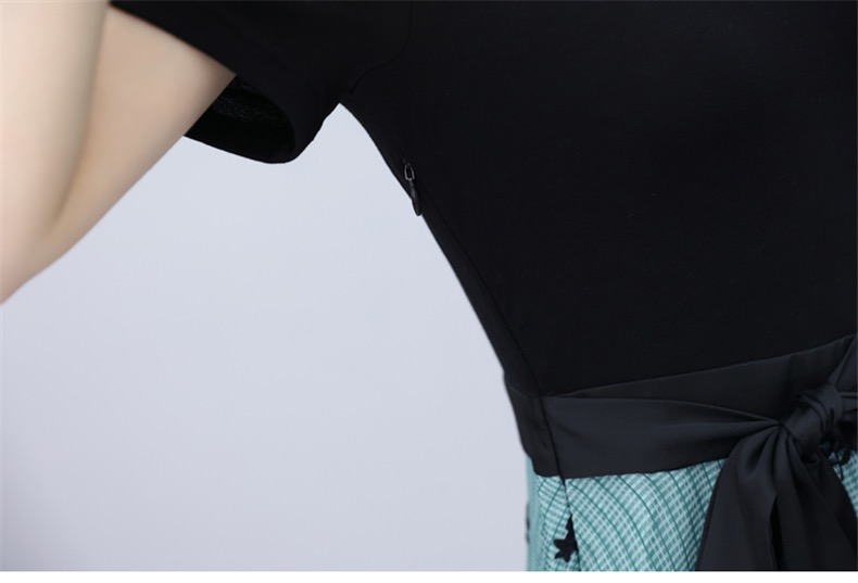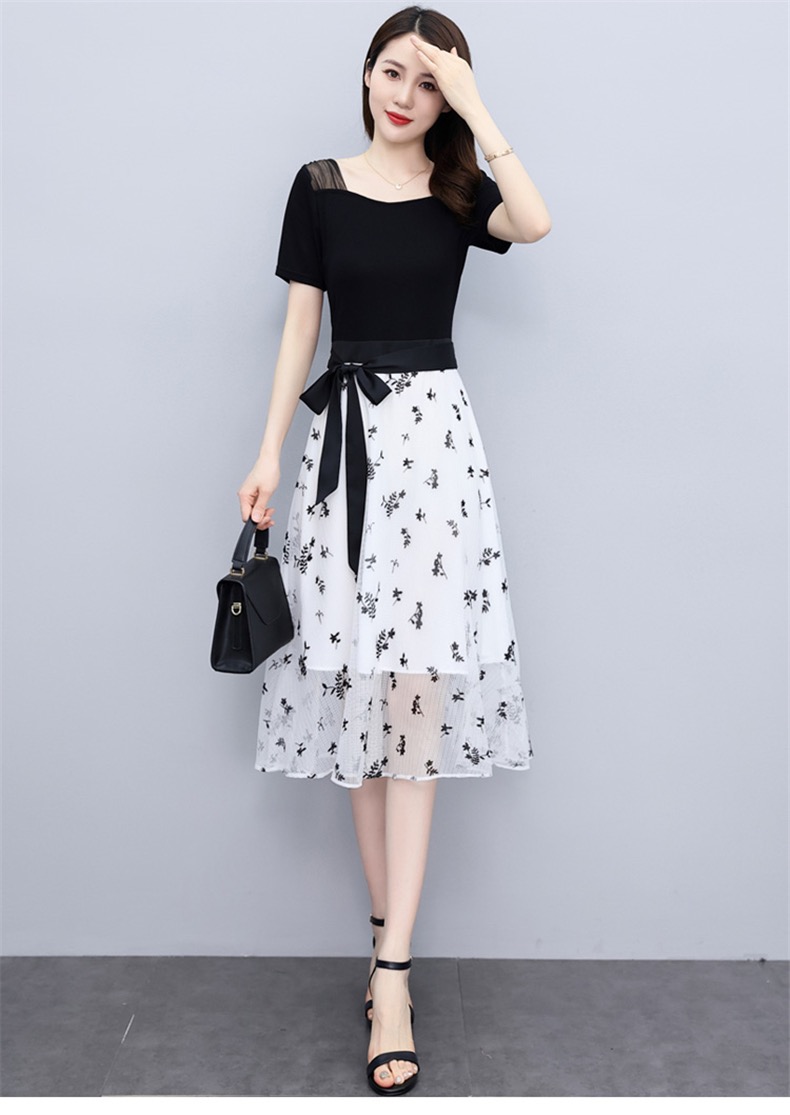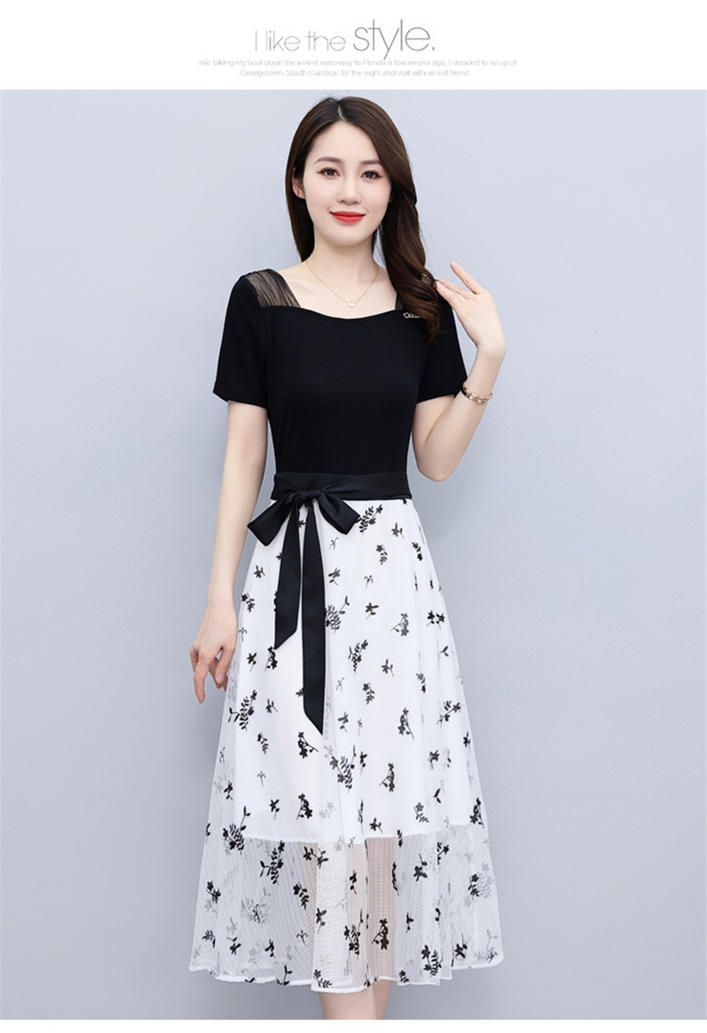 RY2971# 实拍方领印花连衣裙女夏装2026年新款收腰系带拼接过膝通勤a字裙