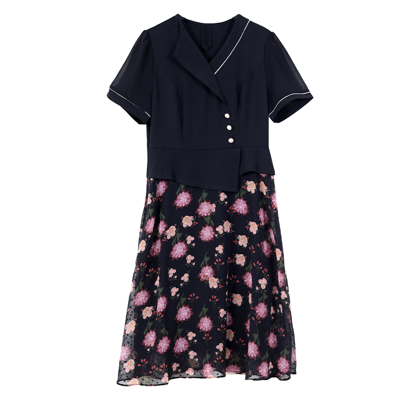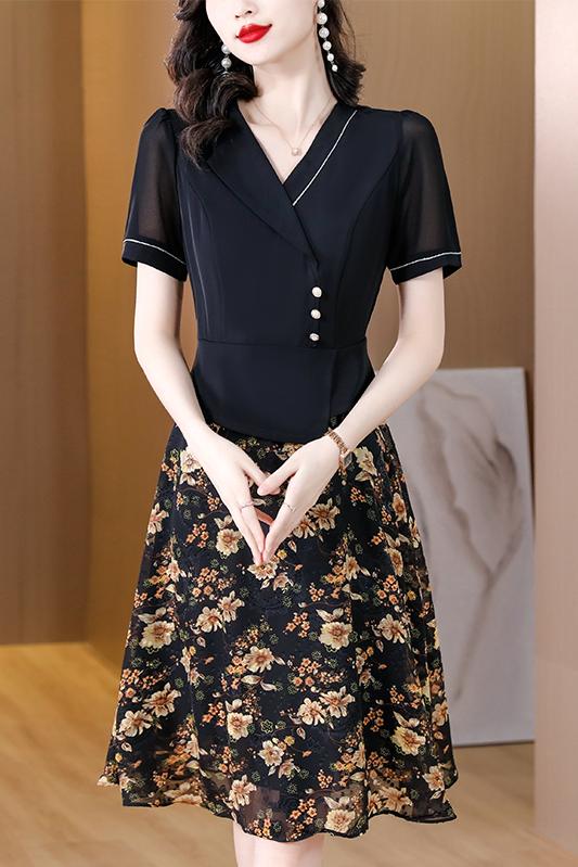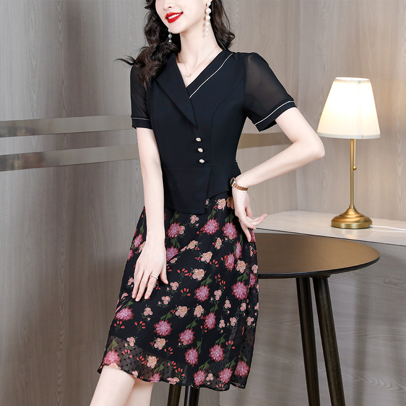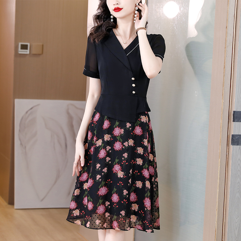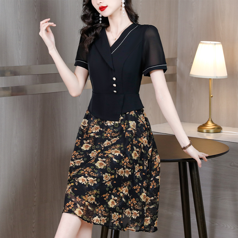 RY2986# 实拍有货 2026夏季新款短袖连衣裙雪纺拼接裙子洋气收腰大摆洋气