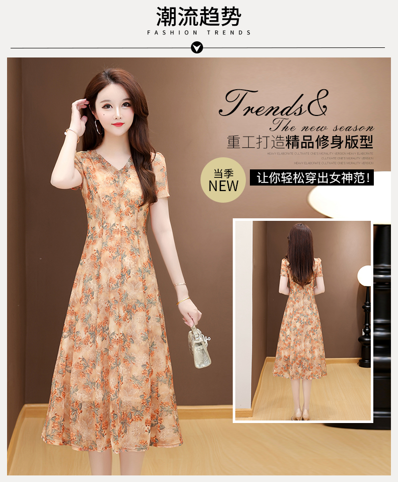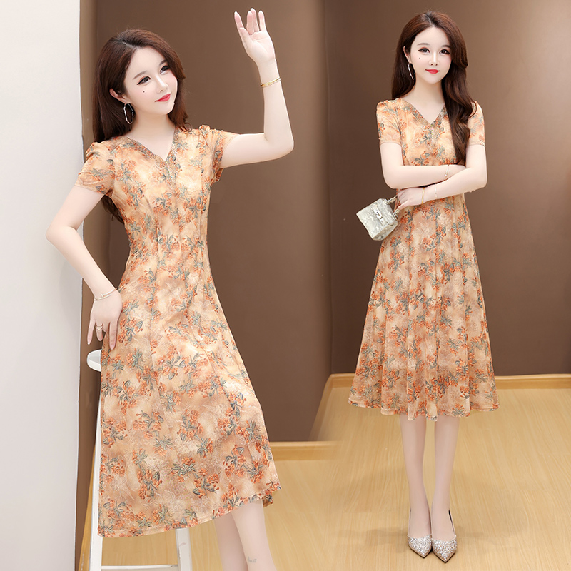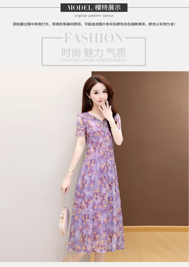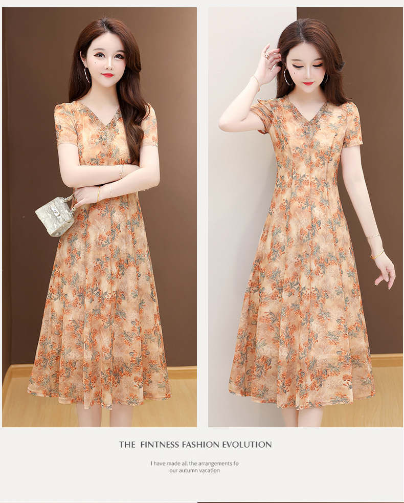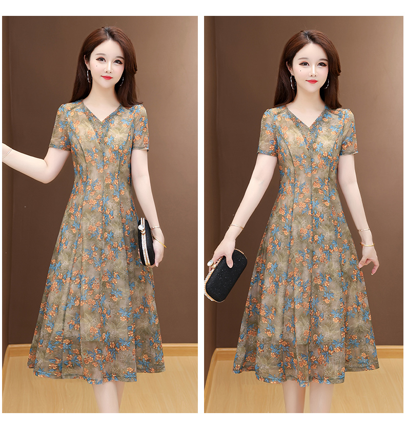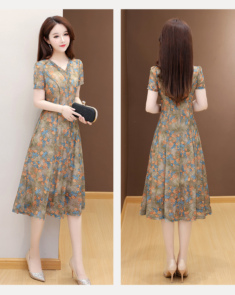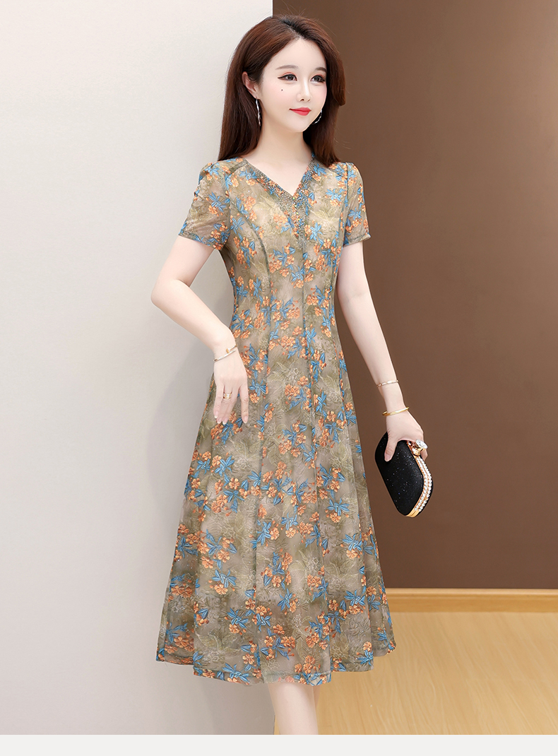 RY2990# 实拍有货 2026夏季新款短袖大码连衣裙印花网纱中长过膝收腰显瘦
