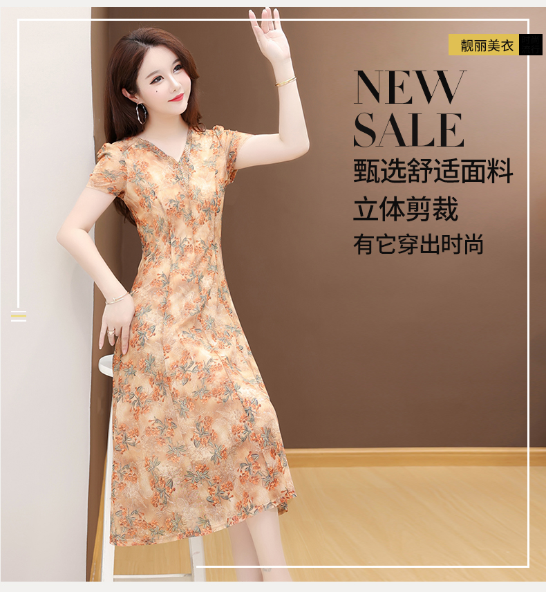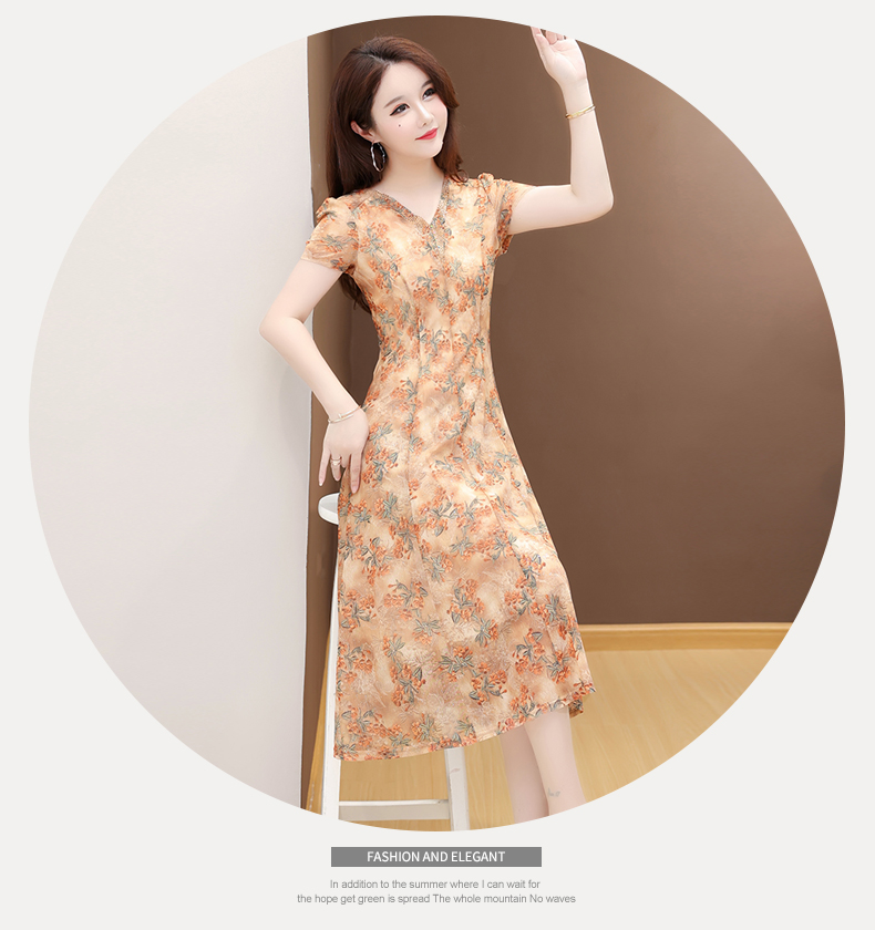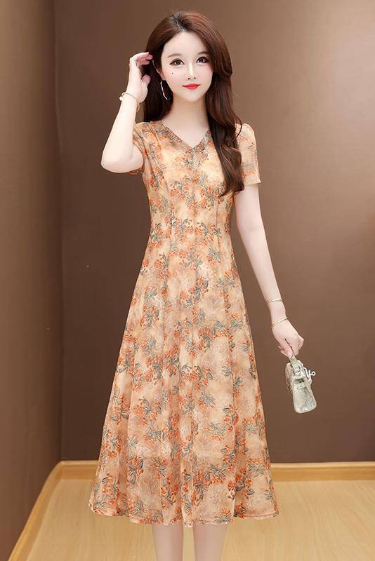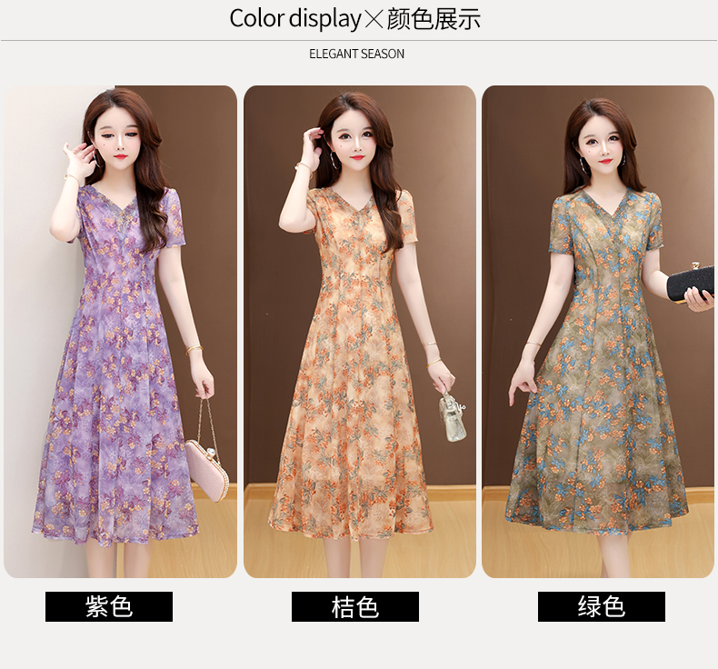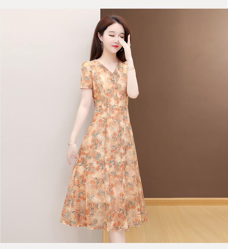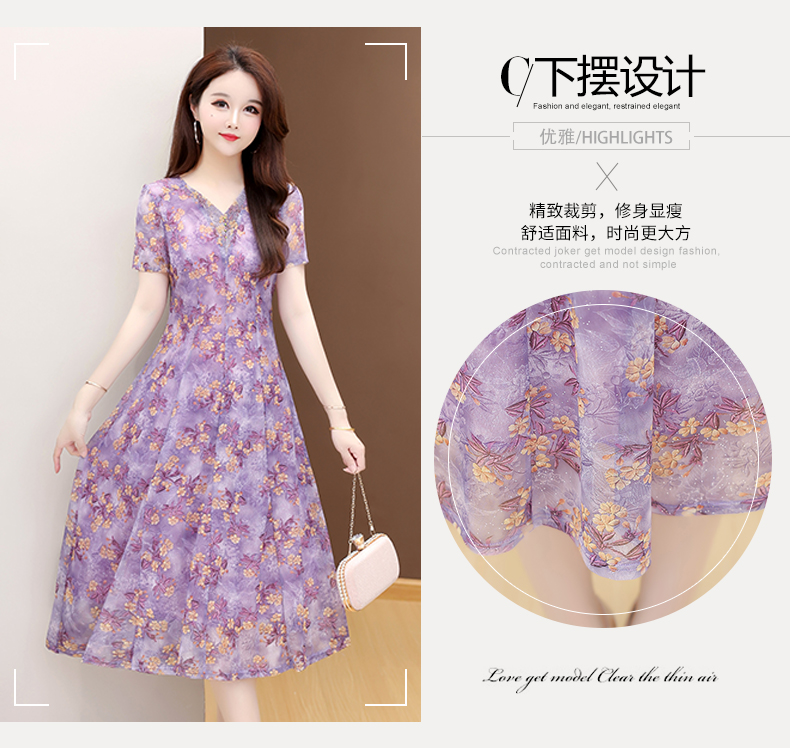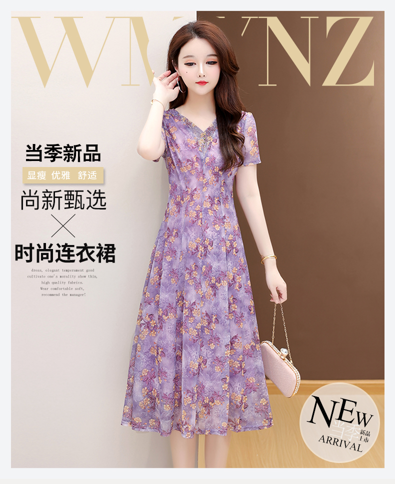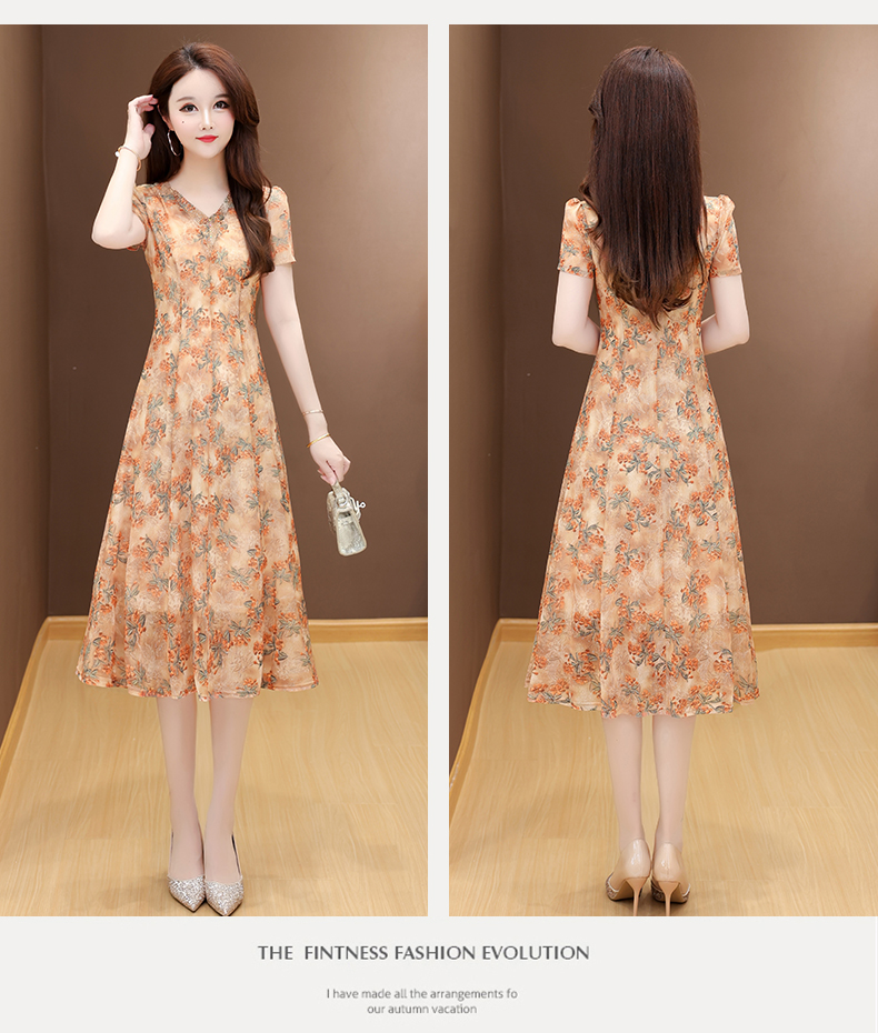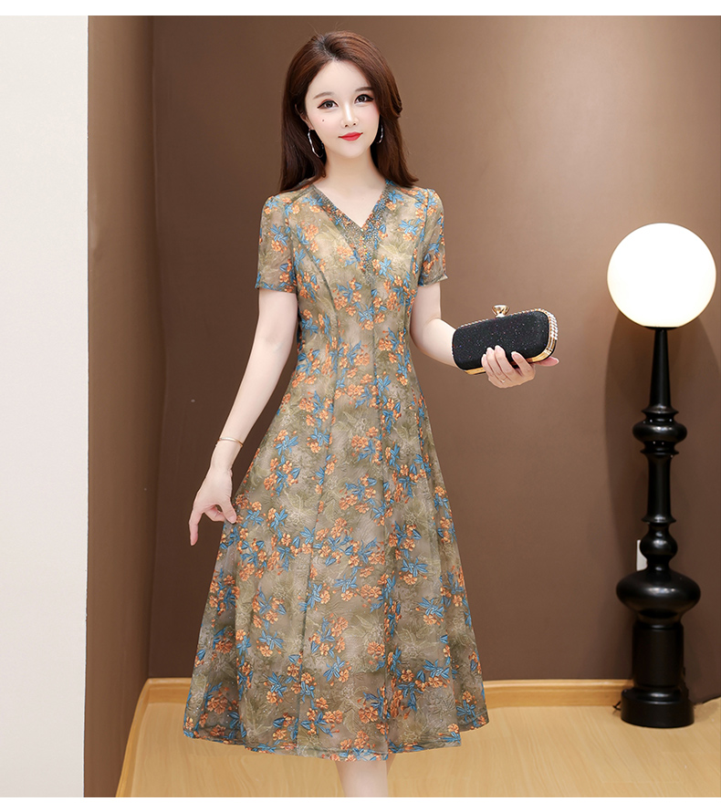 RY2990# 实拍有货 2026夏季新款短袖大码连衣裙印花网纱中长过膝收腰显瘦