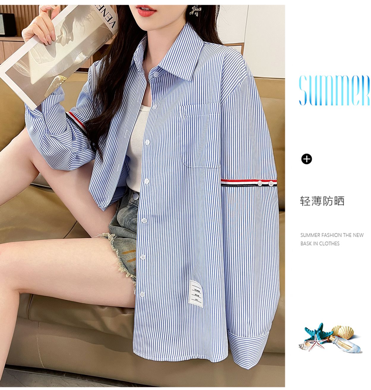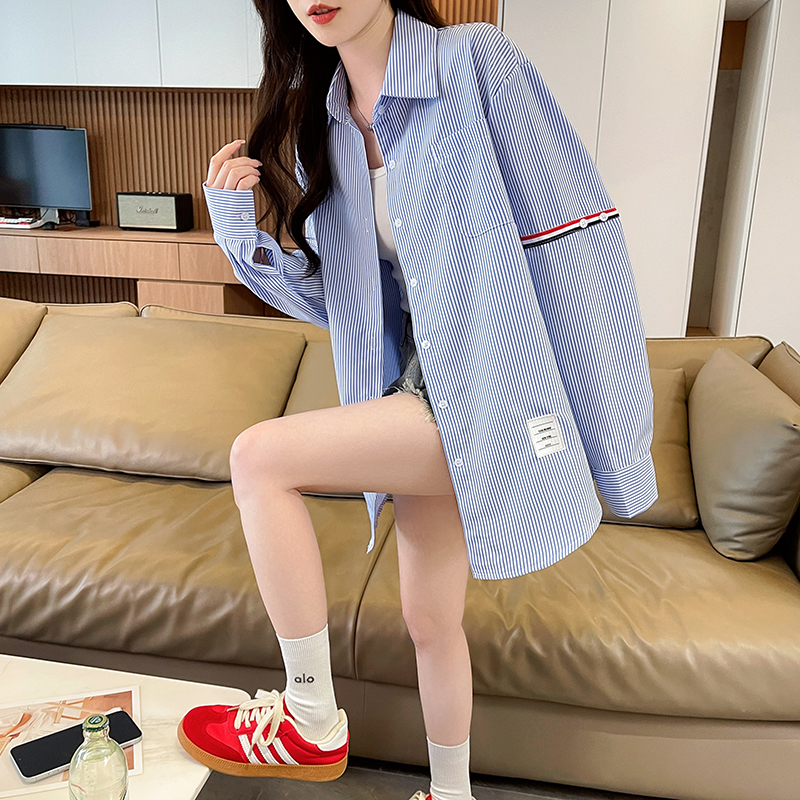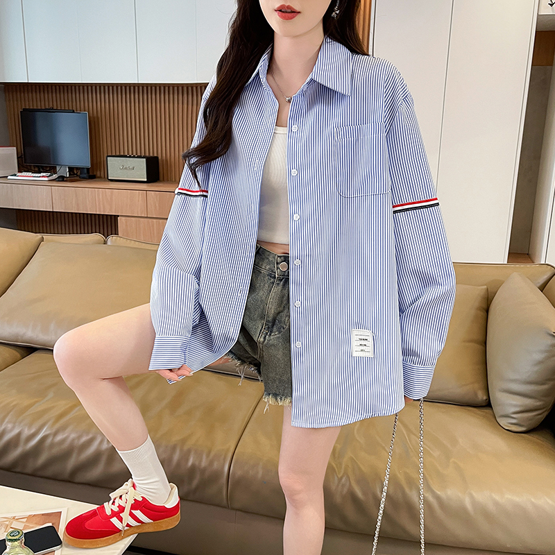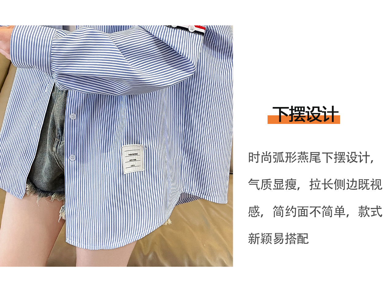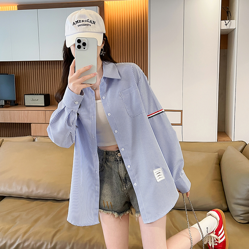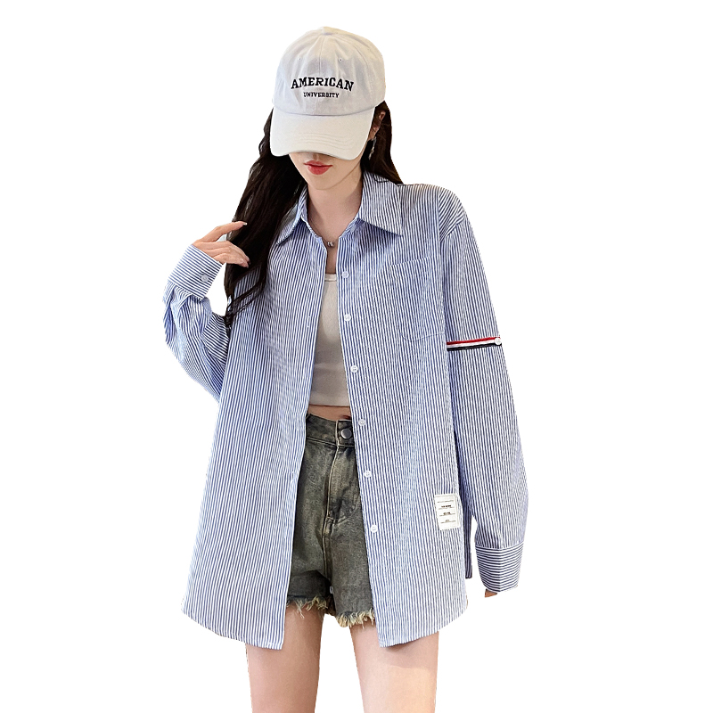 RY3014# 实拍2026韩系条纹长袖衬衫女夏季薄款防晒宽松慵懒风通勤百搭衬衣
