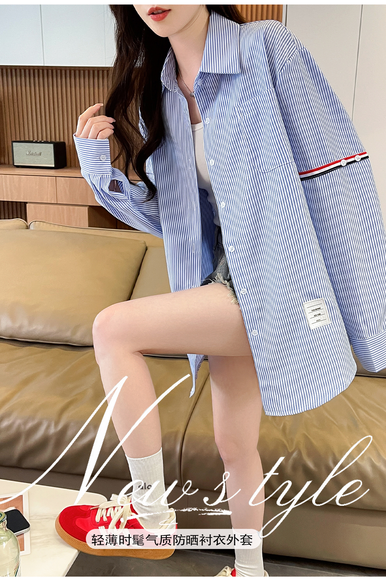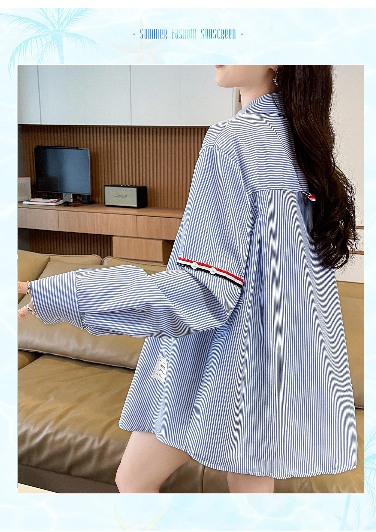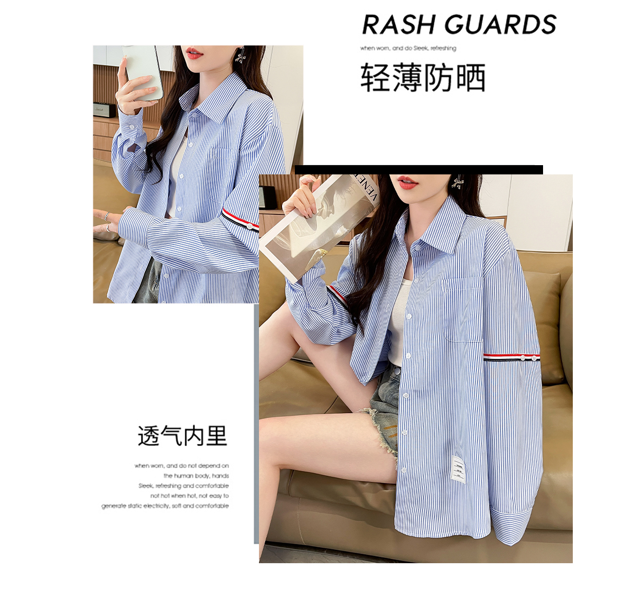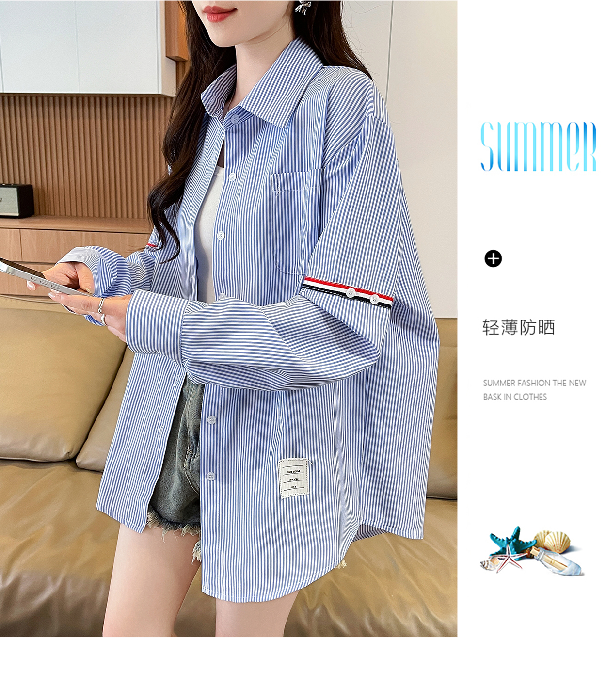 RY3014# 实拍2026韩系条纹长袖衬衫女夏季薄款防晒宽松慵懒风通勤百搭衬衣