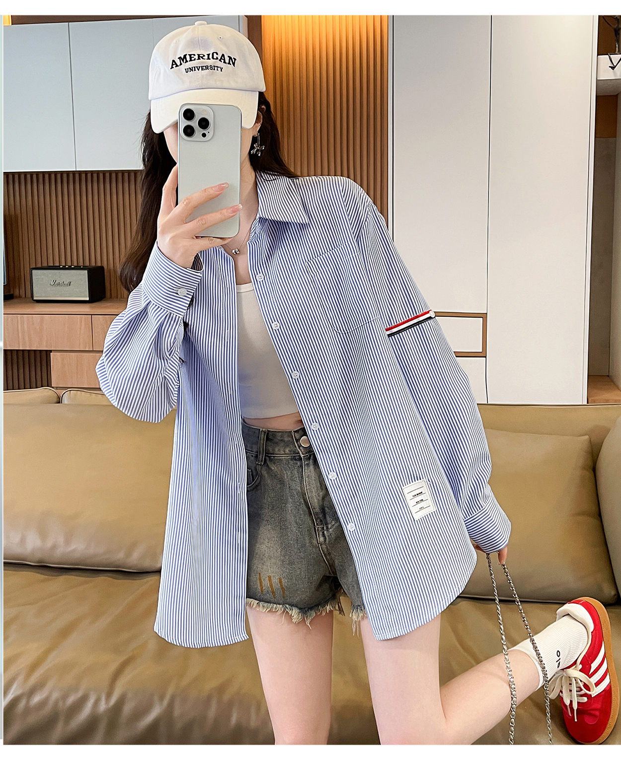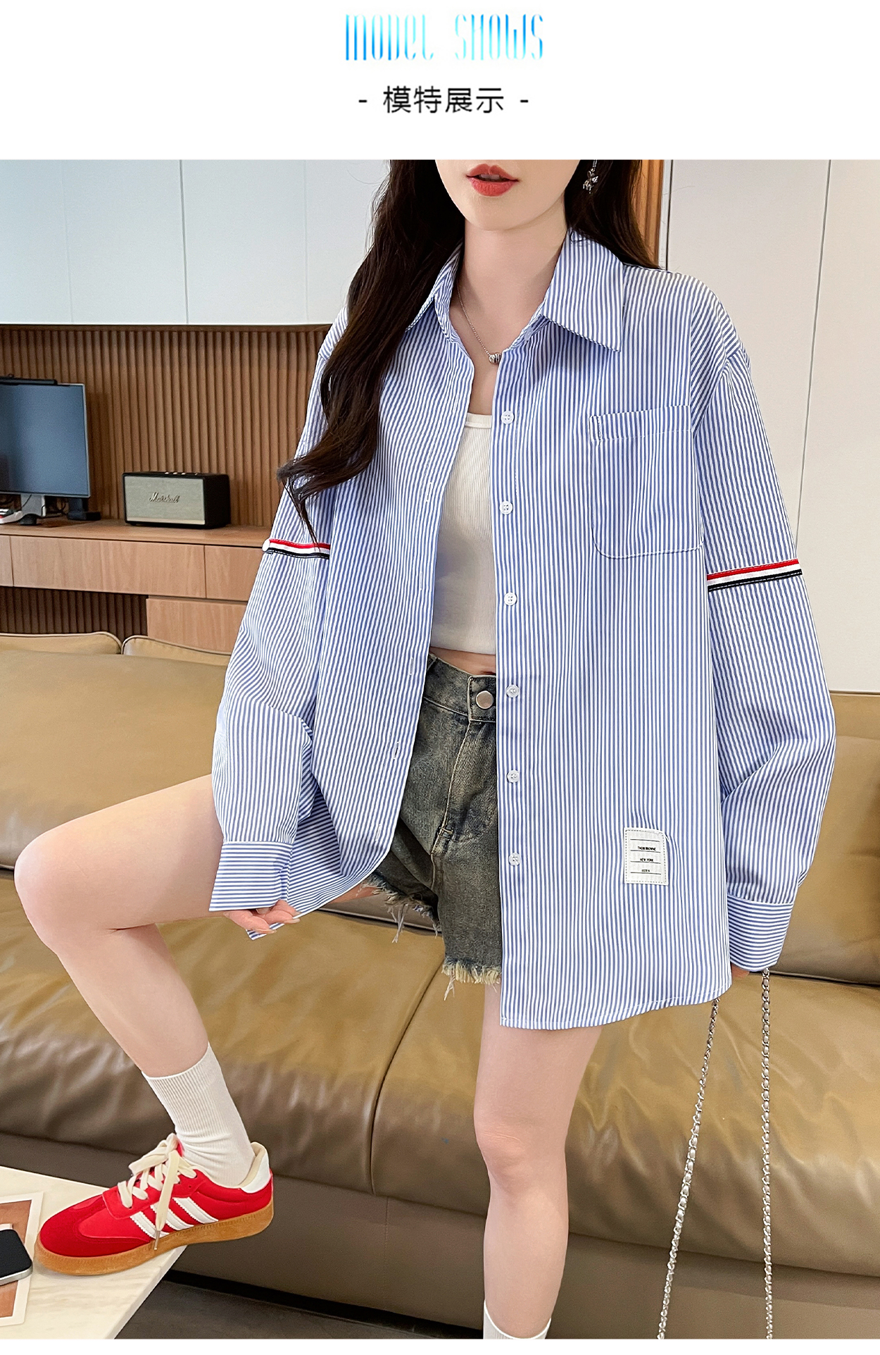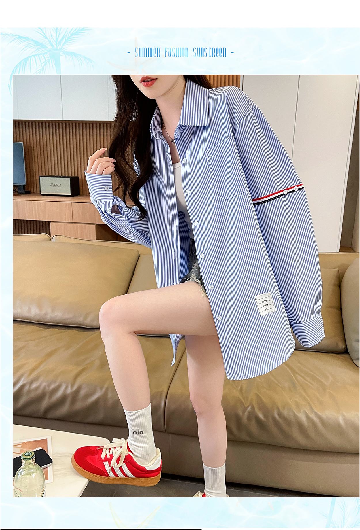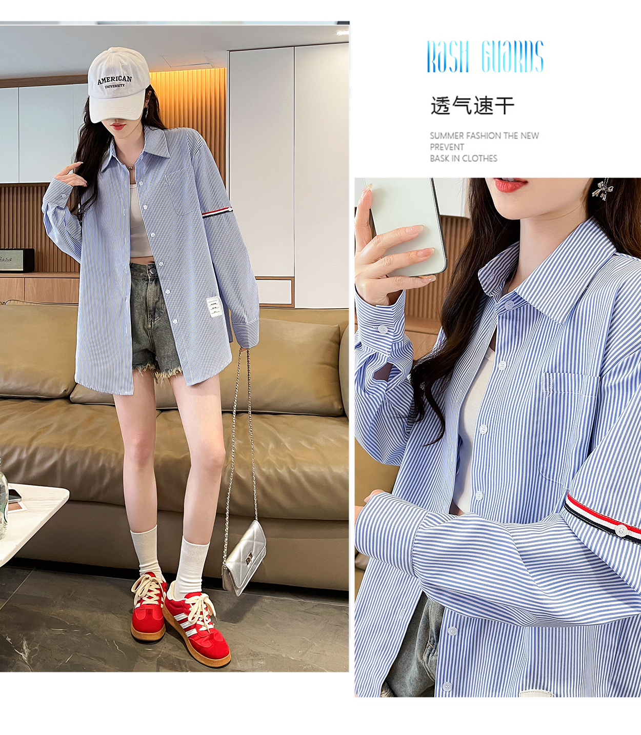 RY3014# 实拍2026韩系条纹长袖衬衫女夏季薄款防晒宽松慵懒风通勤百搭衬衣