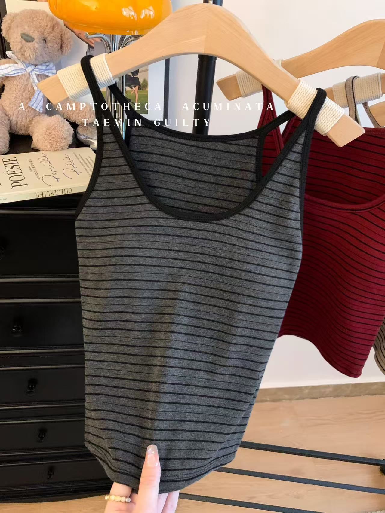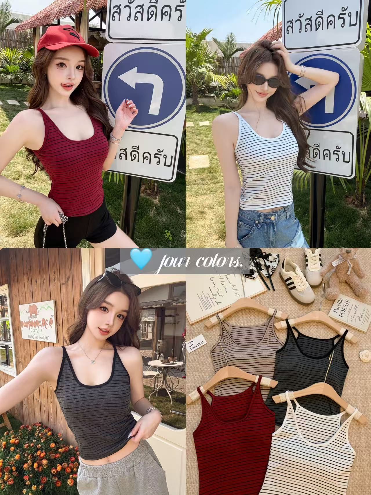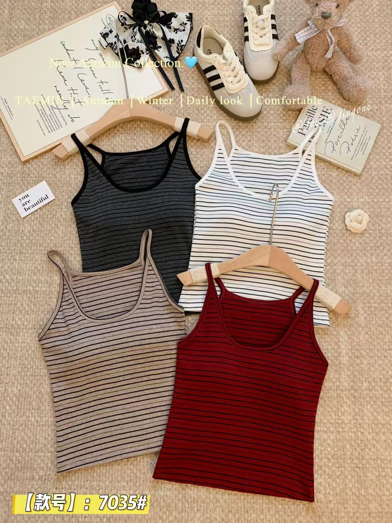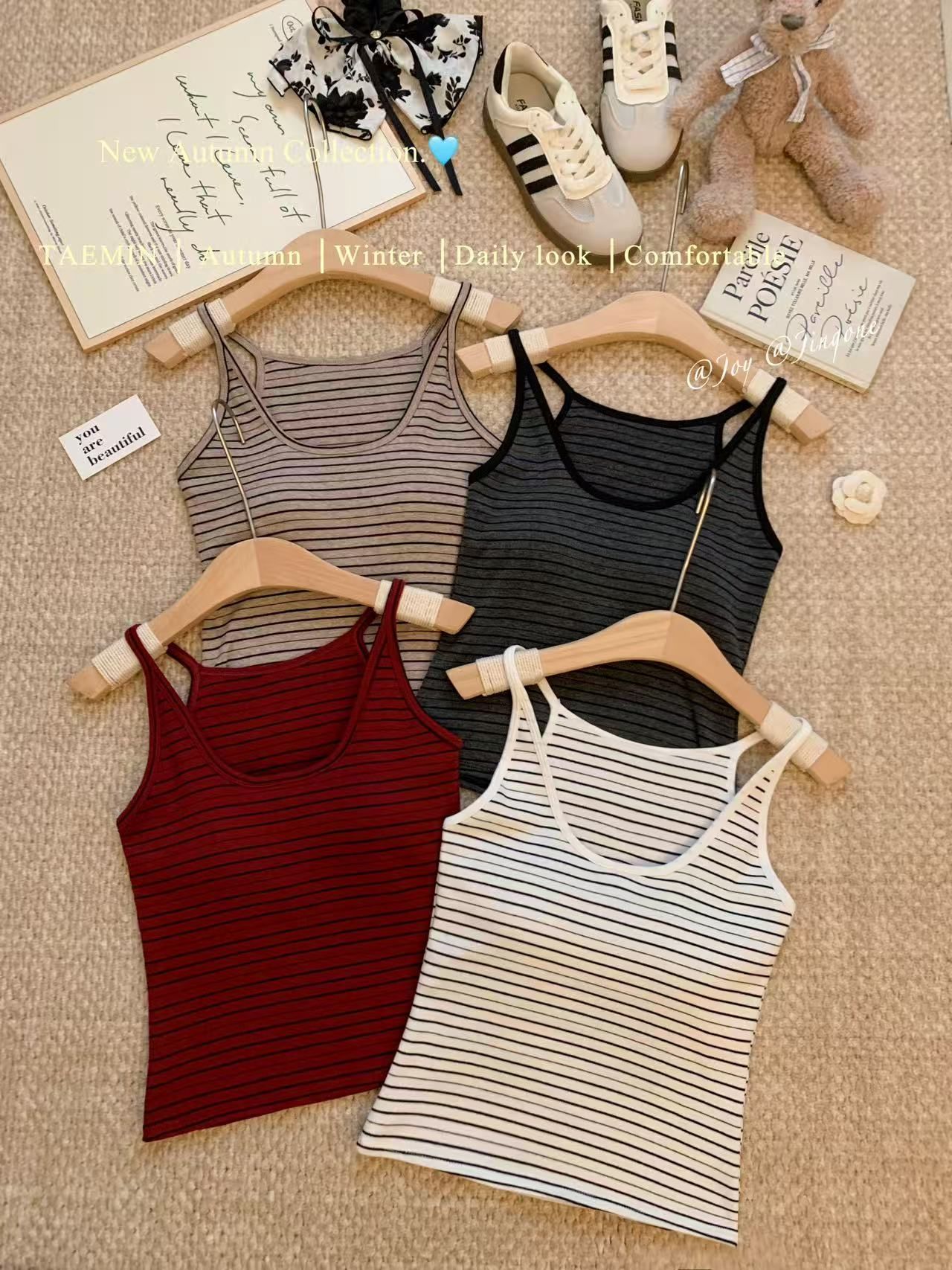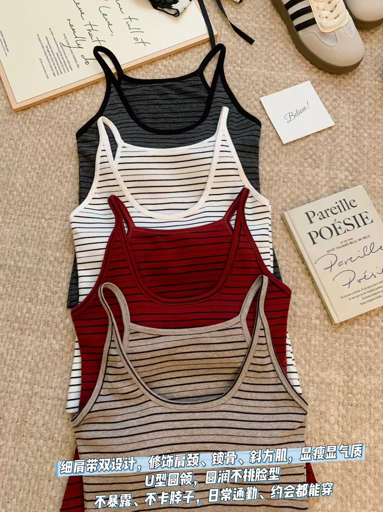 RY3219# 带胸垫 辣妹风U领条纹挂脖背心女夏季外穿内搭修身吊带上衣
