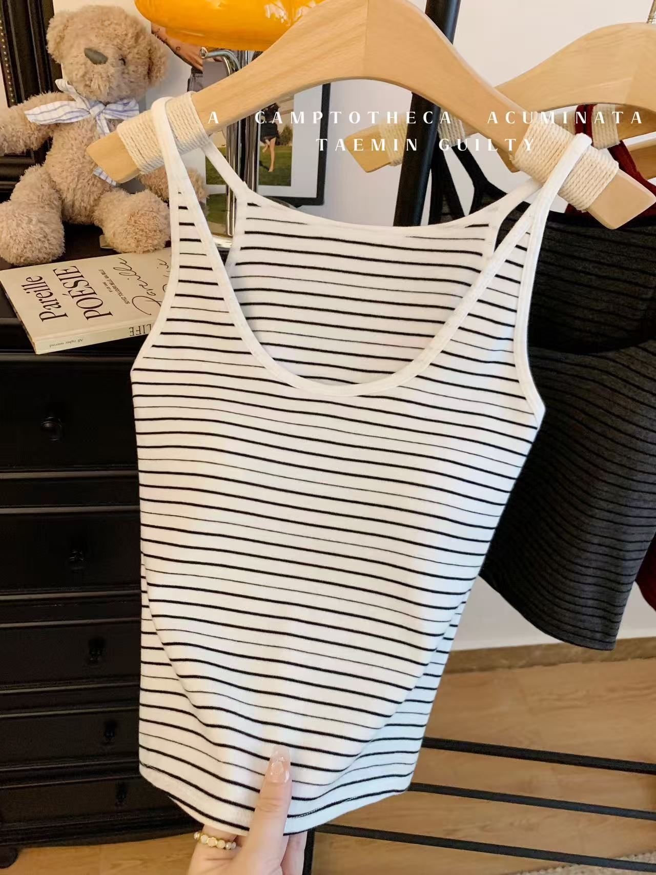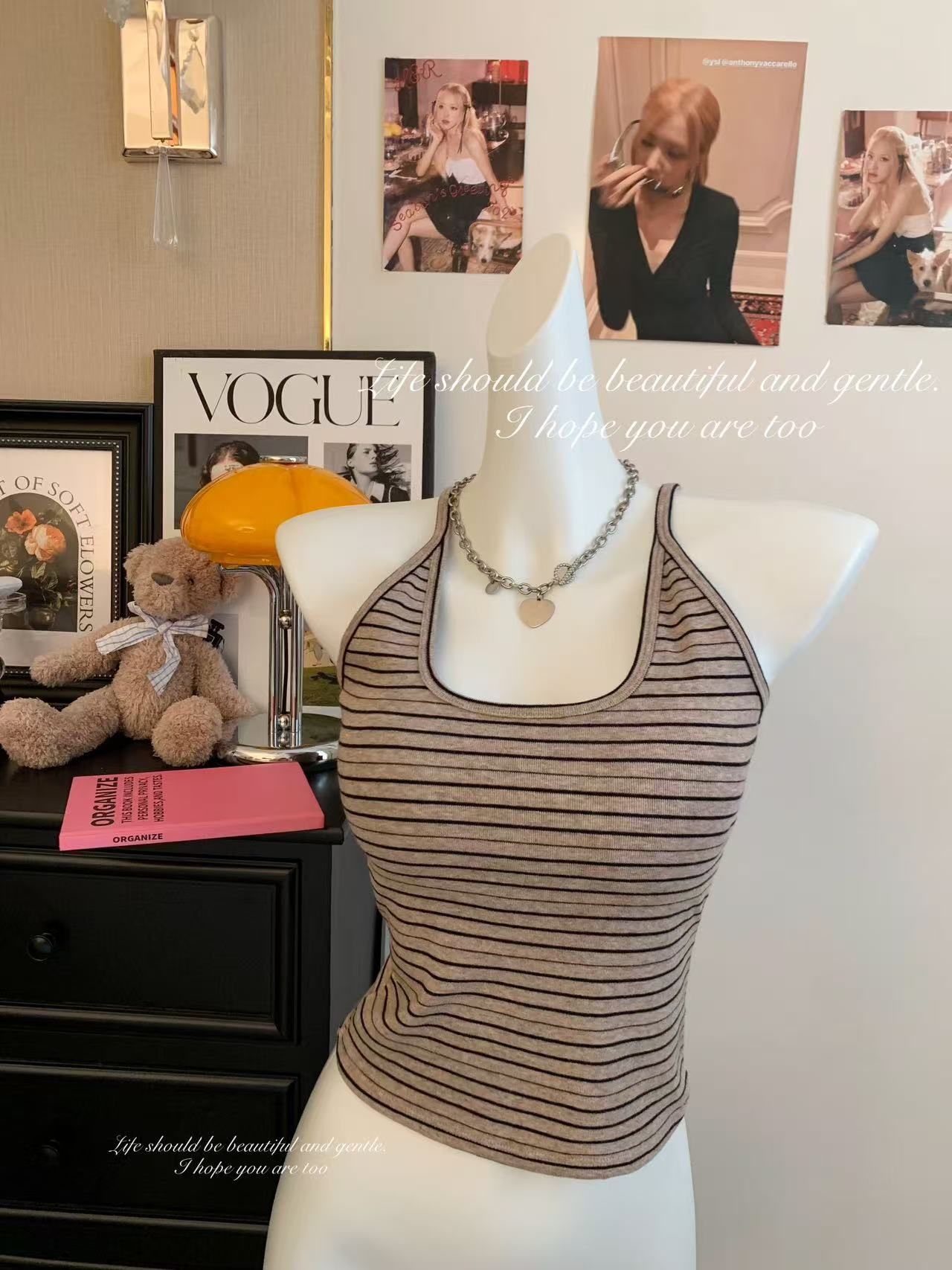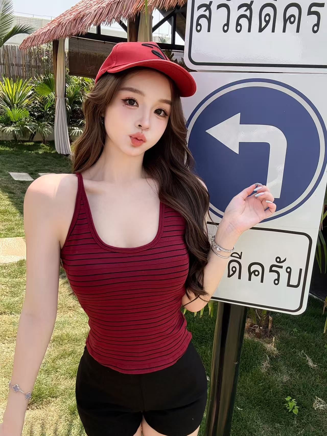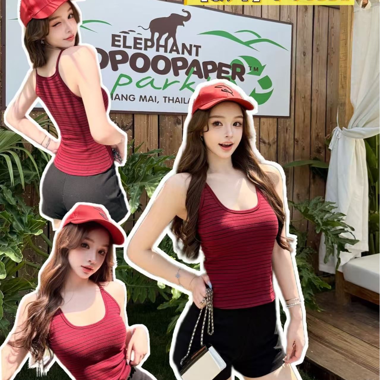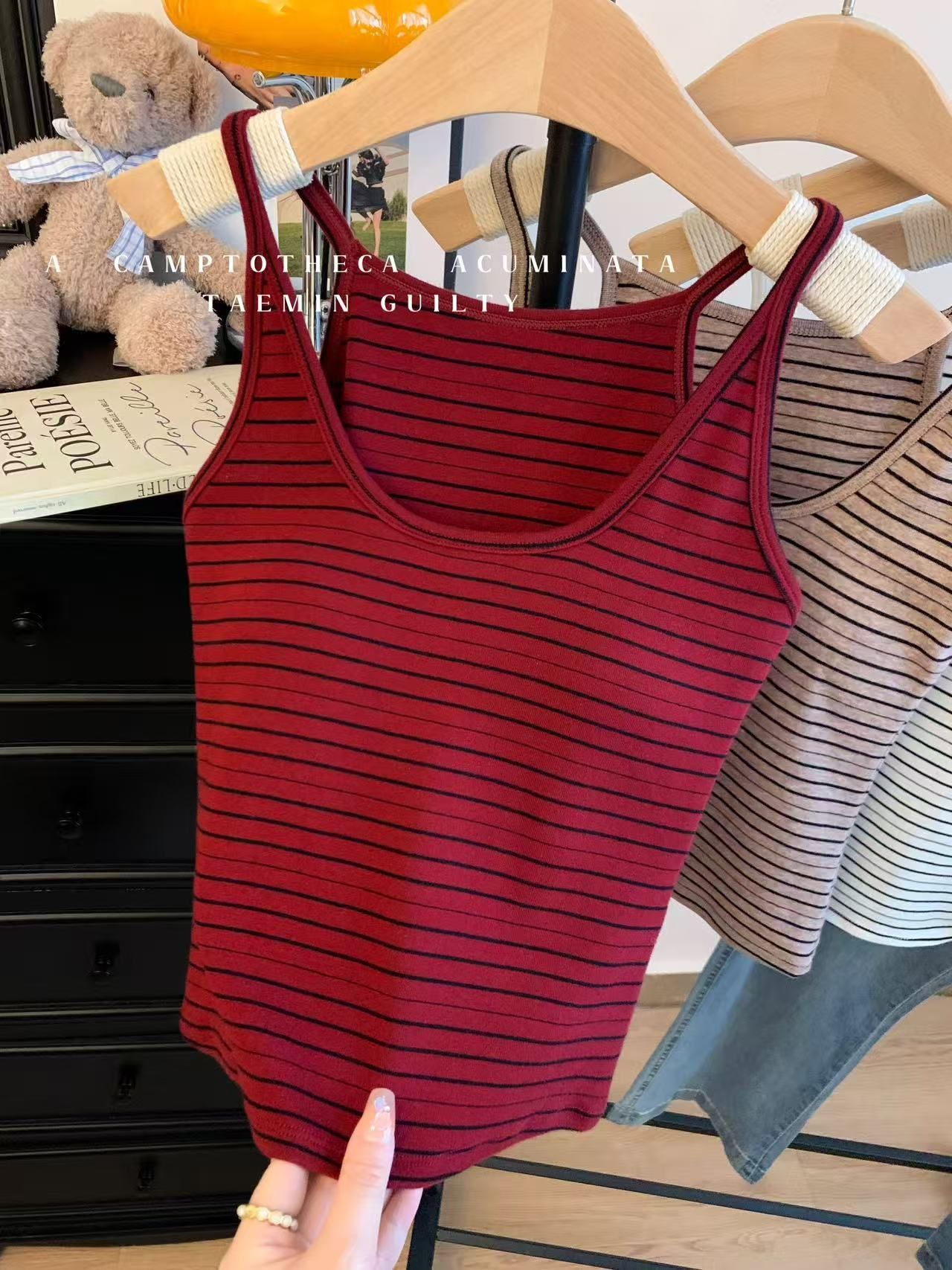 RY3219# 带胸垫 辣妹风U领条纹挂脖背心女夏季外穿内搭修身吊带上衣