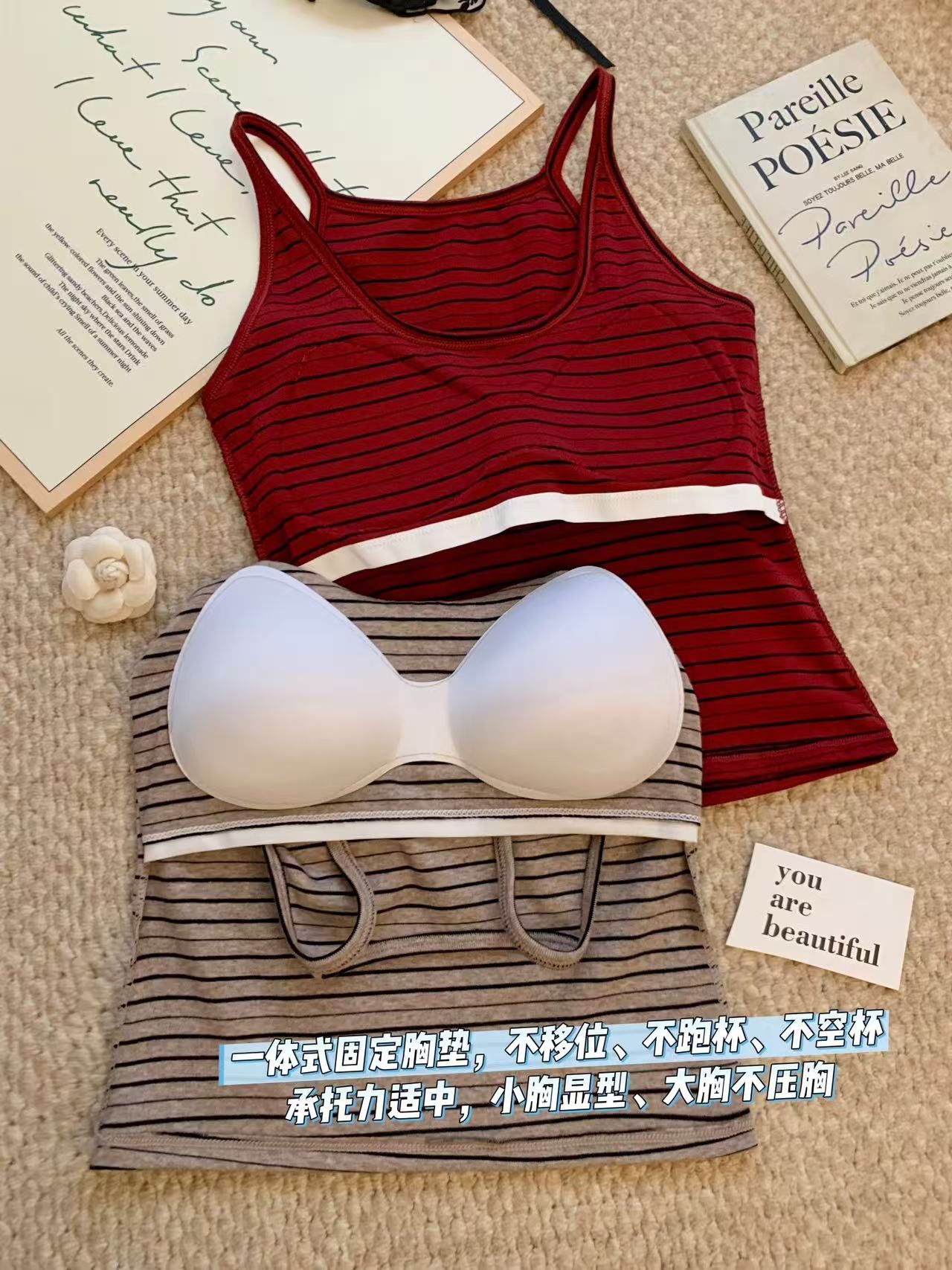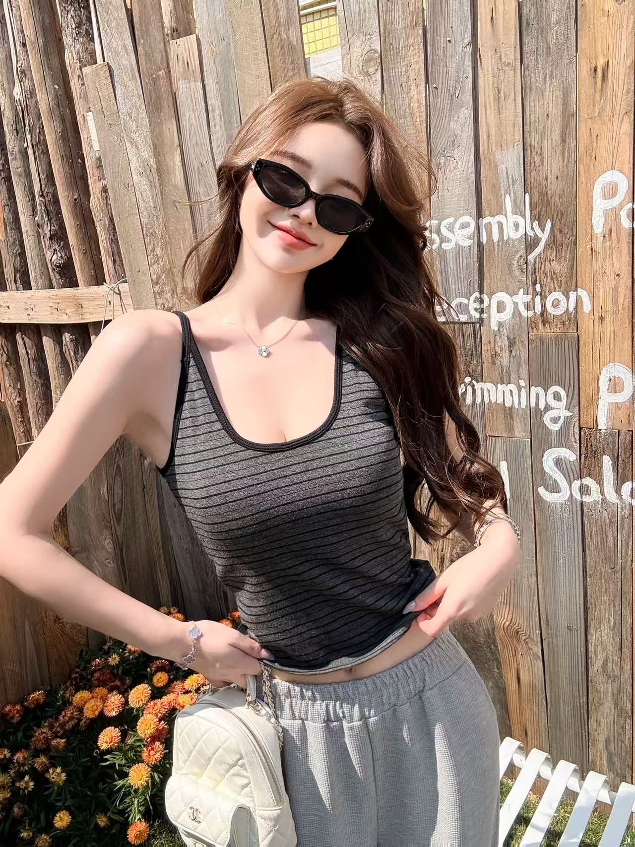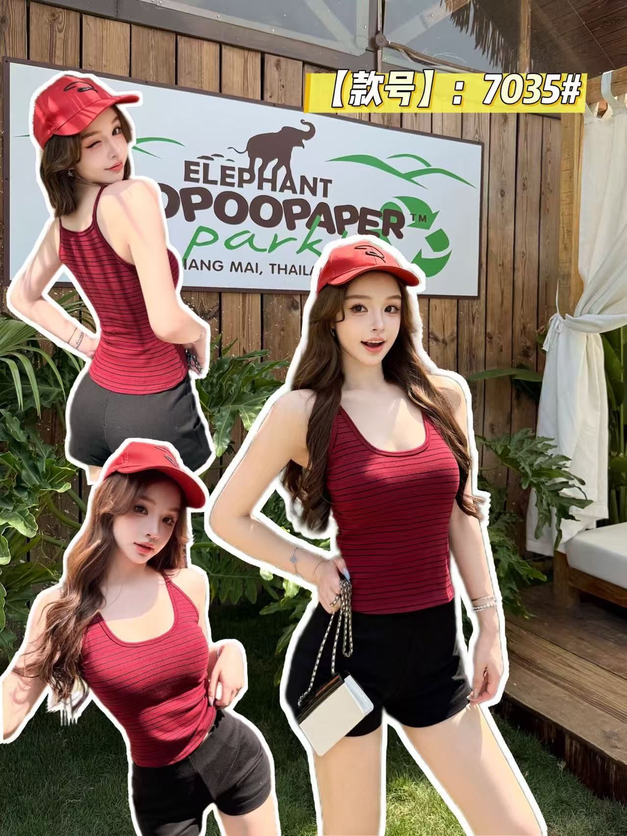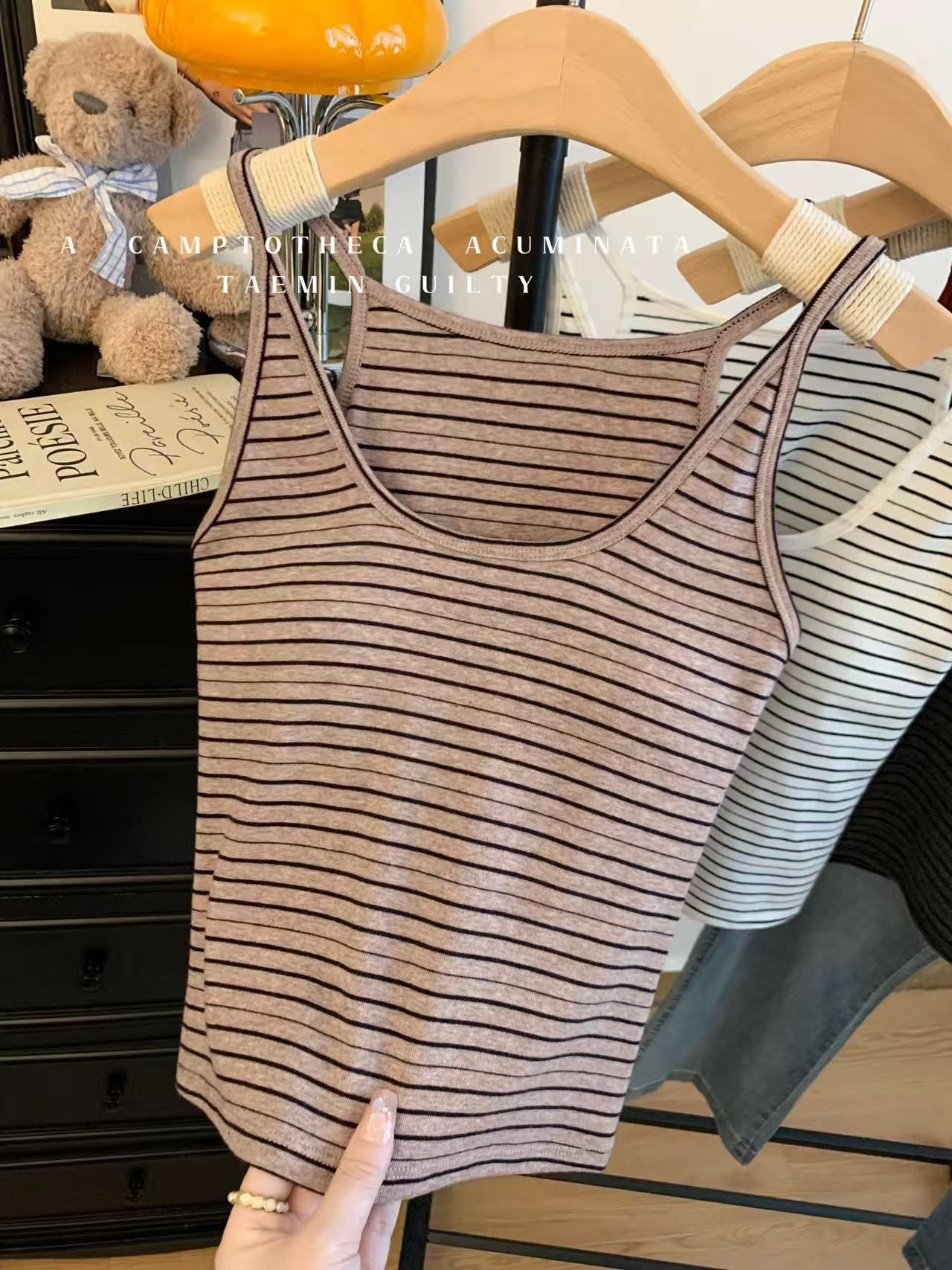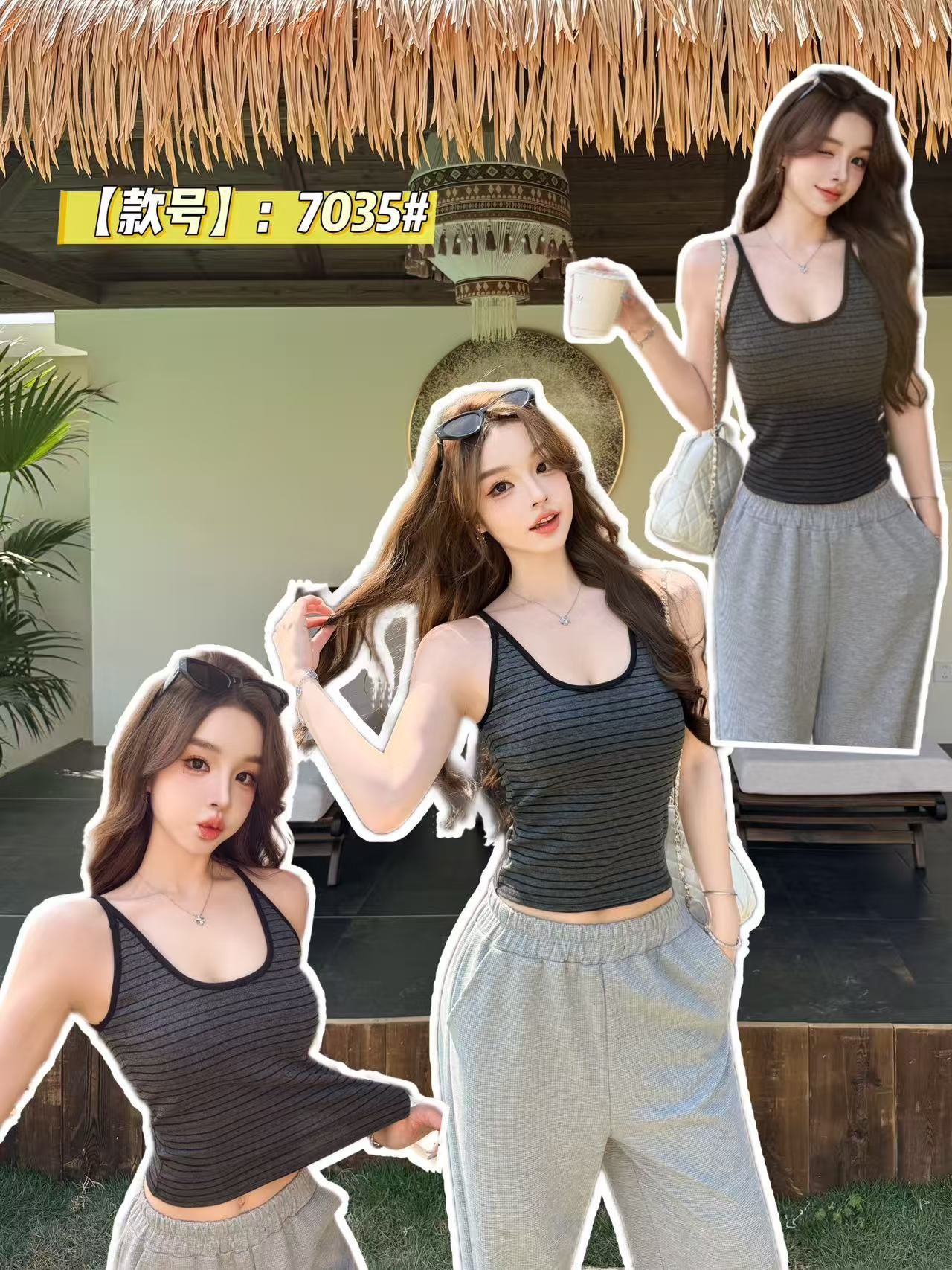 RY3219# 带胸垫 辣妹风U领条纹挂脖背心女夏季外穿内搭修身吊带上衣