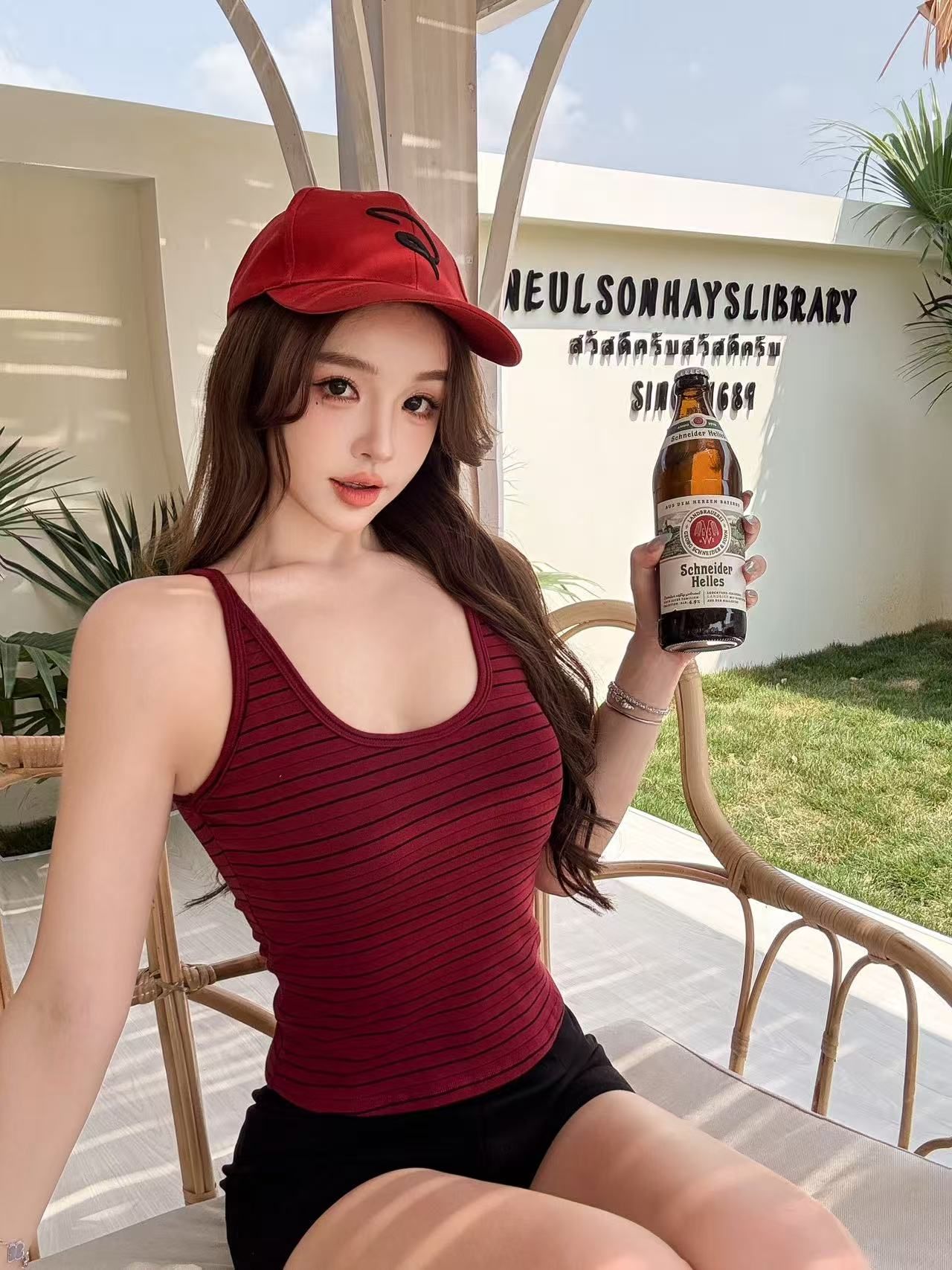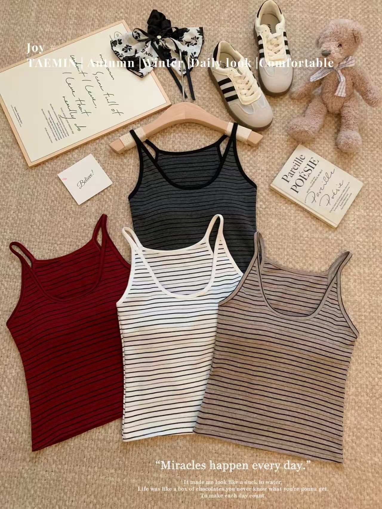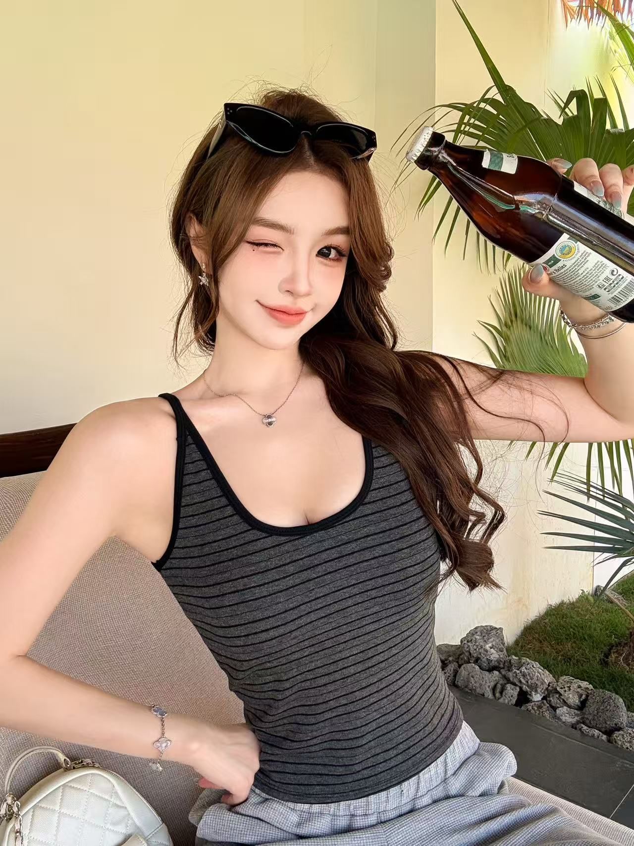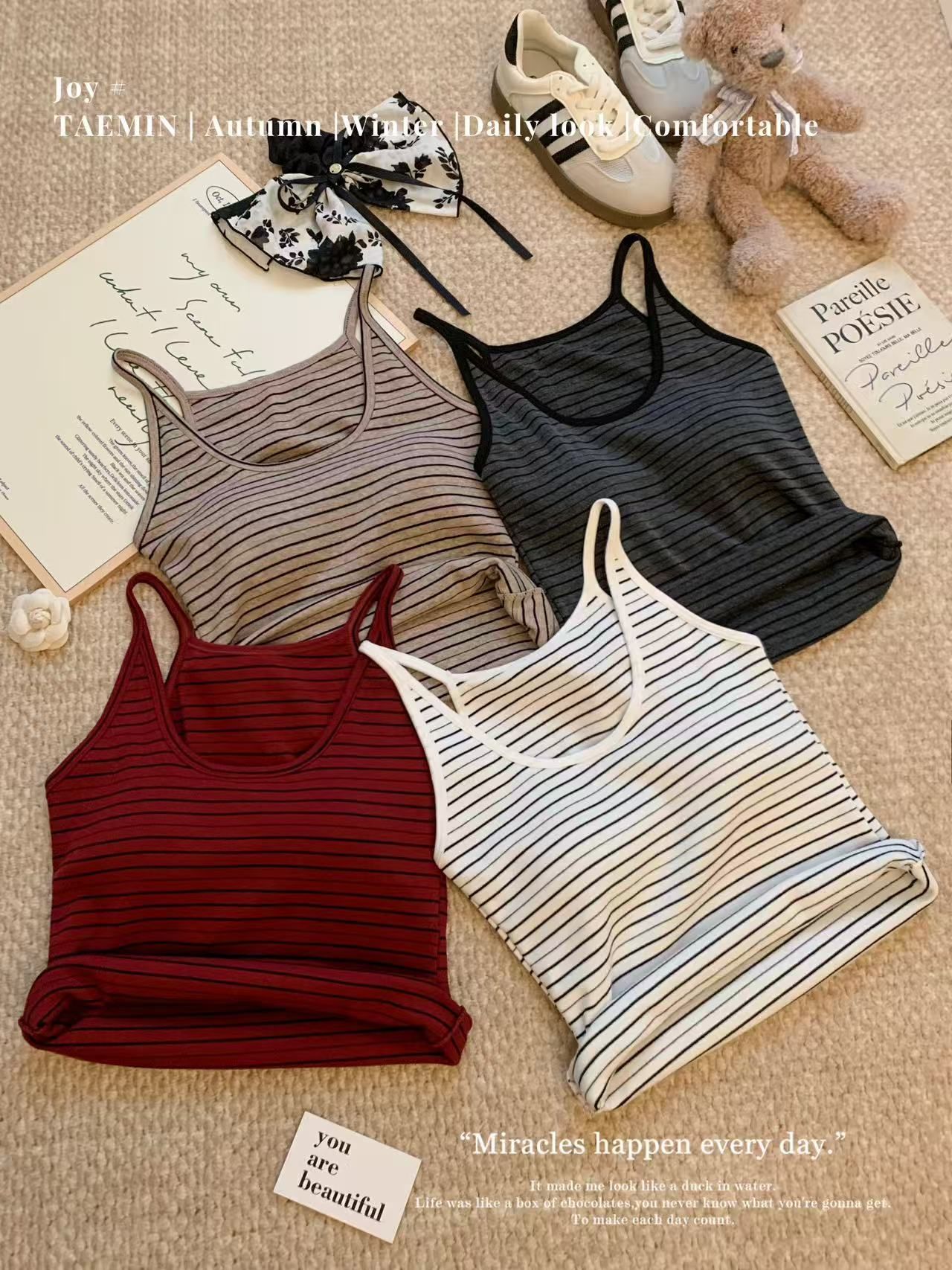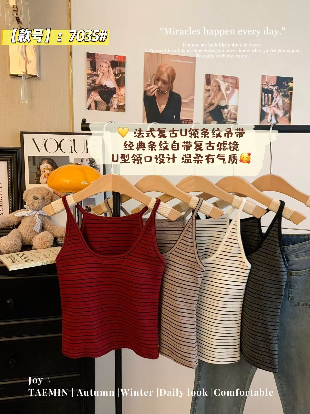 RY3219# 带胸垫 辣妹风U领条纹挂脖背心女夏季外穿内搭修身吊带上衣