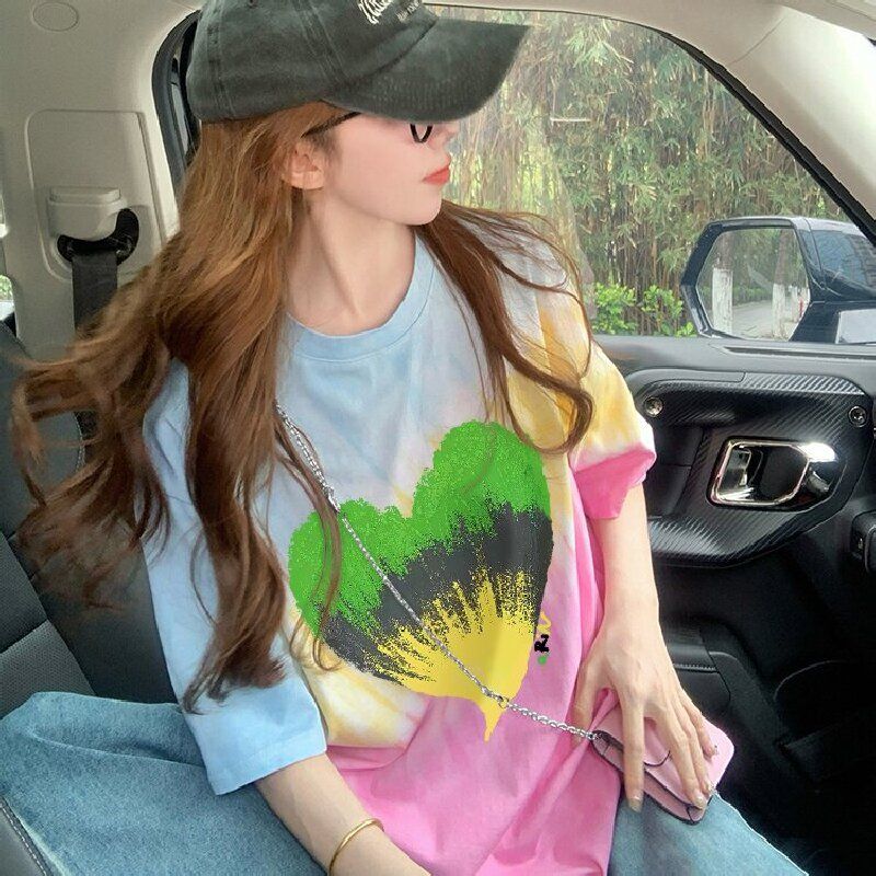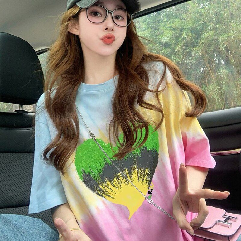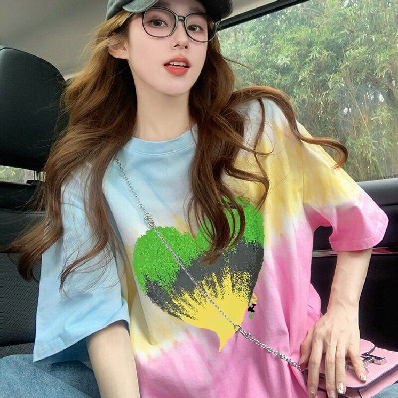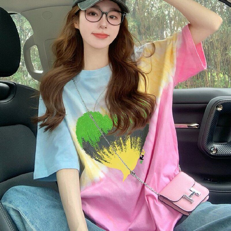 RY3221#纯棉食毛/后包领夏日多巴胺彩色渐变宽松T恤女扎染显瘦上衣