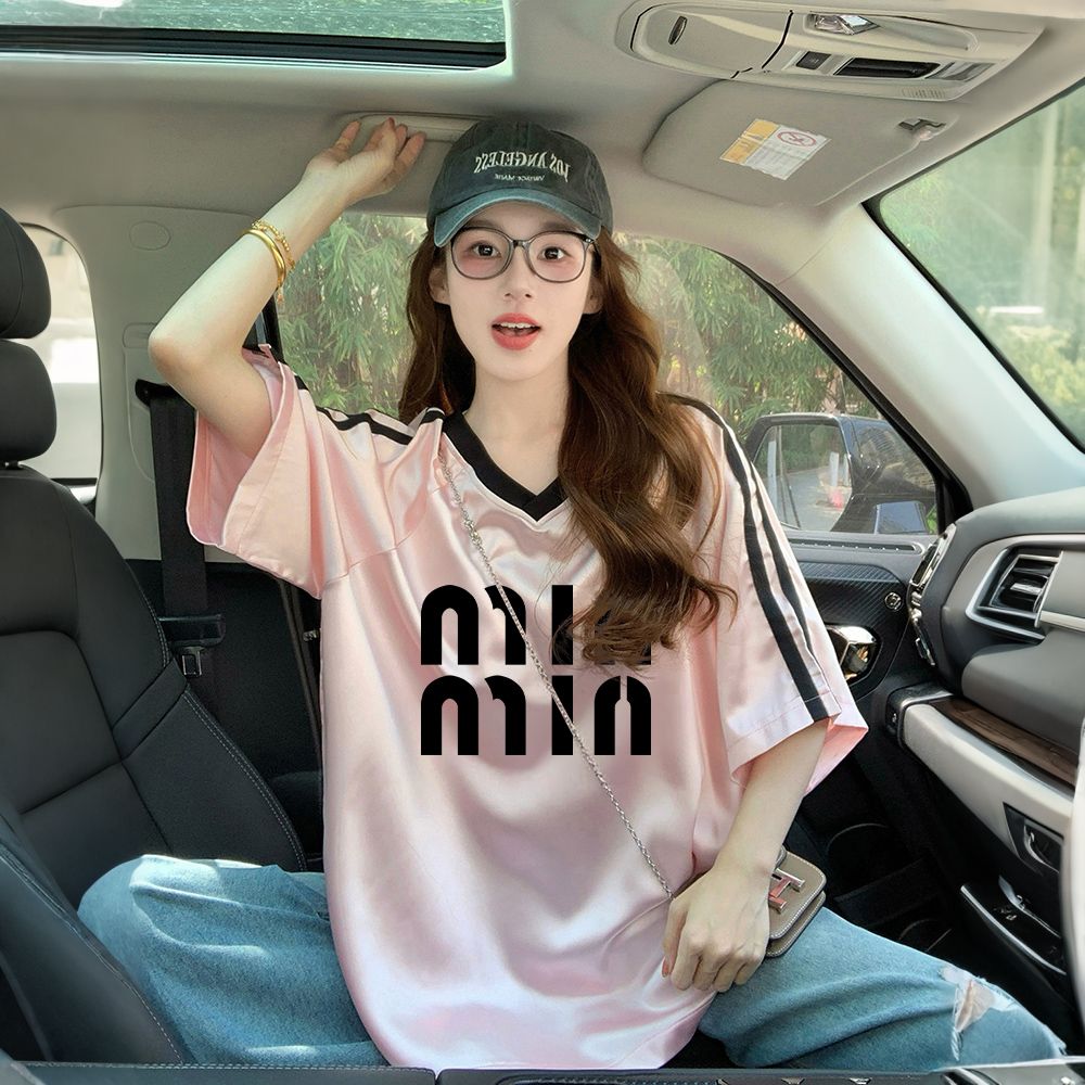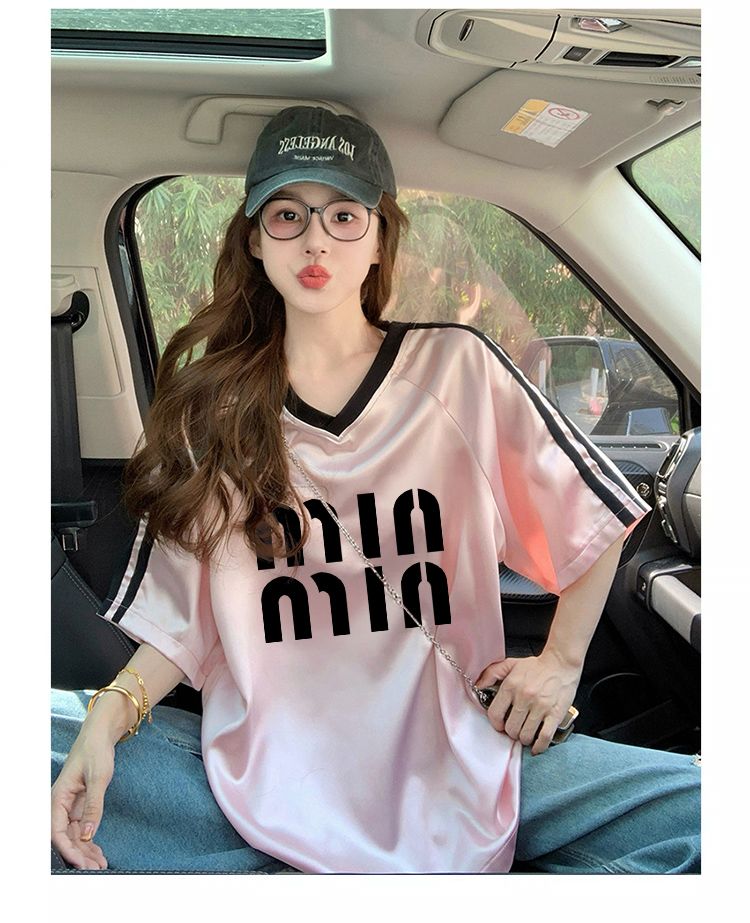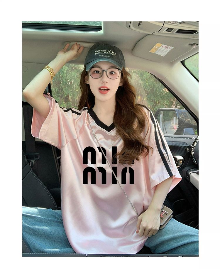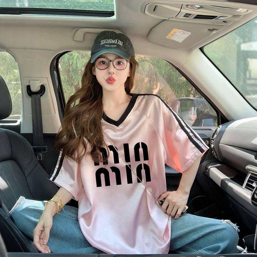 RY3224# 原版面料/后包领球衣运动风宽松T恤女中长款V领设计感上衣