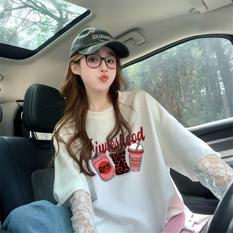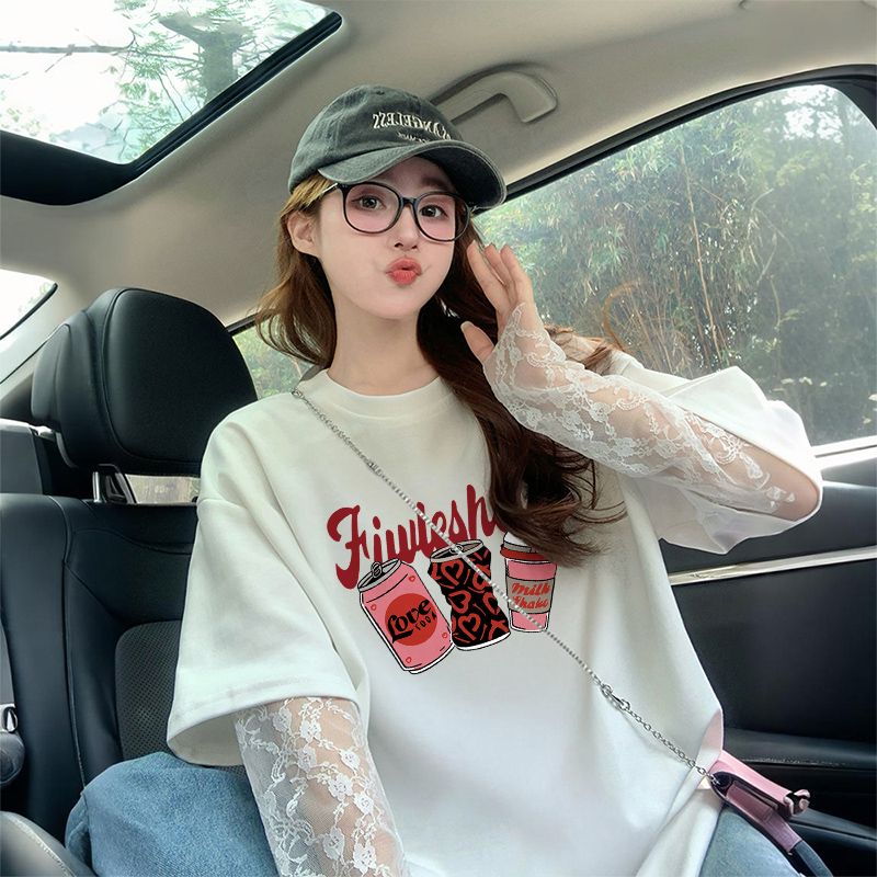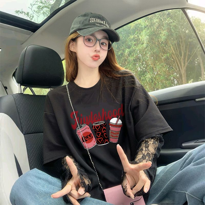 RY3229# 100%纯棉/后包领蕾丝拼接防晒宽松T恤女韩版减龄假两件百搭上衣