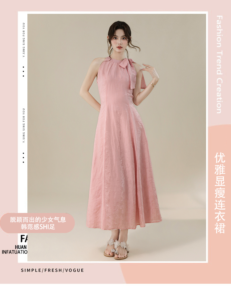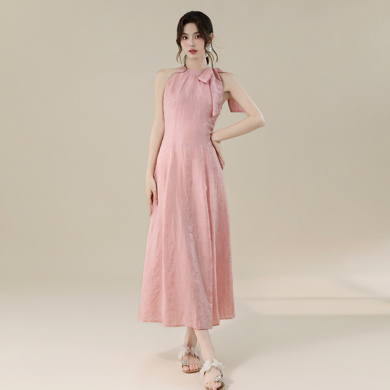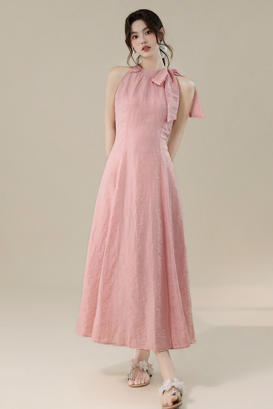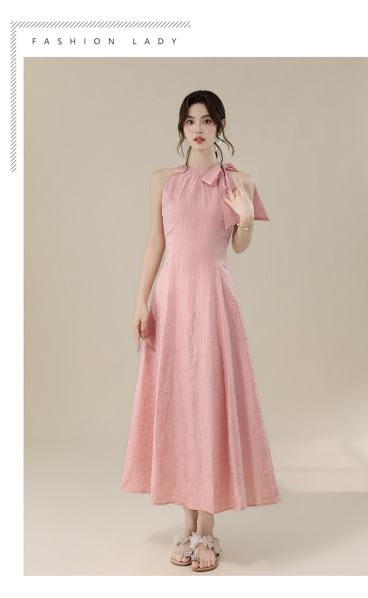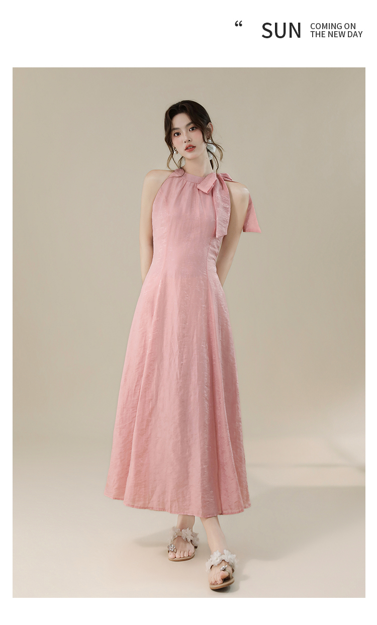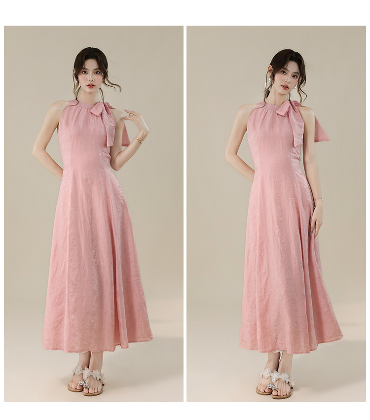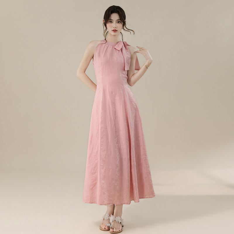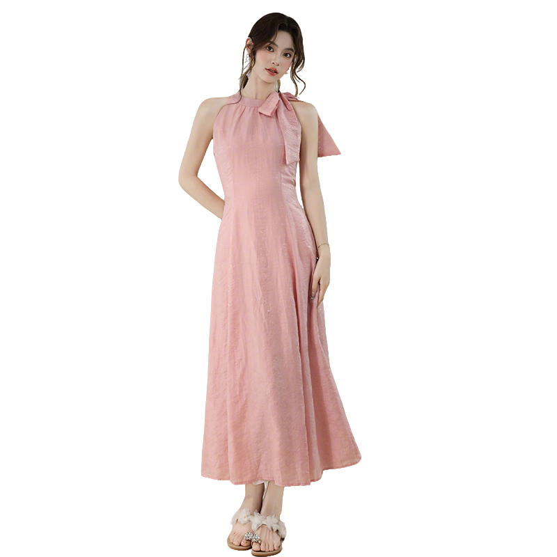 RY3235# 实拍2026韩系女主角浪漫蝴蝶结长款收腰显瘦花朵暗纹桃粉色连衣裙