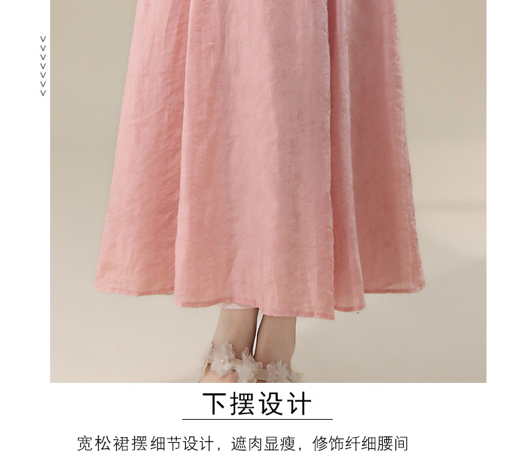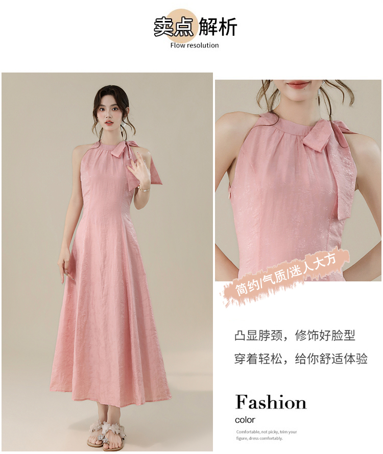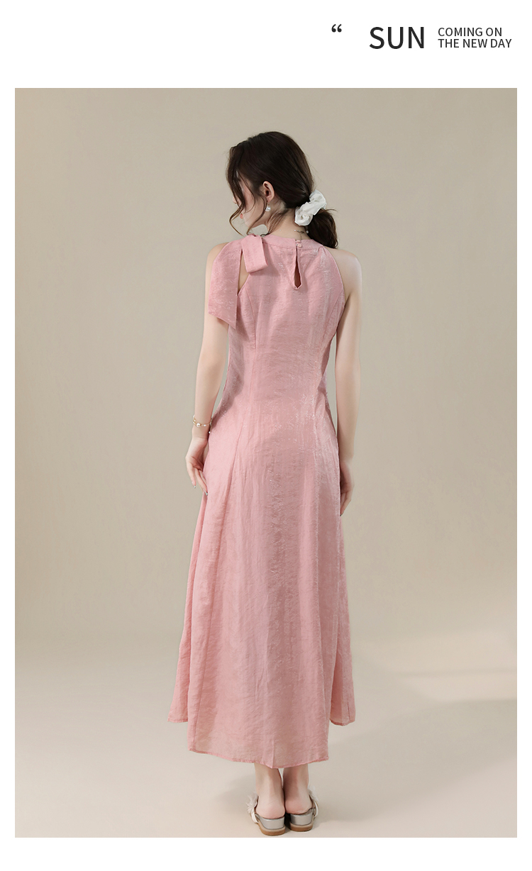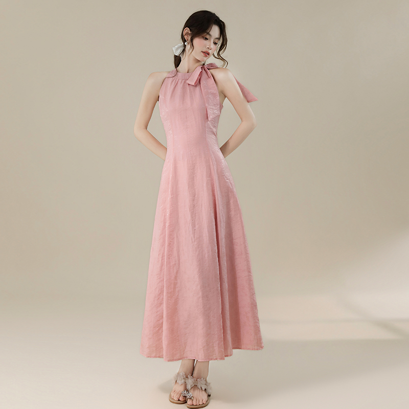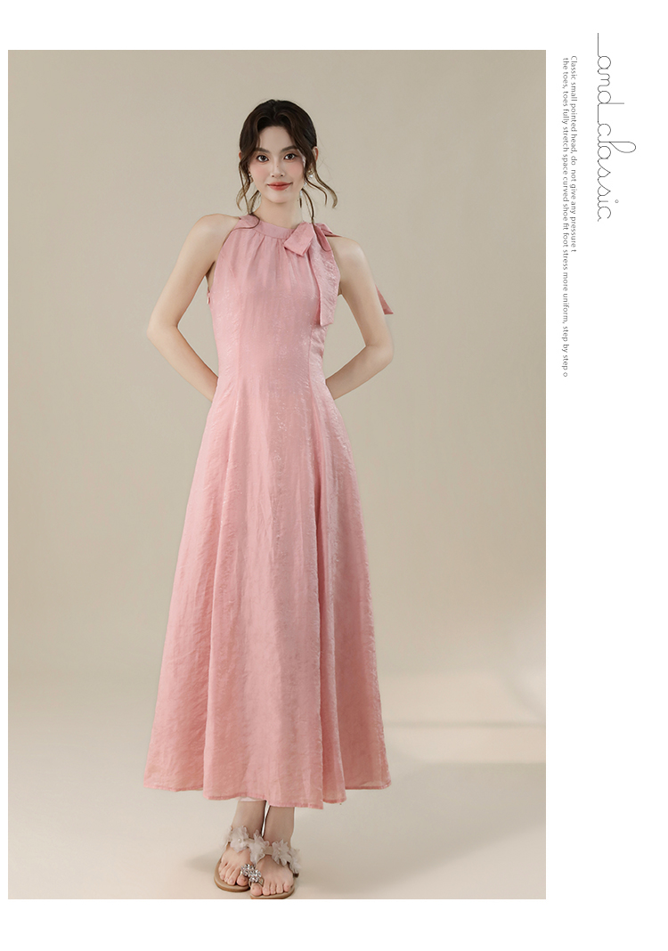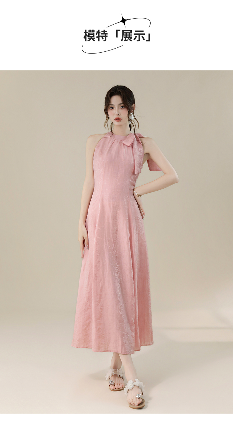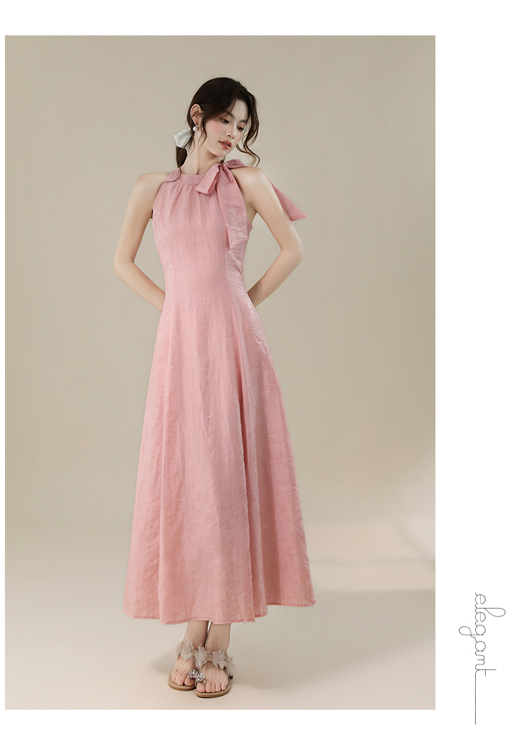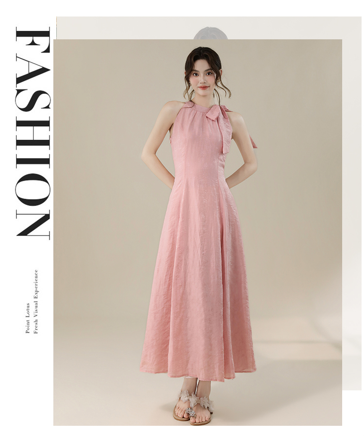 RY3235# 实拍2026韩系女主角浪漫蝴蝶结长款收腰显瘦花朵暗纹桃粉色连衣裙