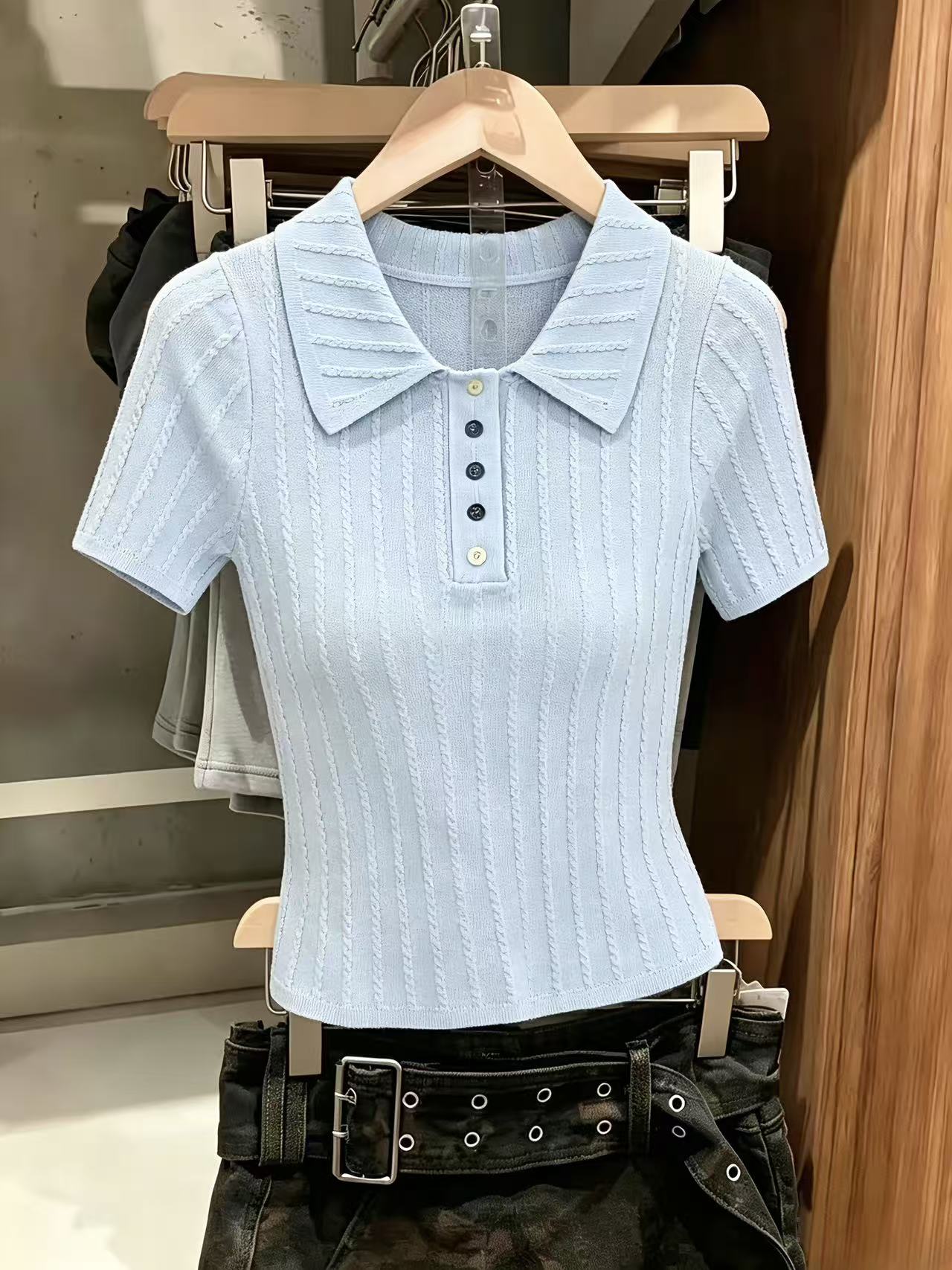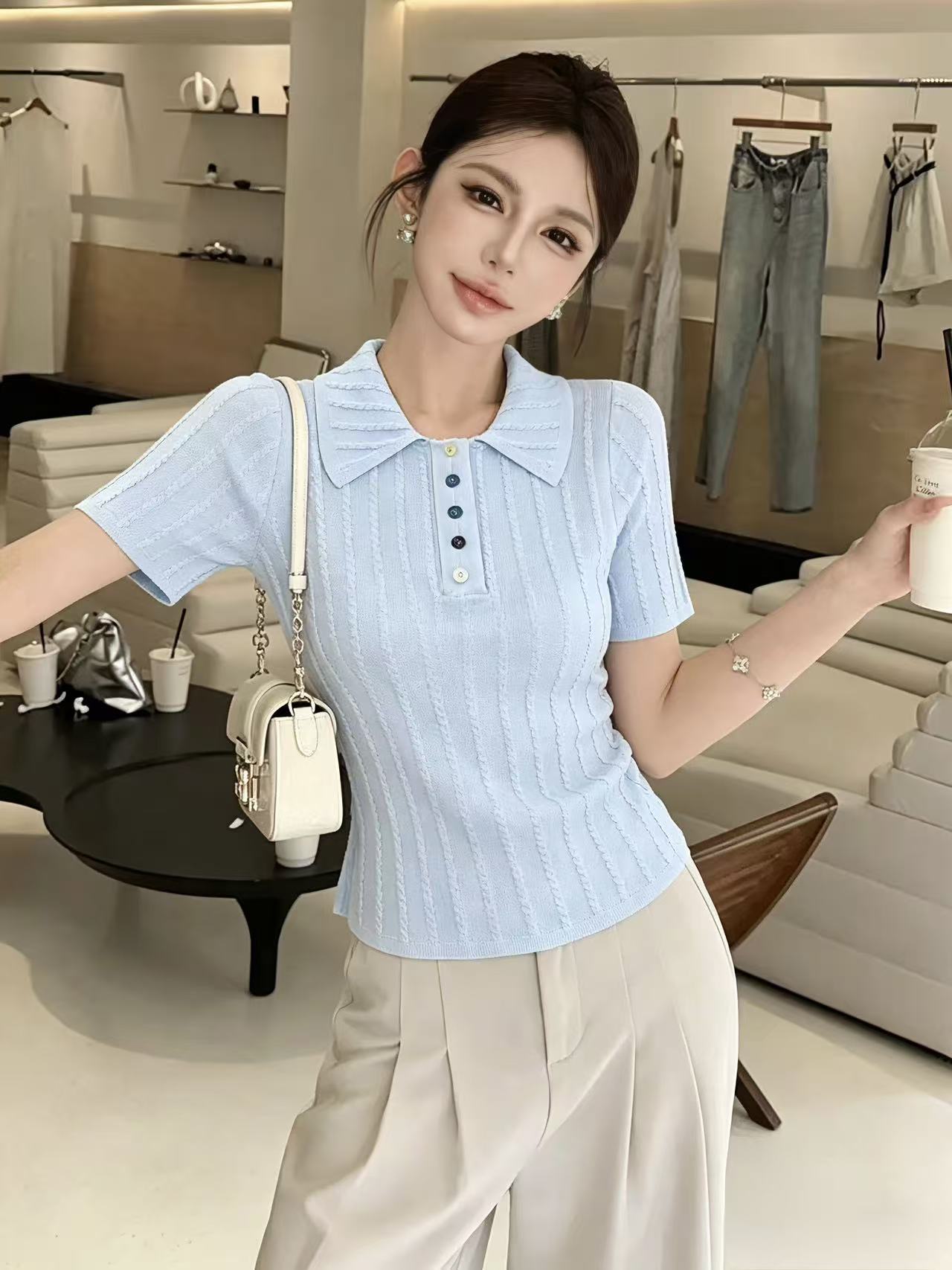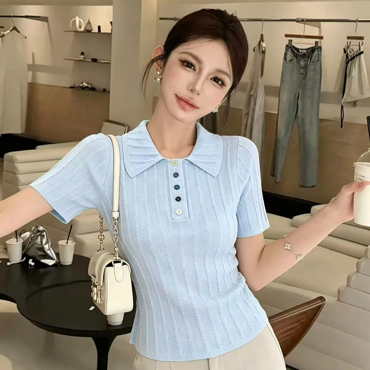 RY3255# 实拍休闲风polo领小衫蓝色冰丝针织短袖t恤女正肩掐腰设计感上衣