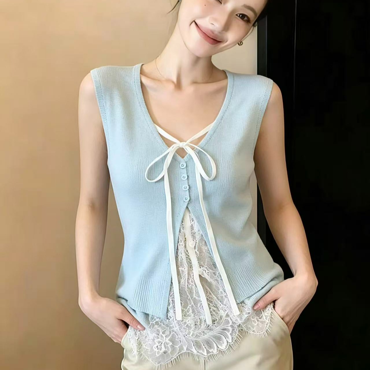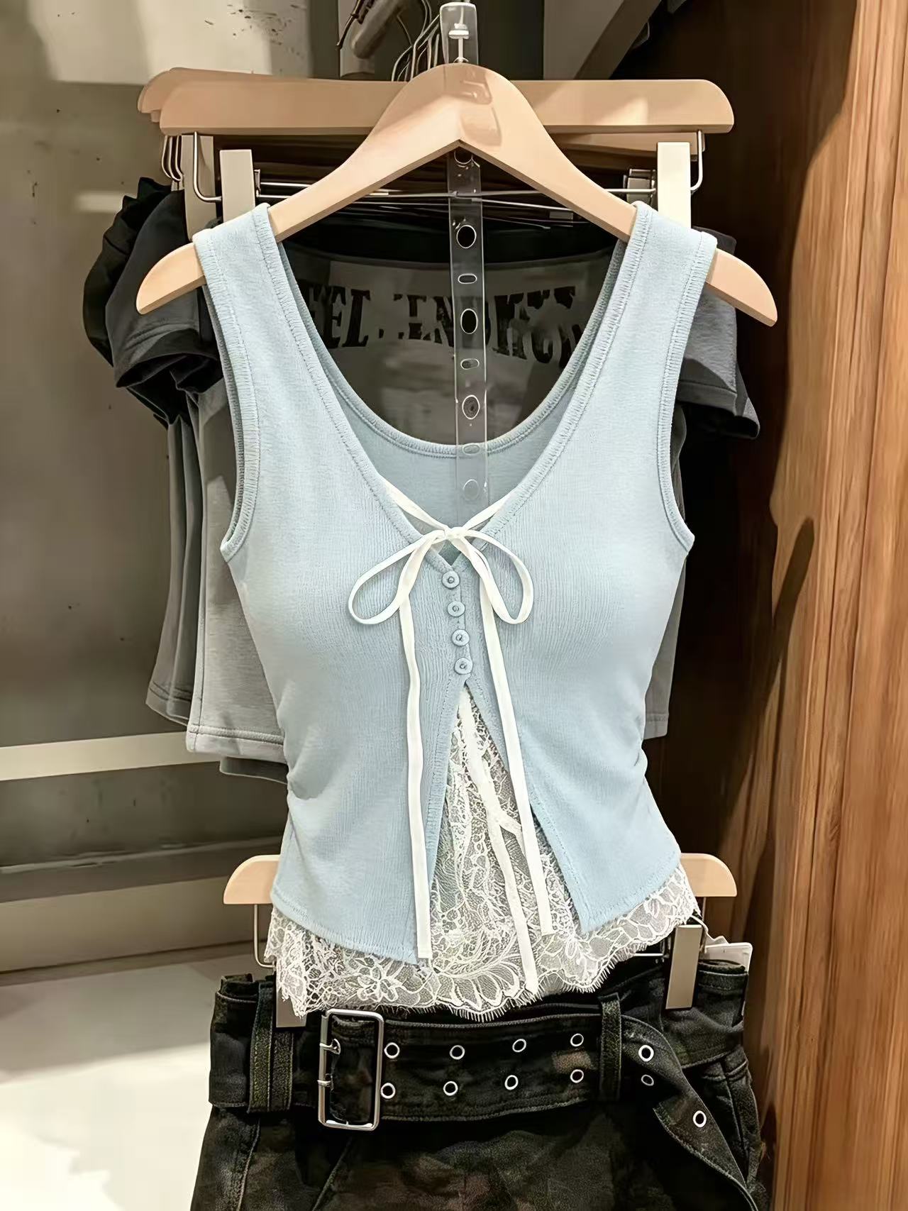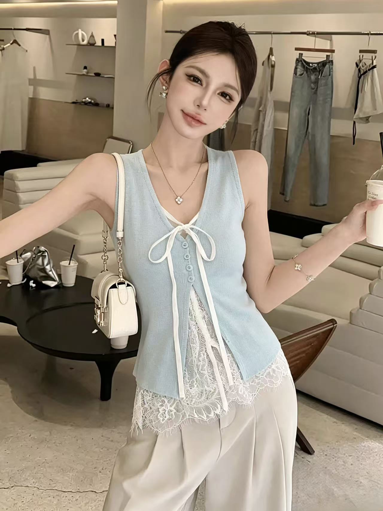 RY3256# 实拍浅蓝色纯欲蕾丝拼接假两件v领无袖t恤女短款上衣夏薄款高级感