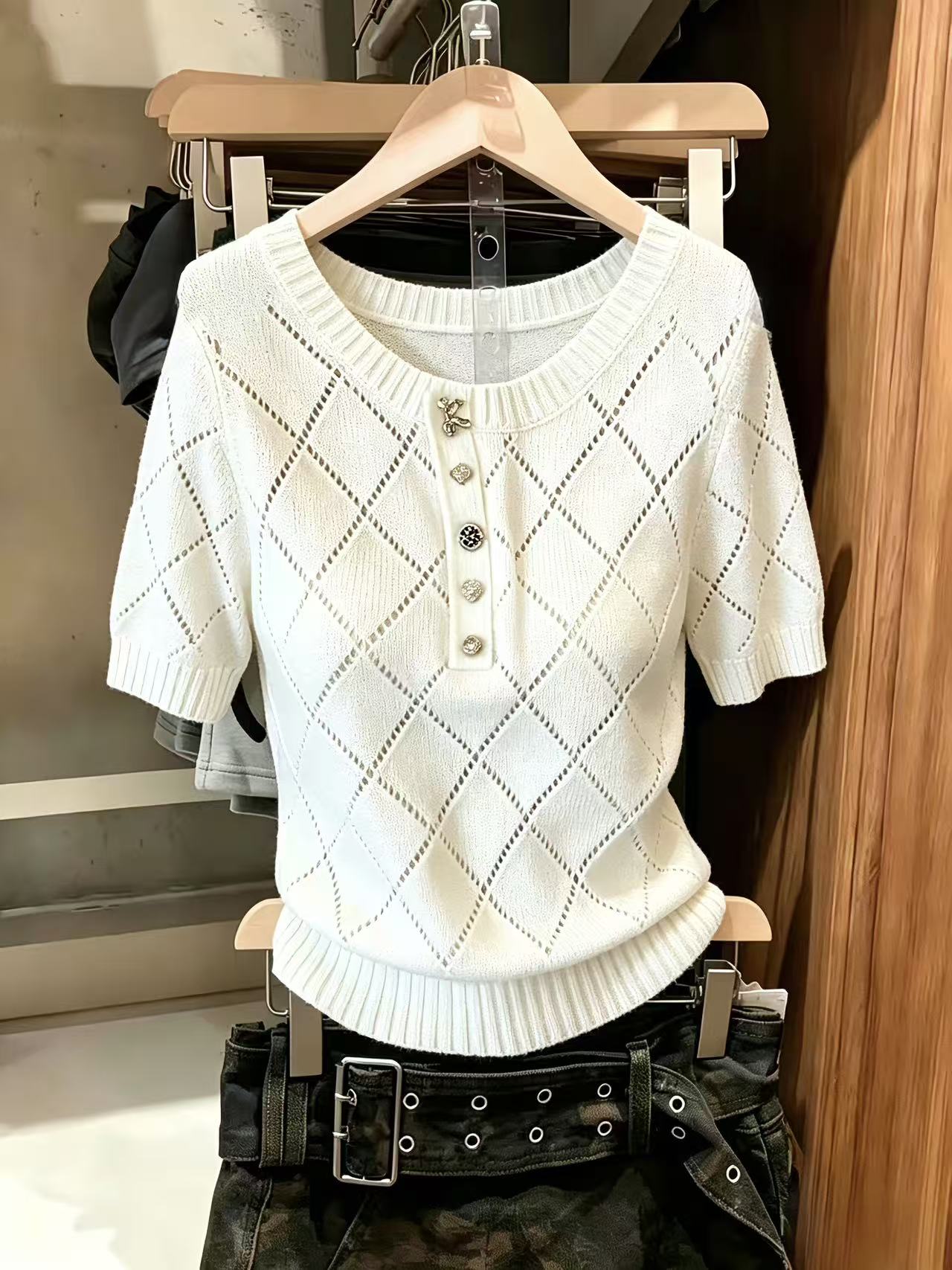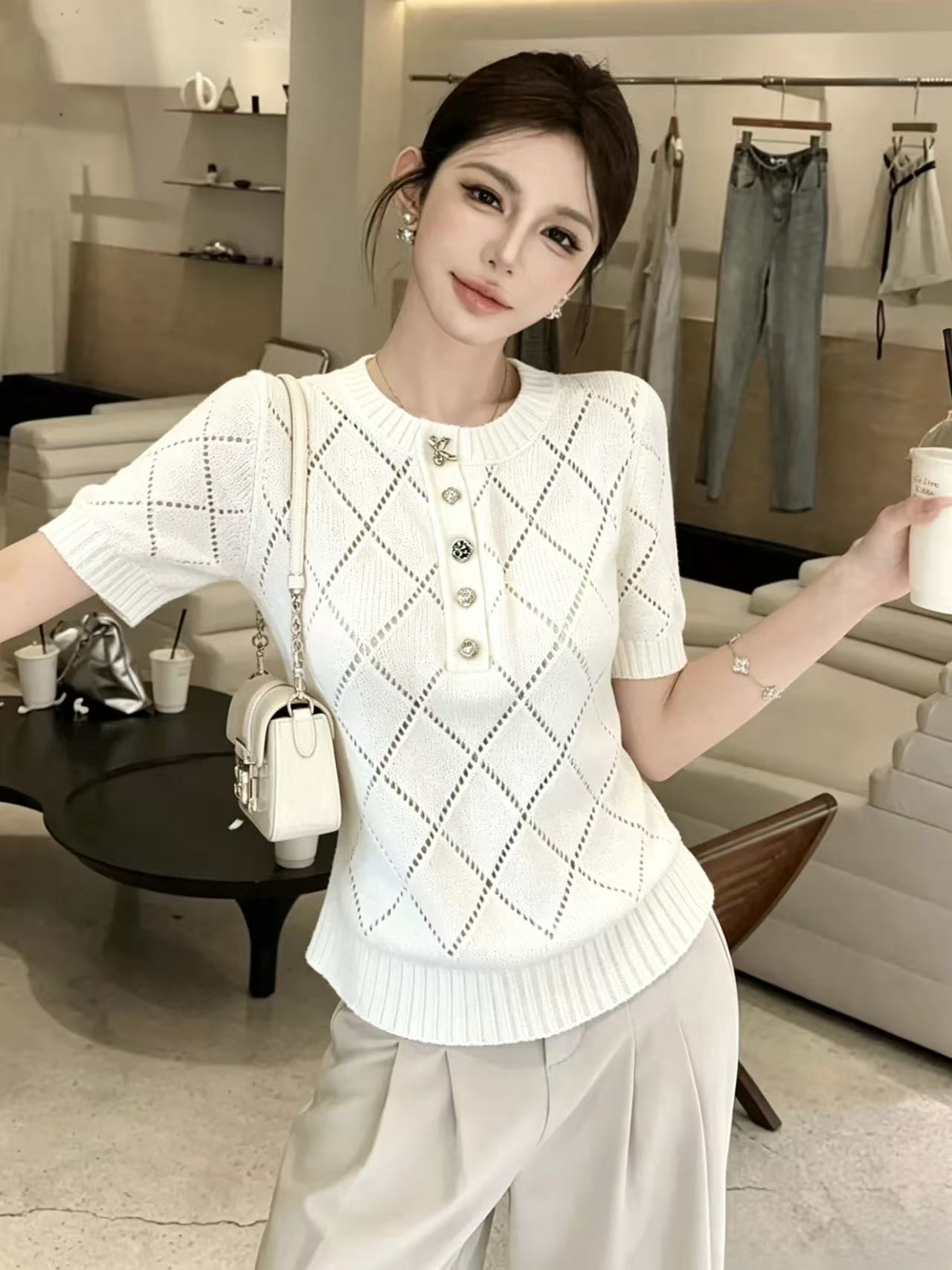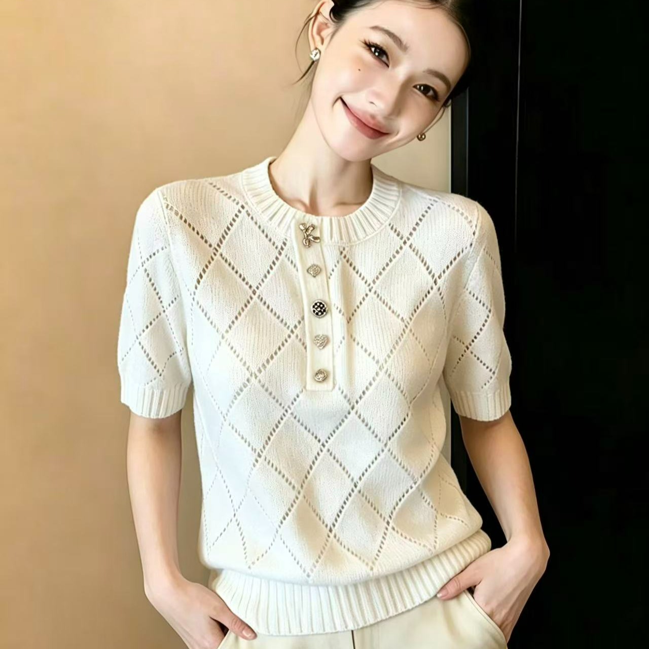 RY3258# 实拍韩系菱格羊毛短袖t恤女圆领针织修身显瘦上衣chic