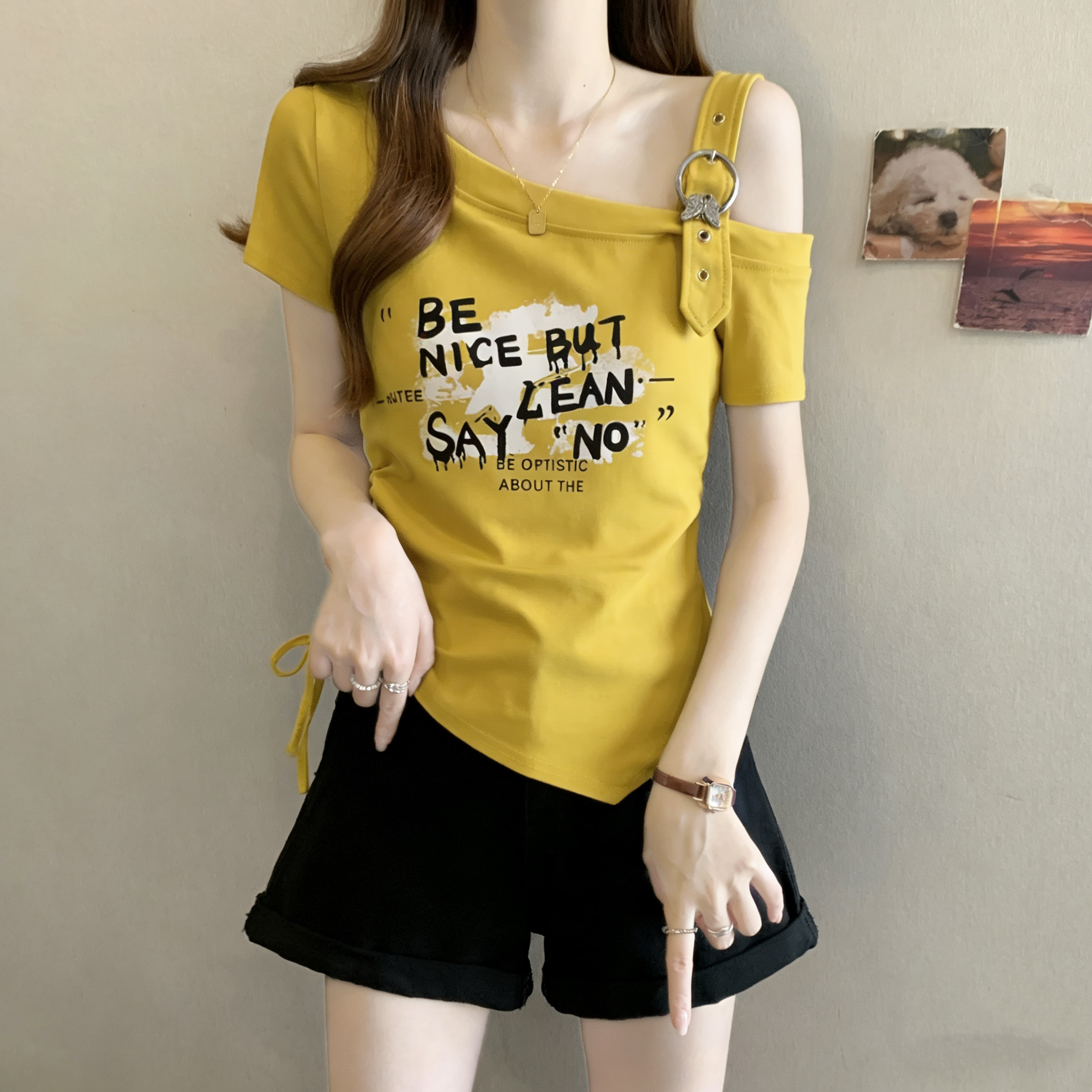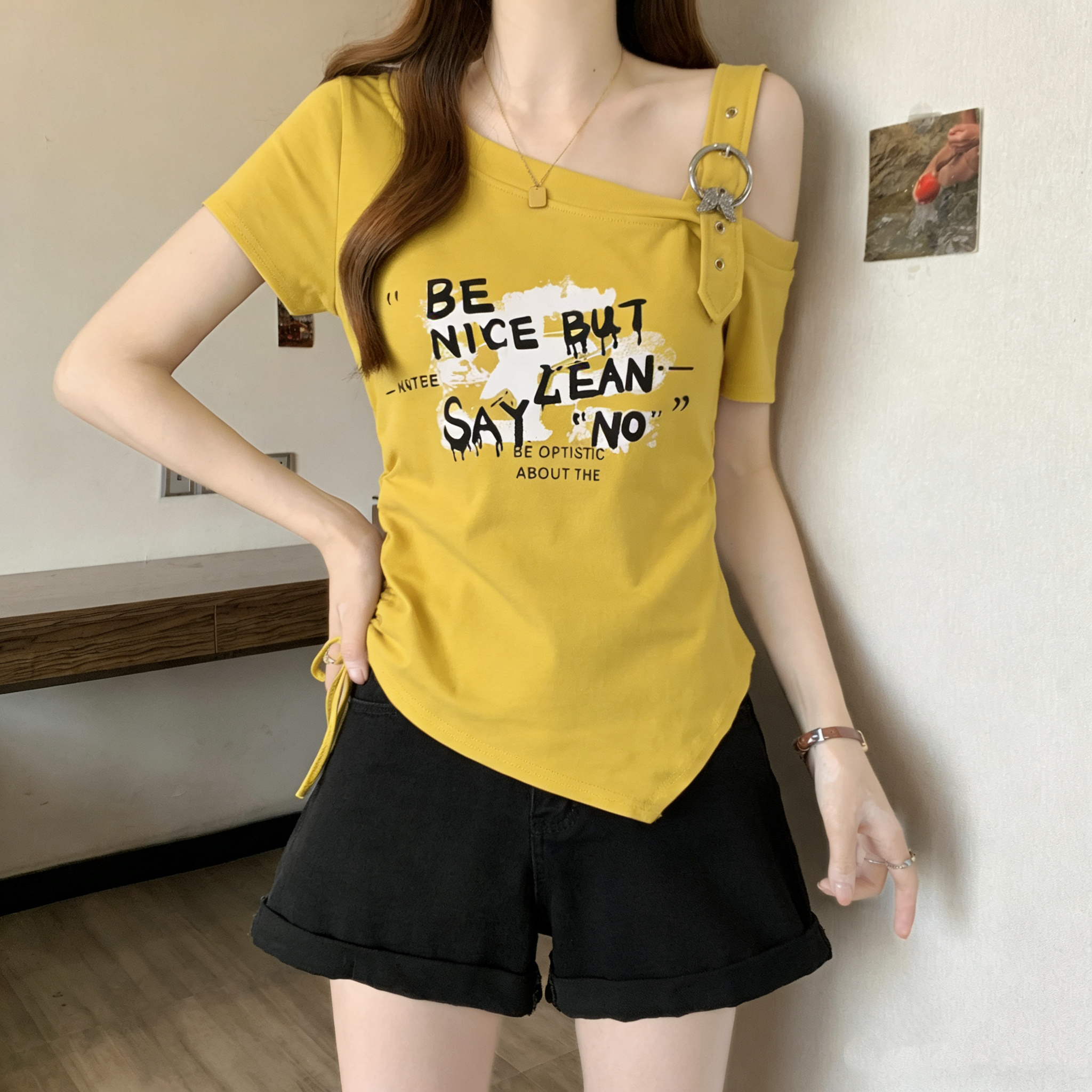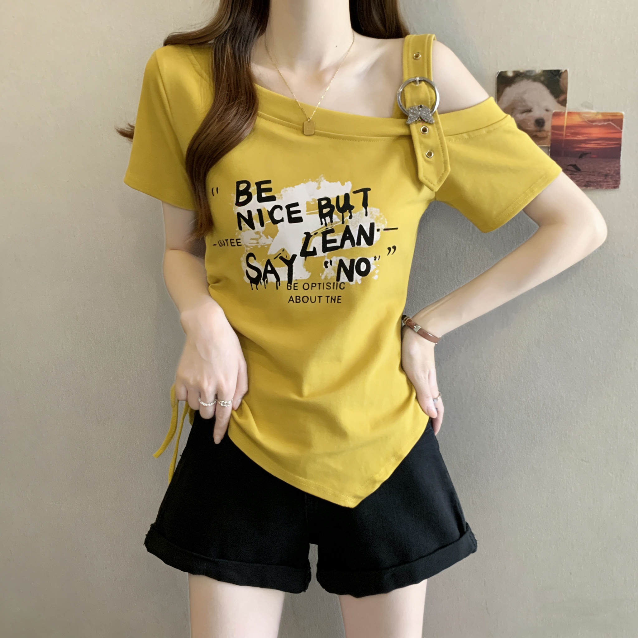 RY3261# 实拍大码字母印花露肩别致短袖T恤女夏季胖MM收腰显瘦遮肚上衣女