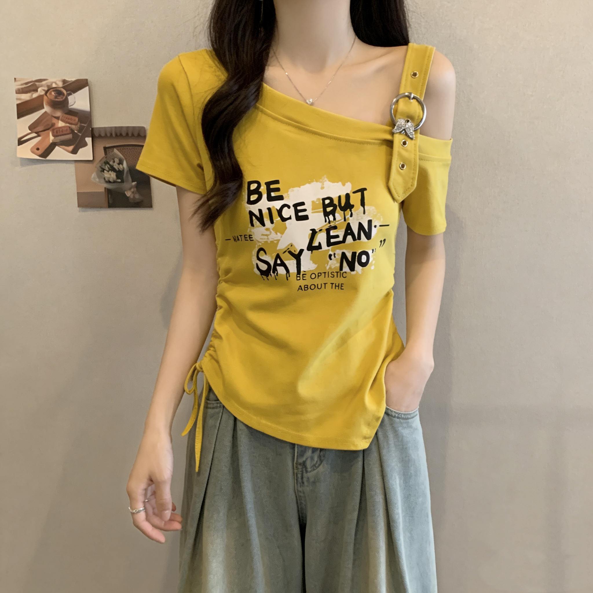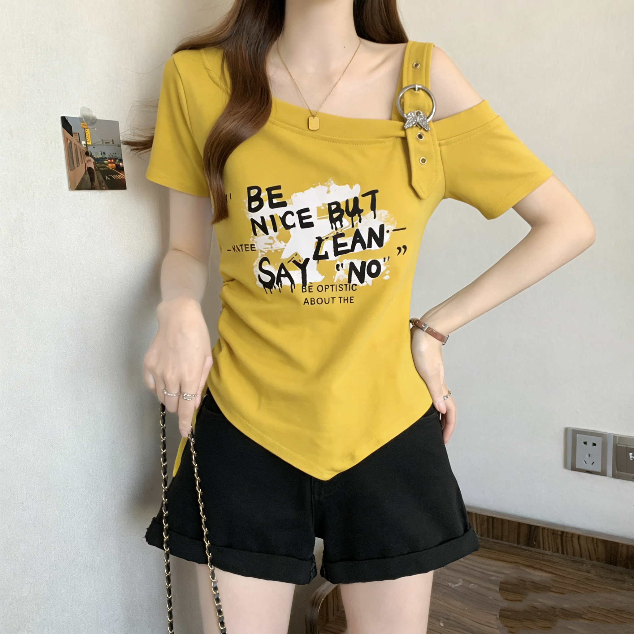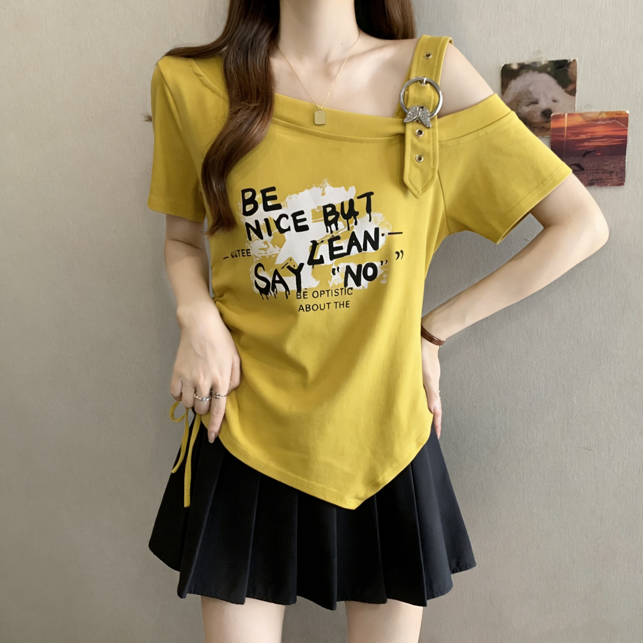 RY3261# 实拍大码字母印花露肩别致短袖T恤女夏季胖MM收腰显瘦遮肚上衣女