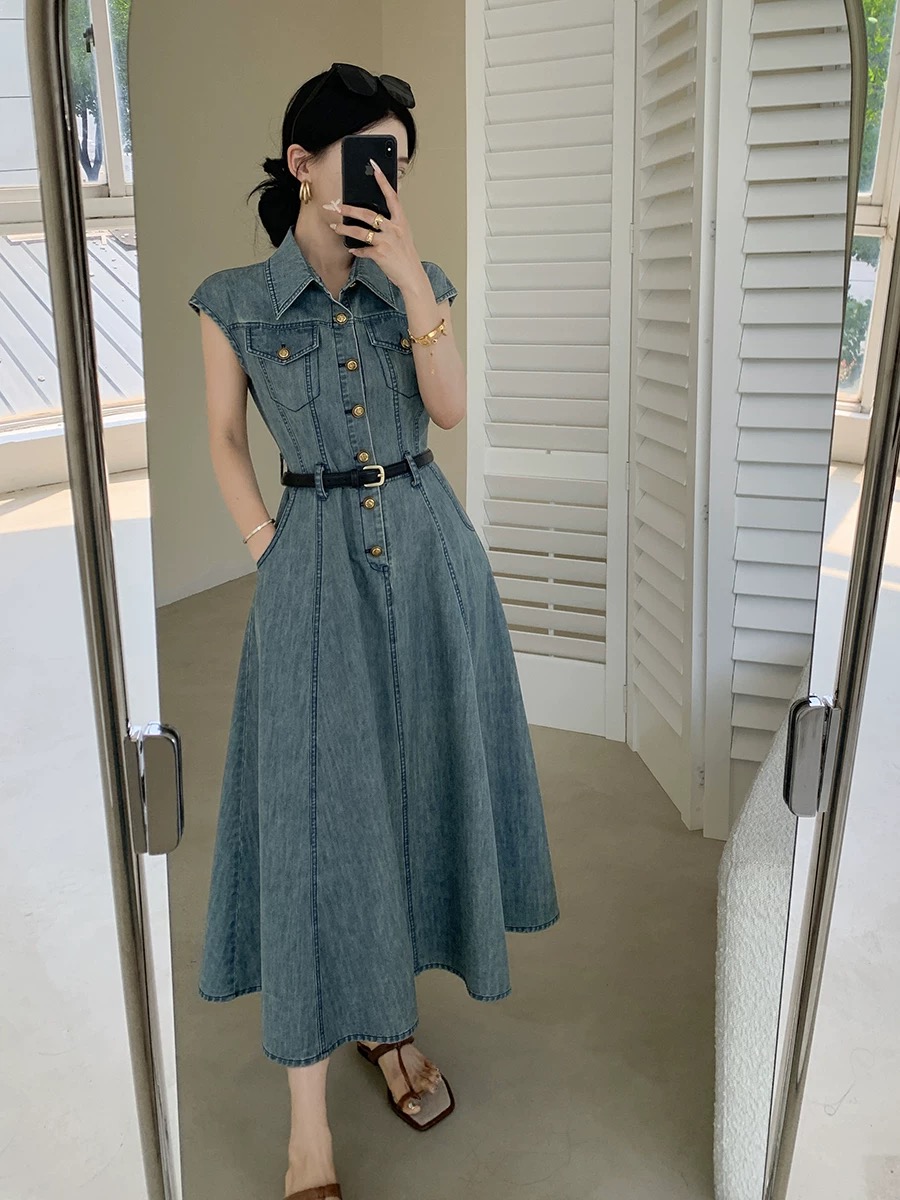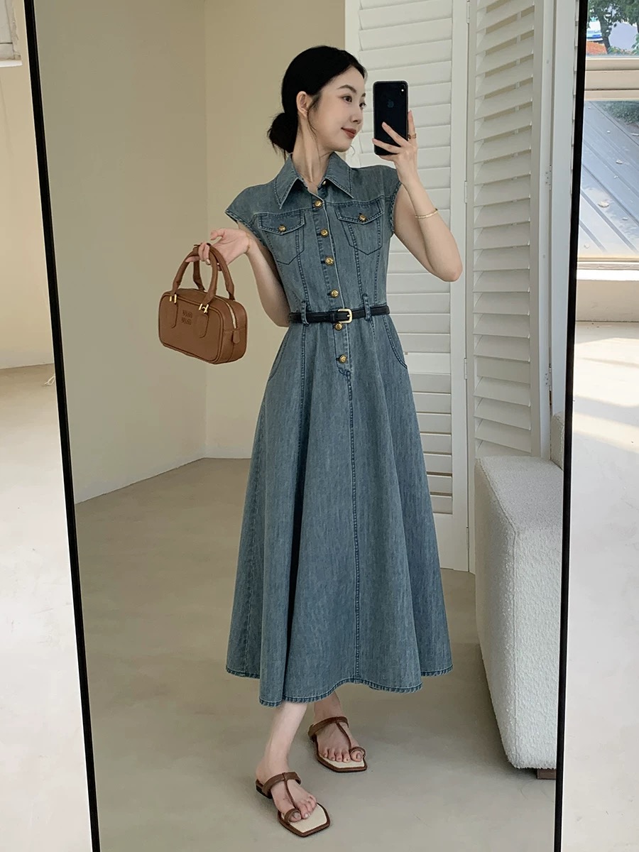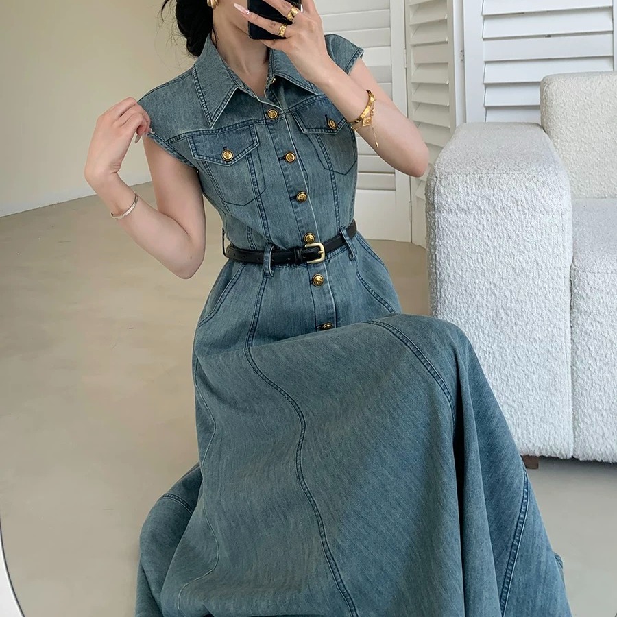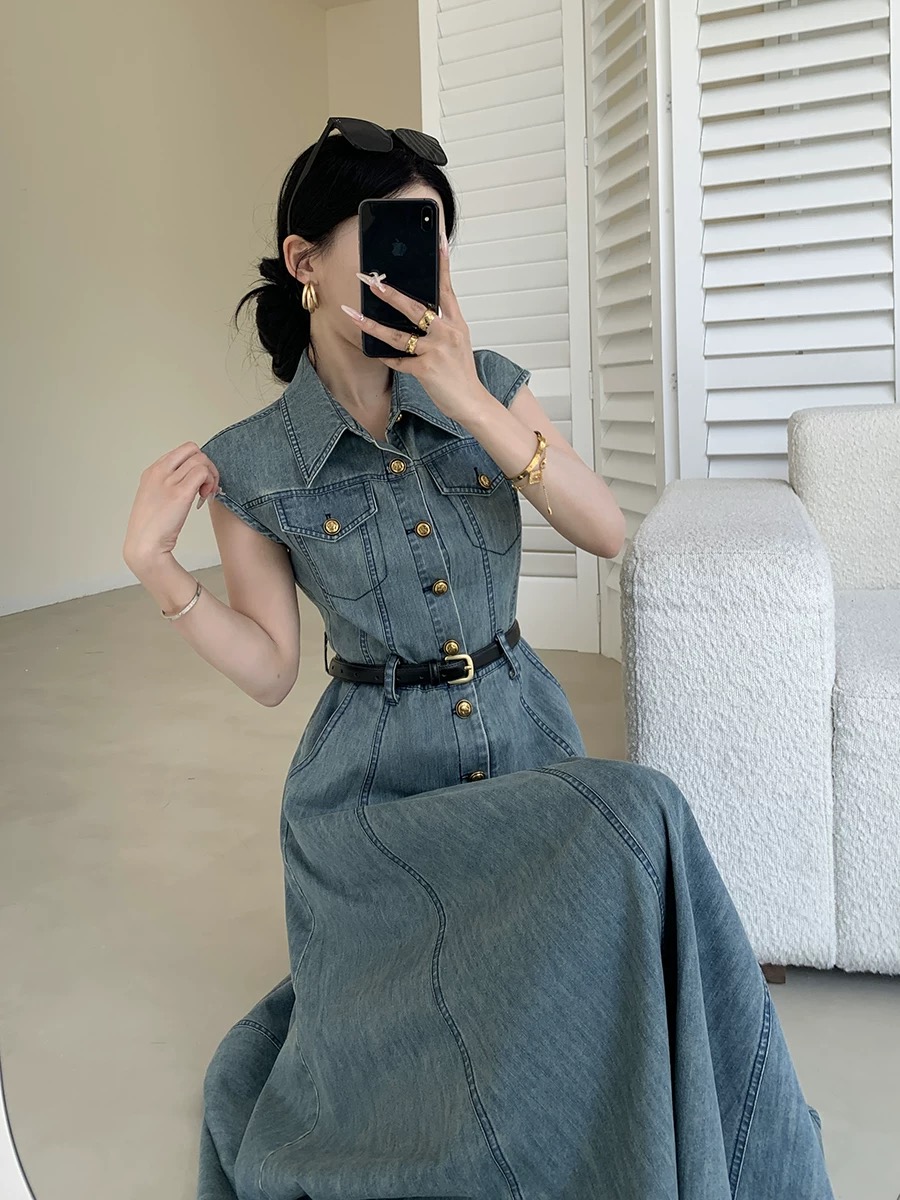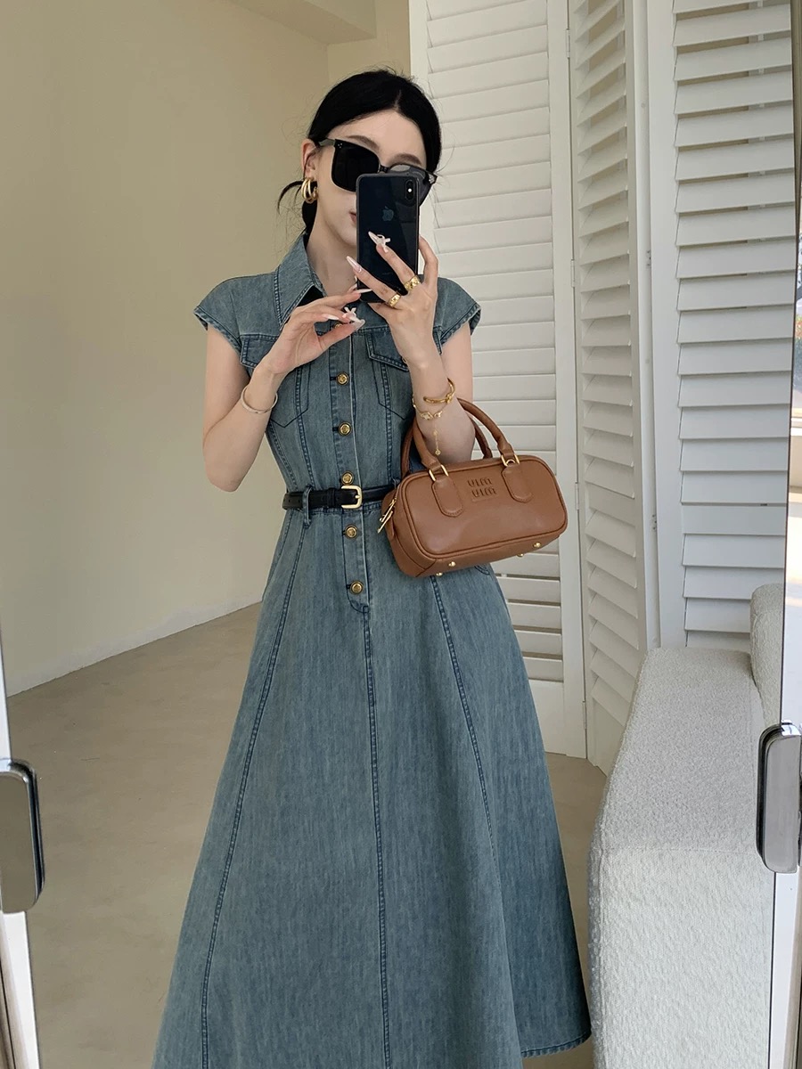 RY3271# FT GUOGE蓝色牛仔连衣裙女2026夏新款法式复古收腰显瘦小飞袖长裙