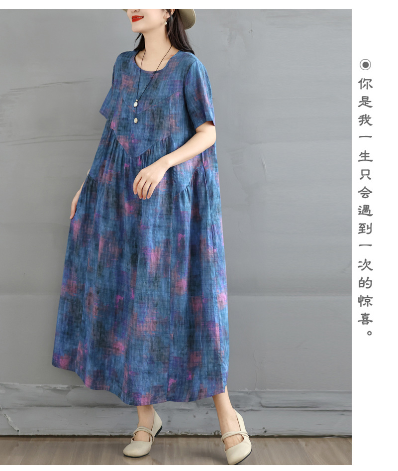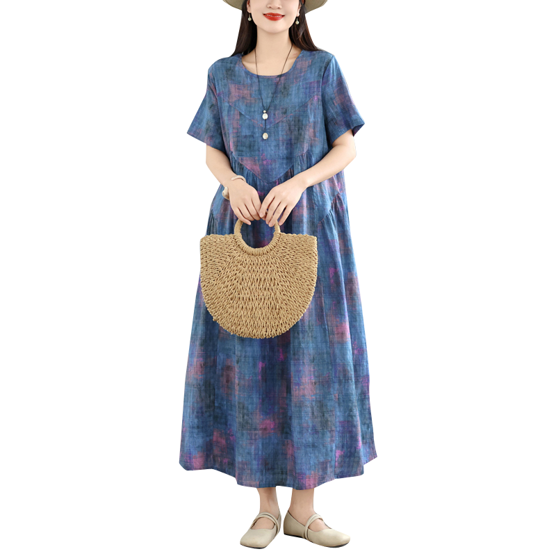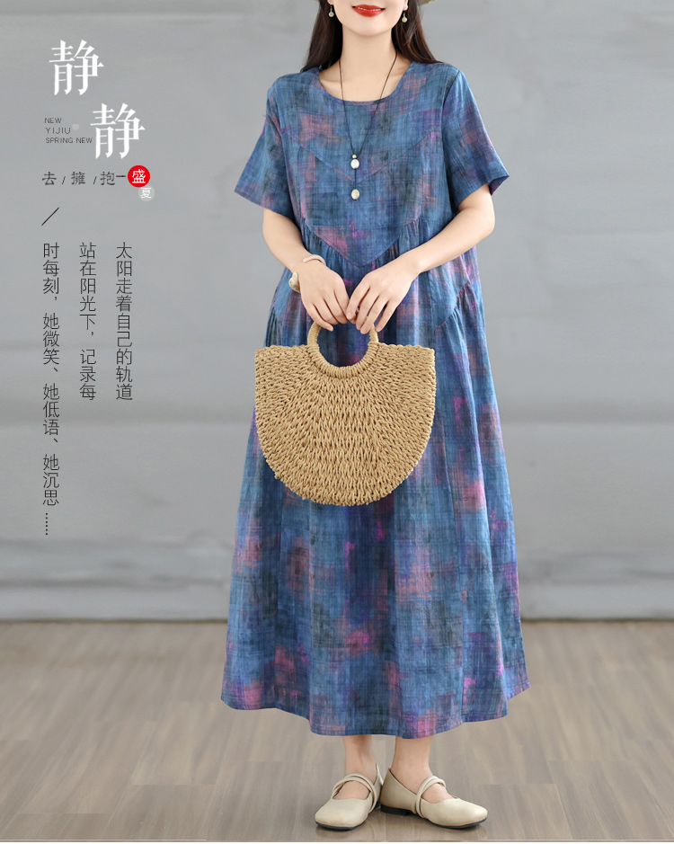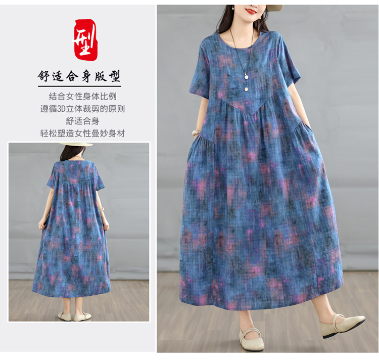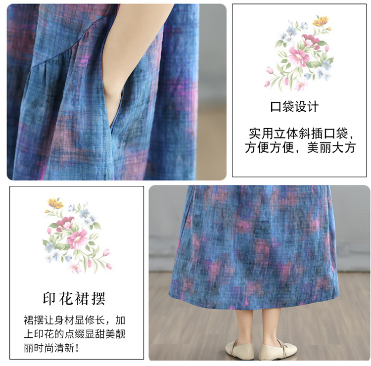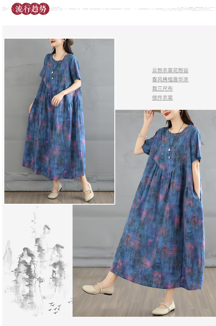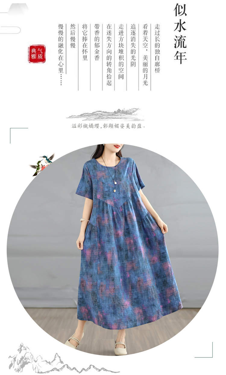 RY3272# 实拍2026夏季新款复古竹节麻圆领口袋短袖连衣裙女宽松显瘦A字裙