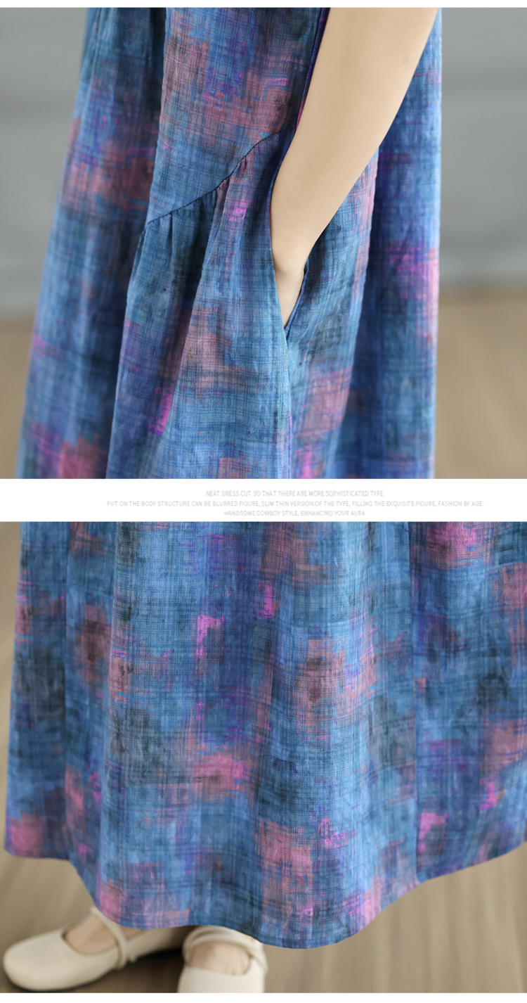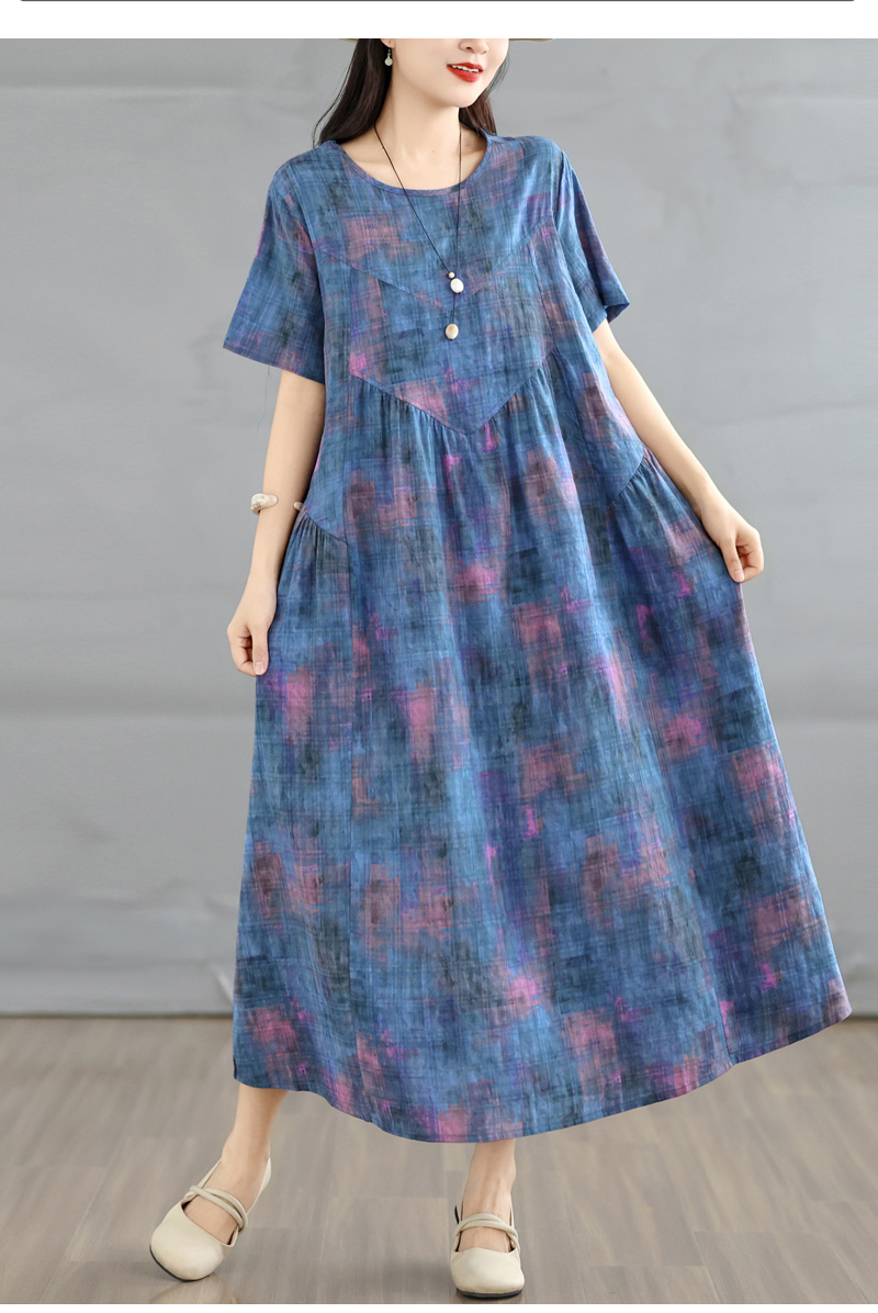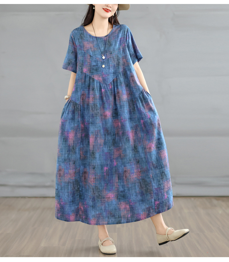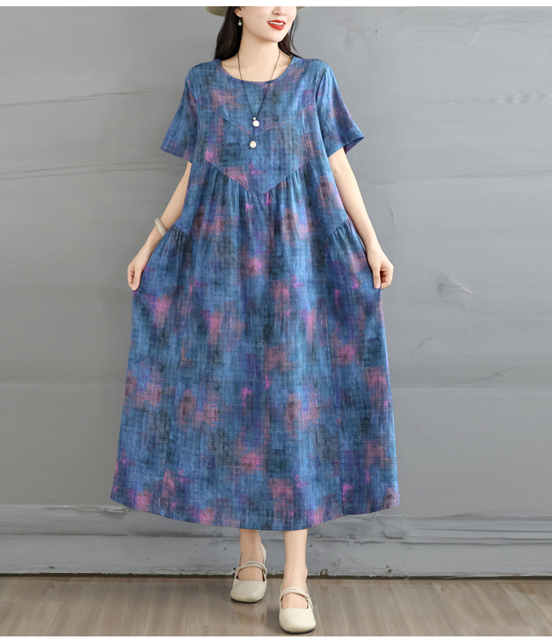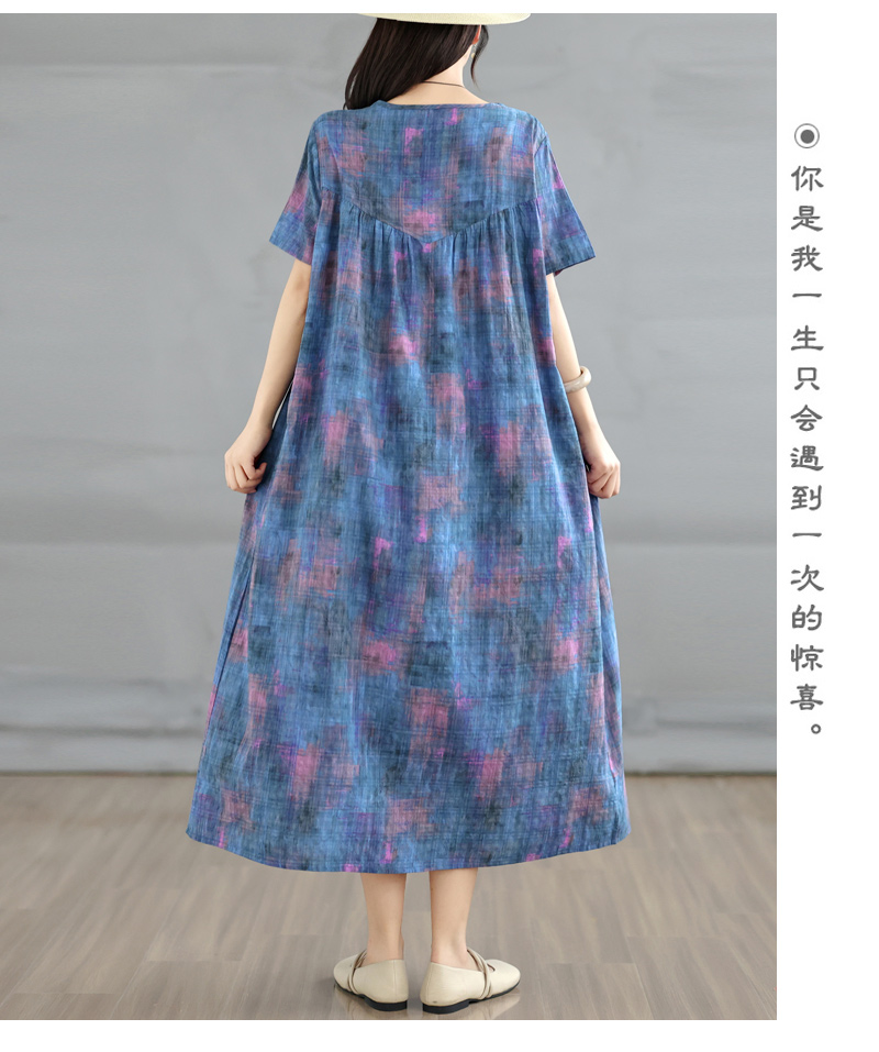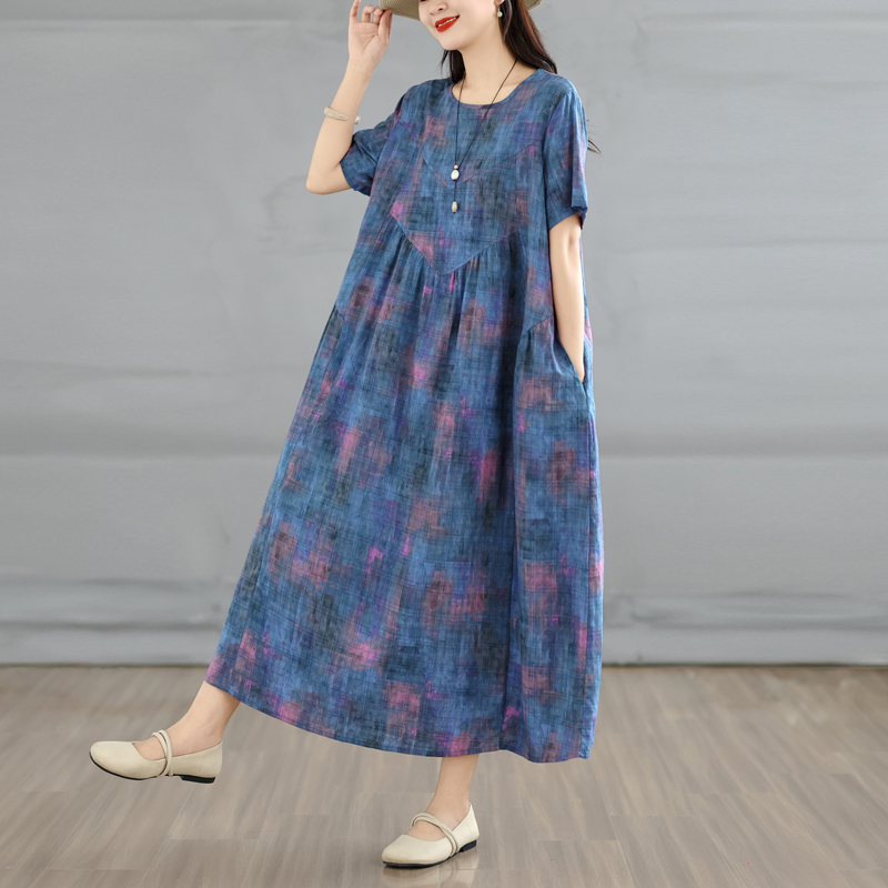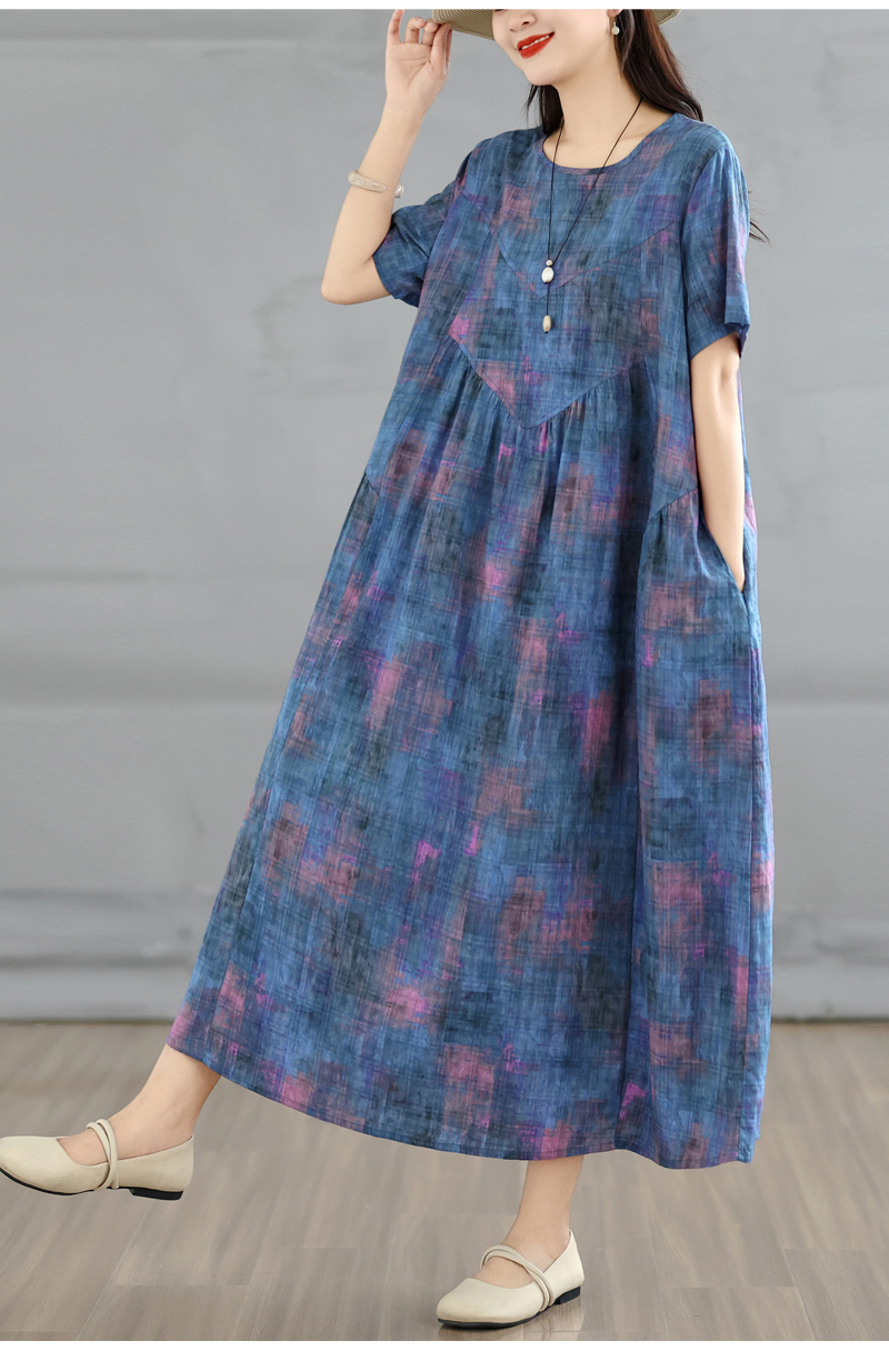 RY3272# 实拍2026夏季新款复古竹节麻圆领口袋短袖连衣裙女宽松显瘦A字裙