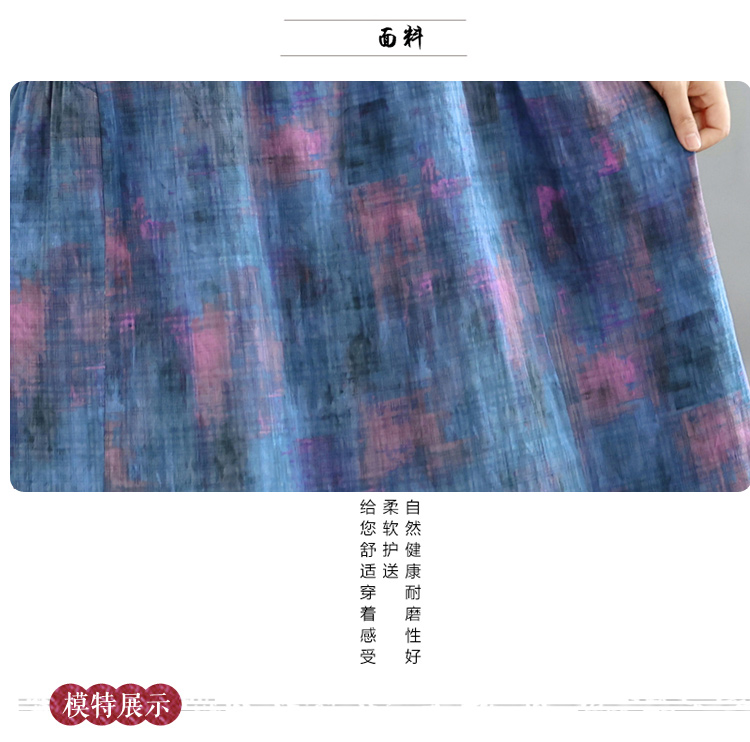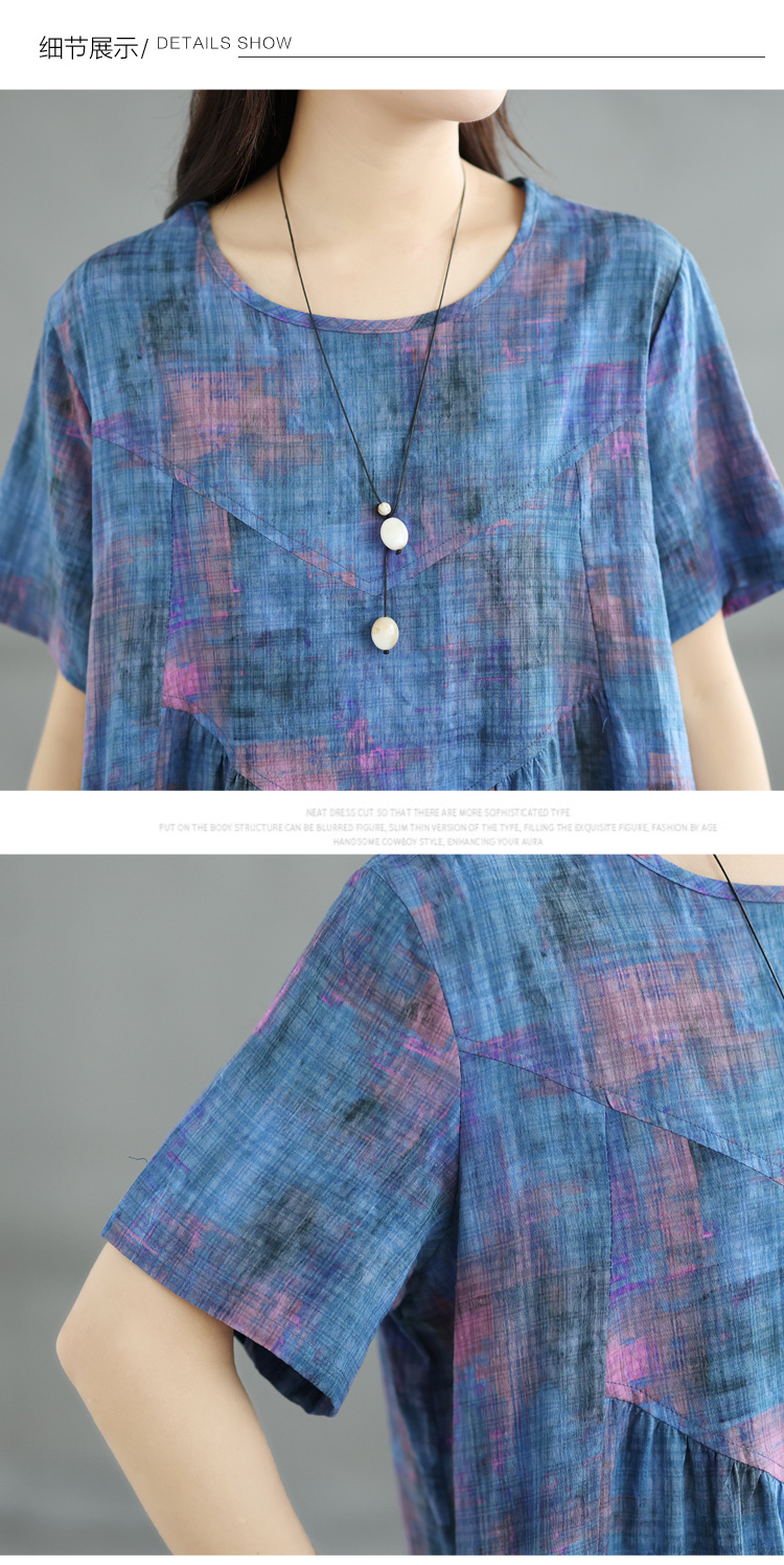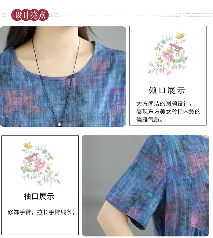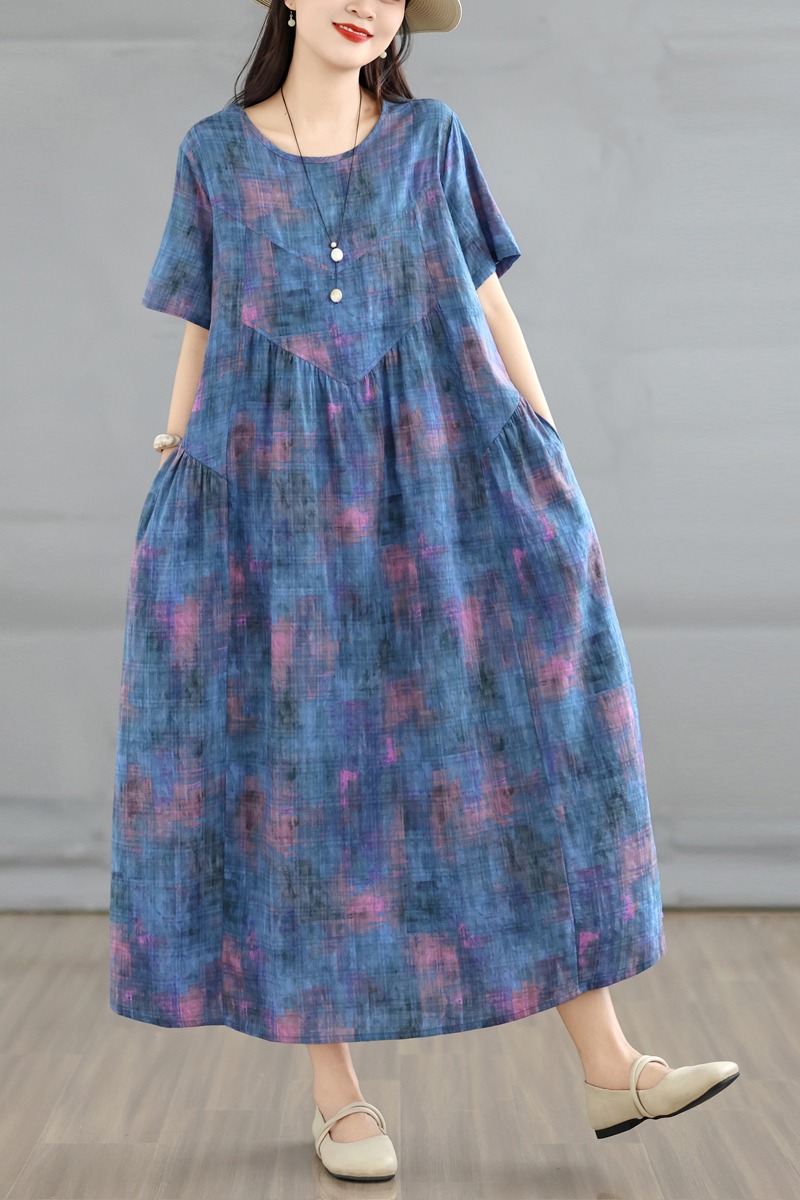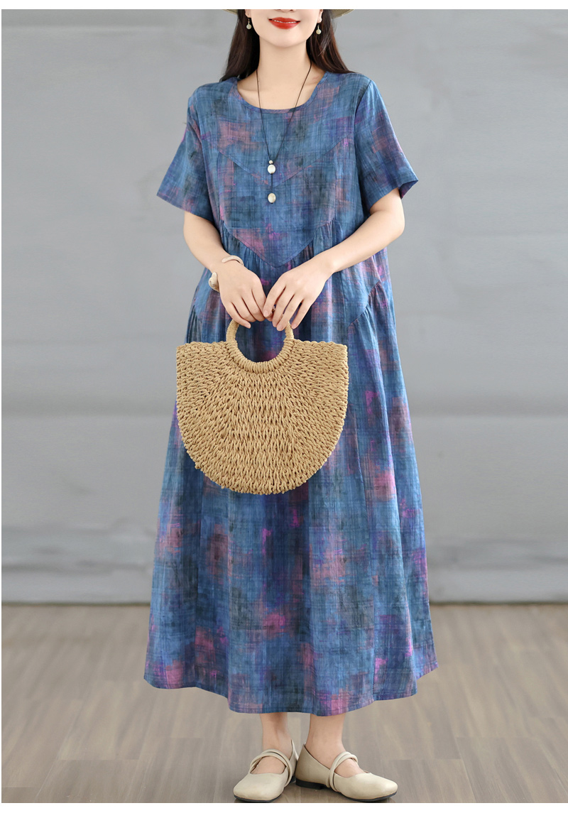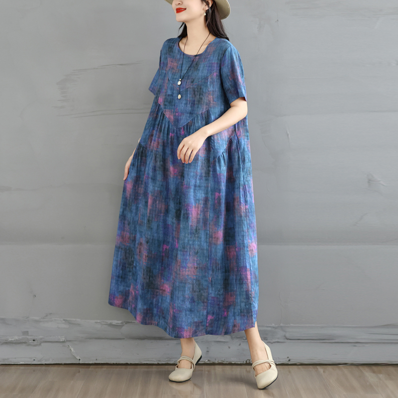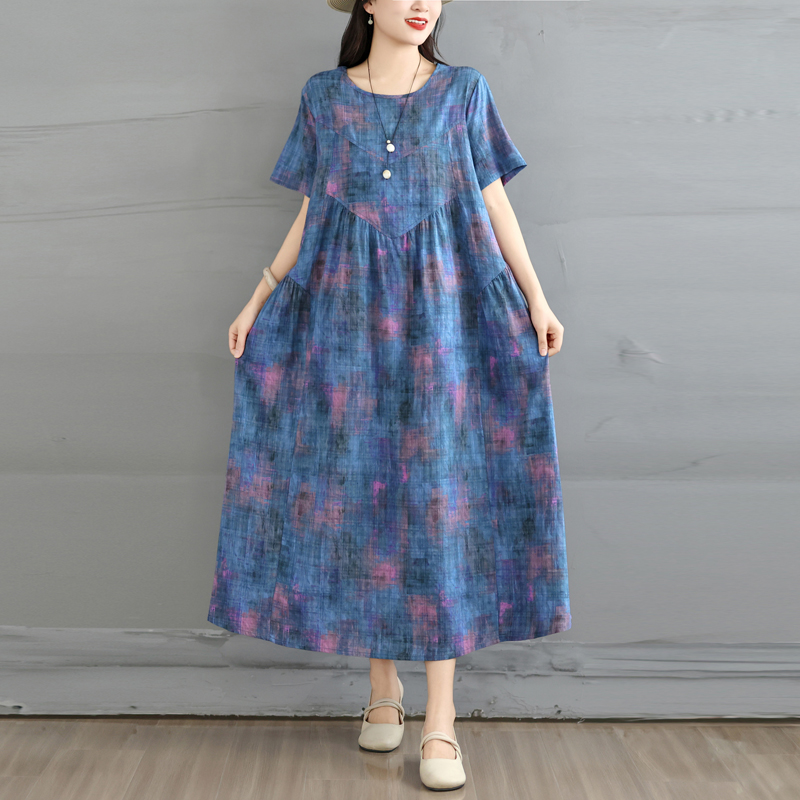RY3272# 实拍2026夏季新款复古竹节麻圆领口袋短袖连衣裙女宽松显瘦A字裙