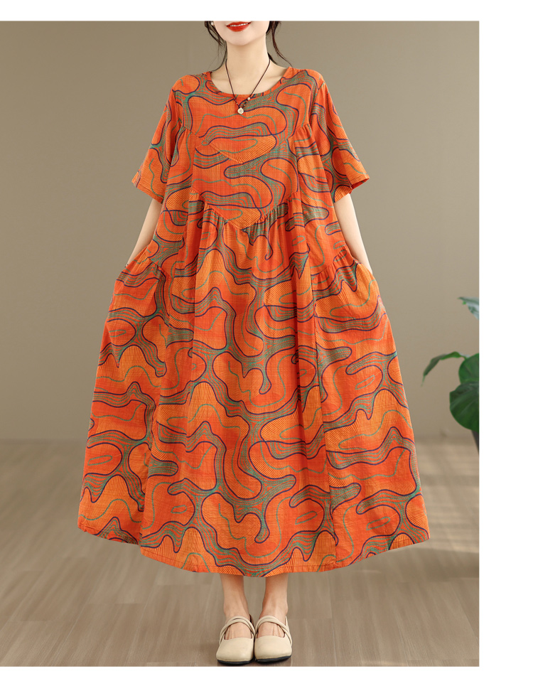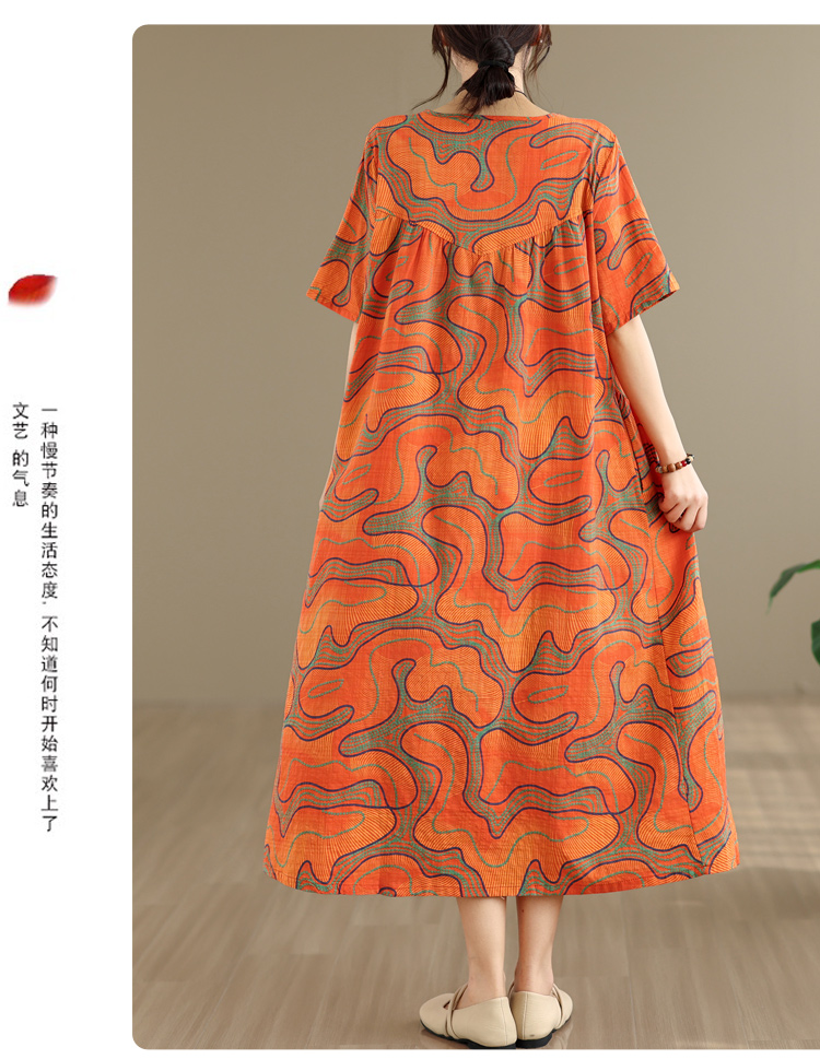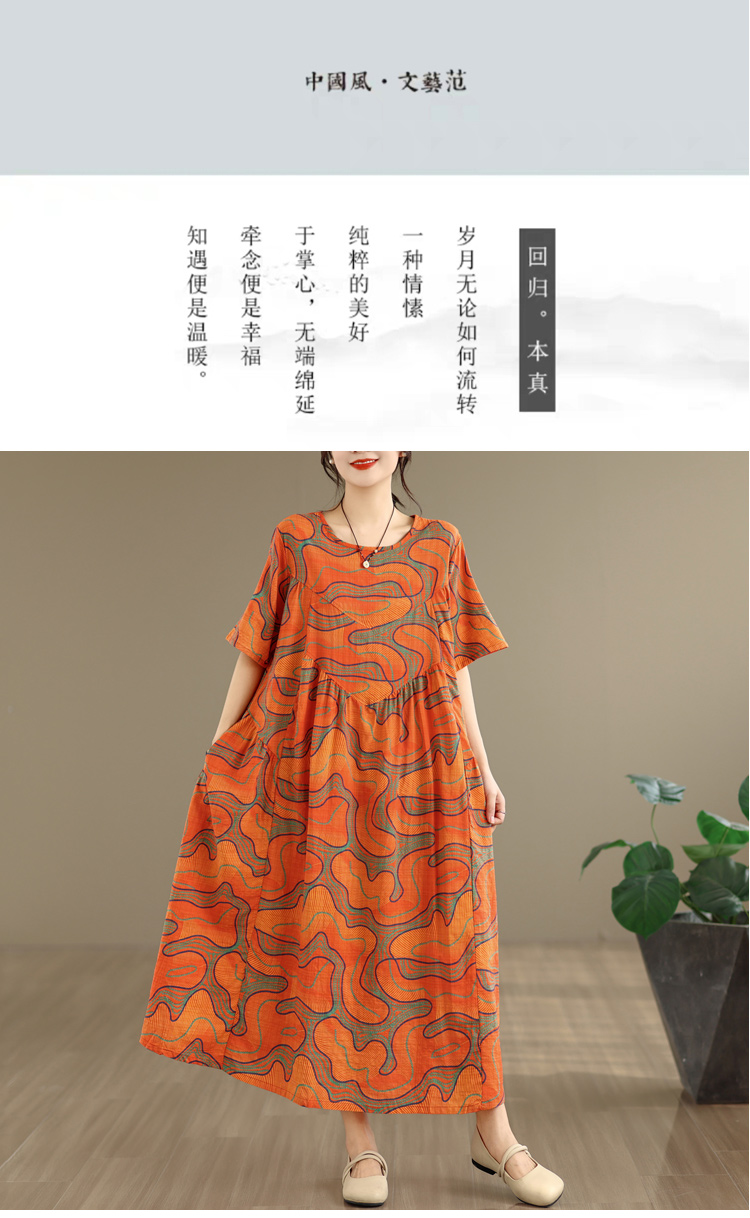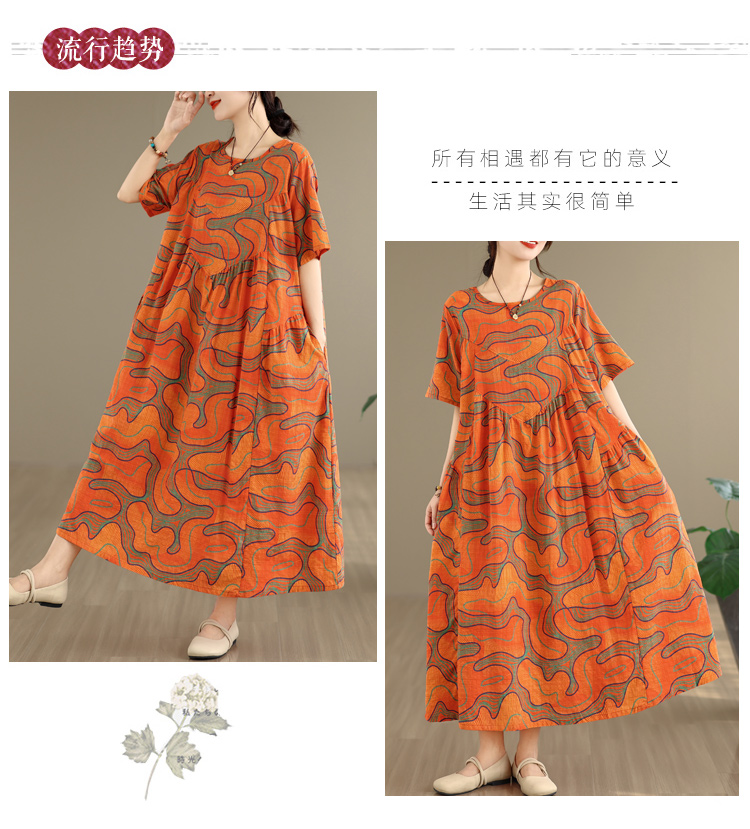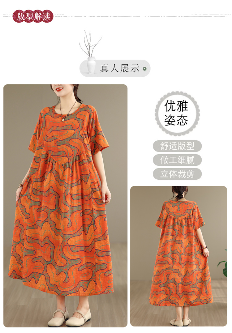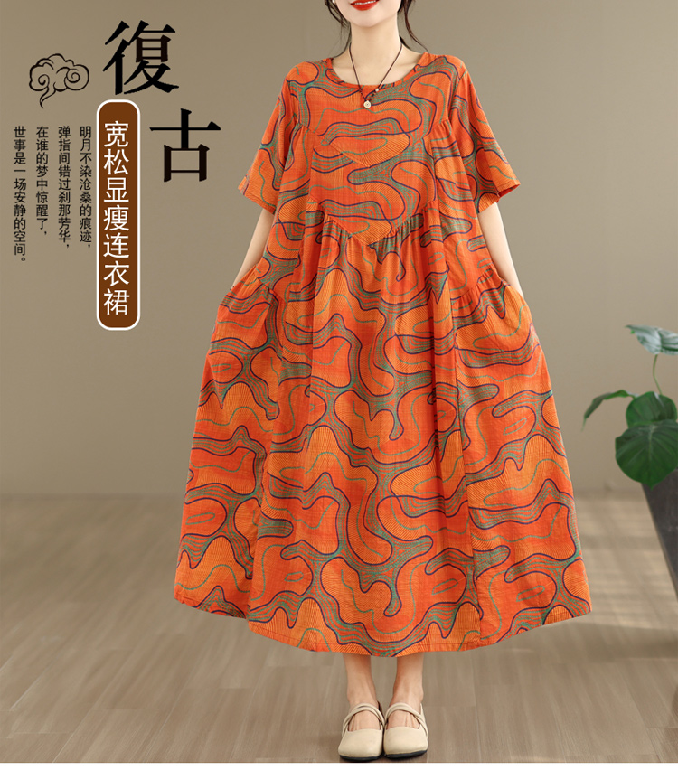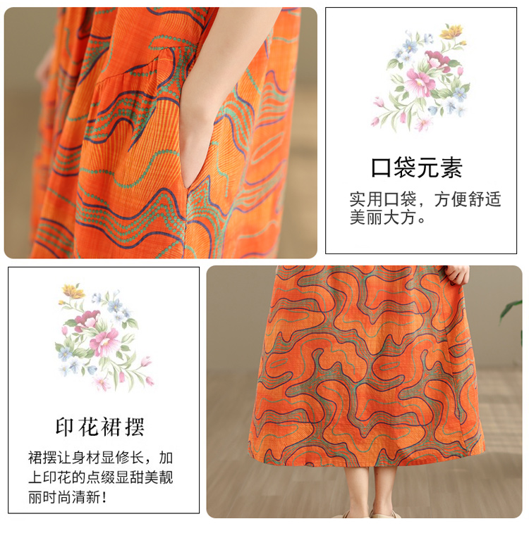 RY3273# 实拍2026夏季新款复古棉麻圆领花口袋短袖连衣裙女宽松显瘦A字裙