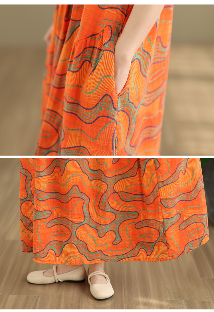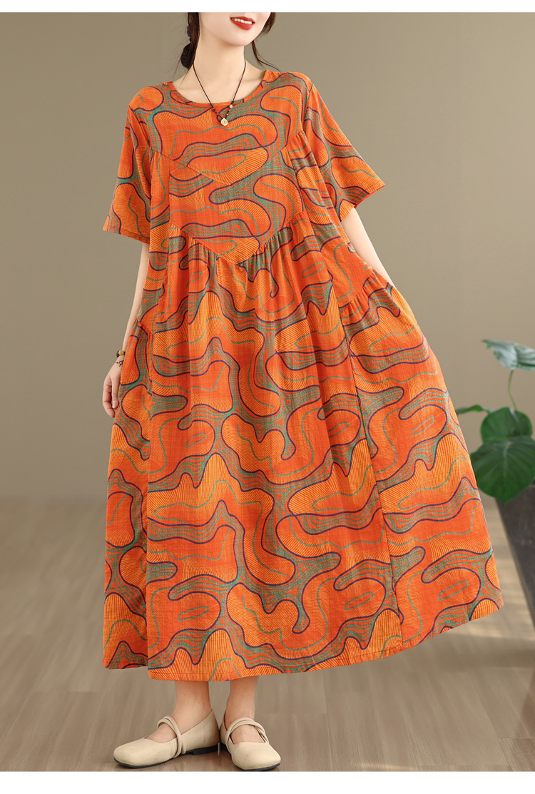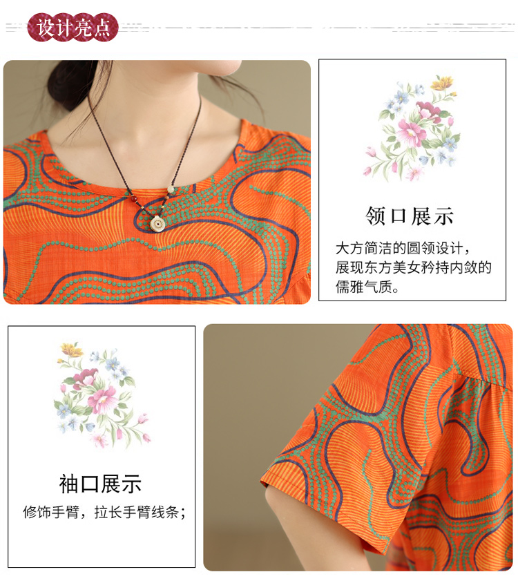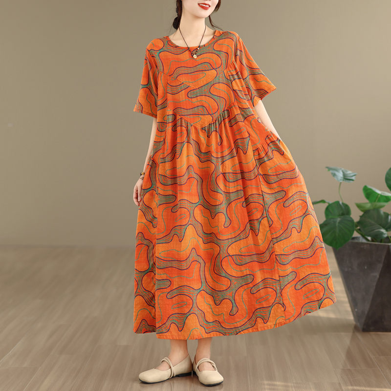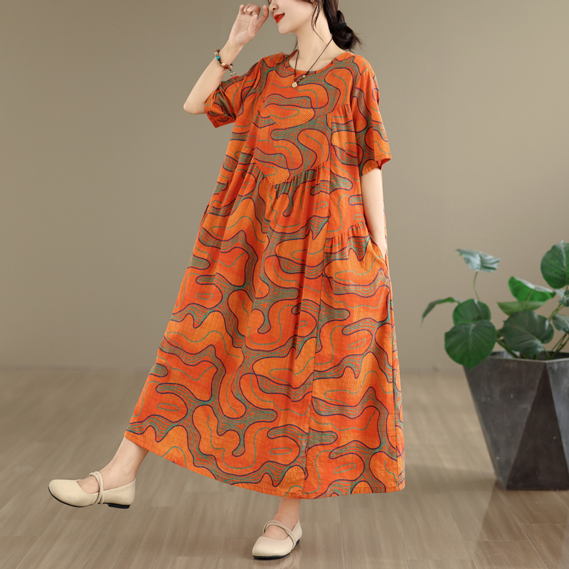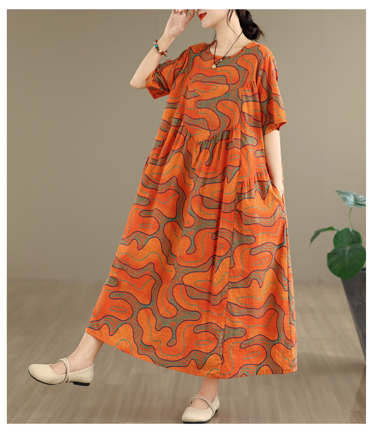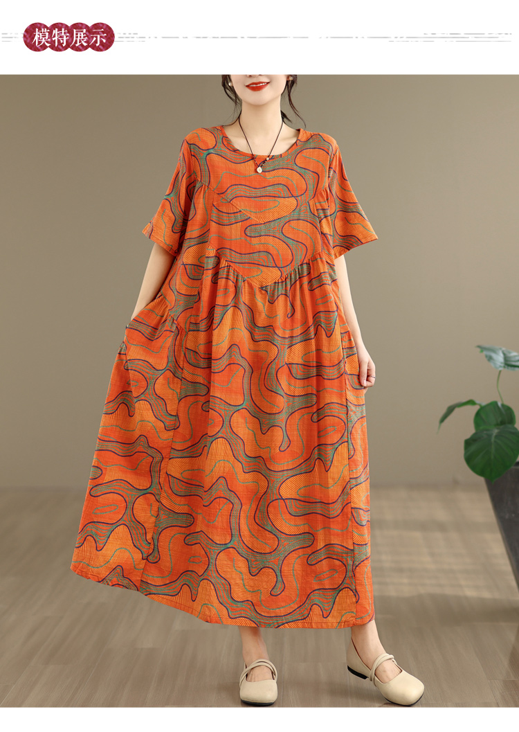 RY3273# 实拍2026夏季新款复古棉麻圆领花口袋短袖连衣裙女宽松显瘦A字裙