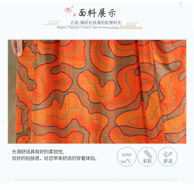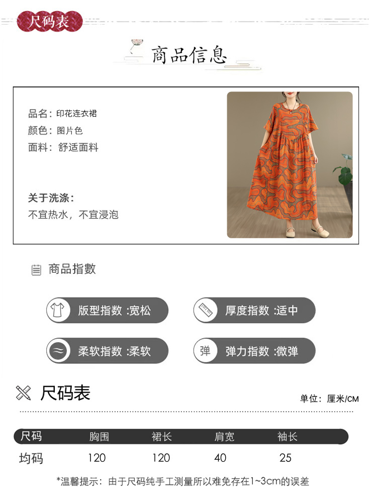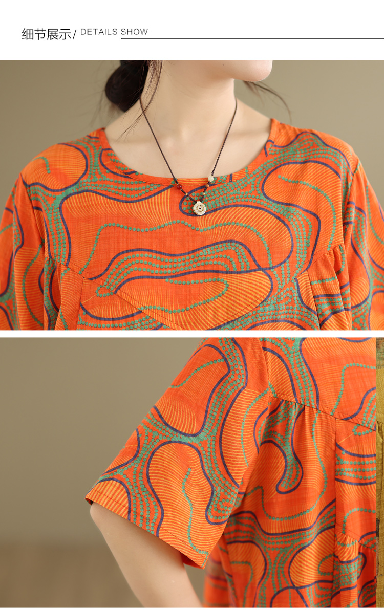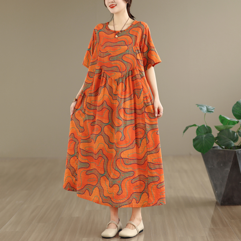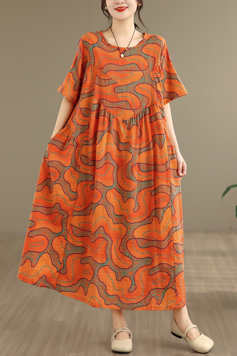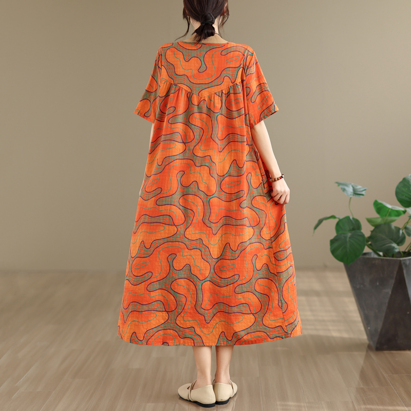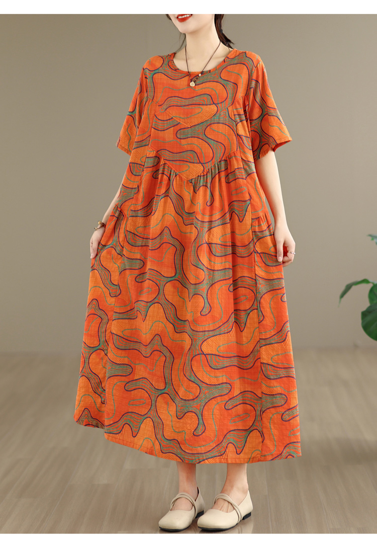 RY3273# 实拍2026夏季新款复古棉麻圆领花口袋短袖连衣裙女宽松显瘦A字裙