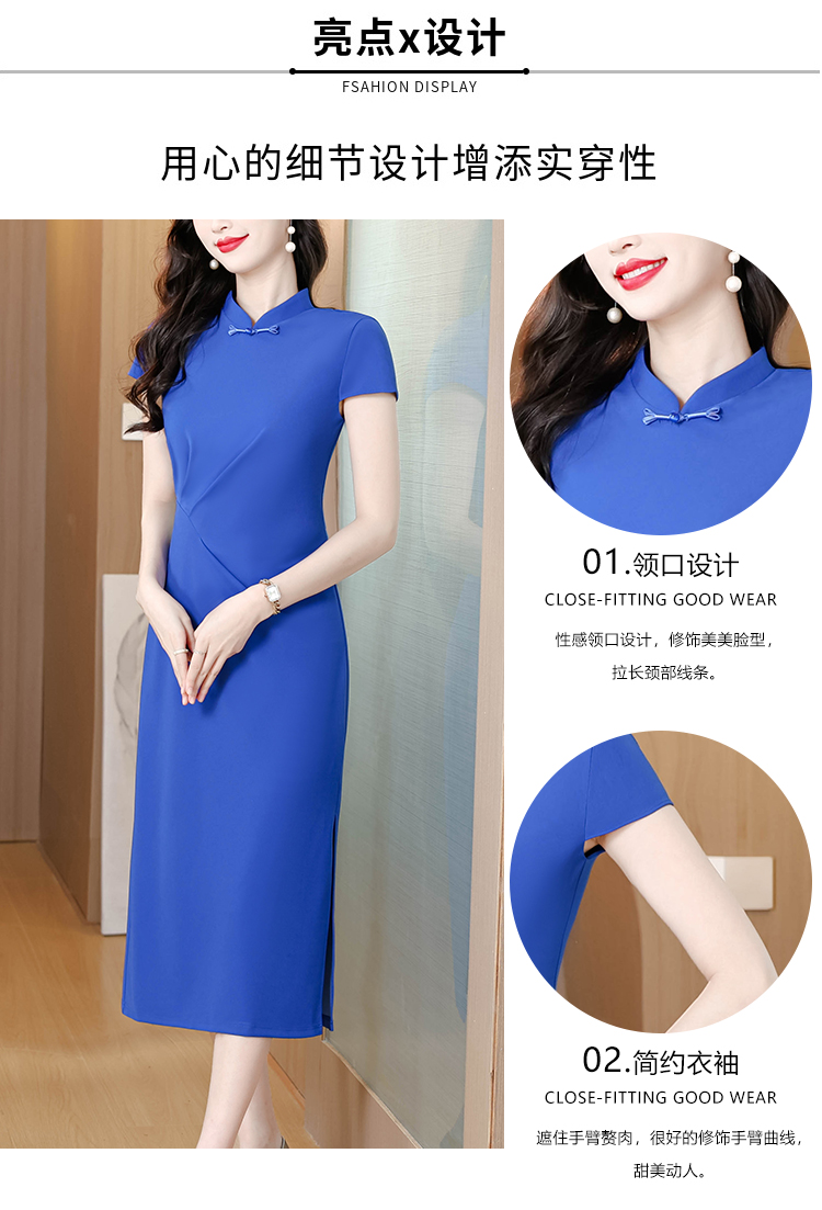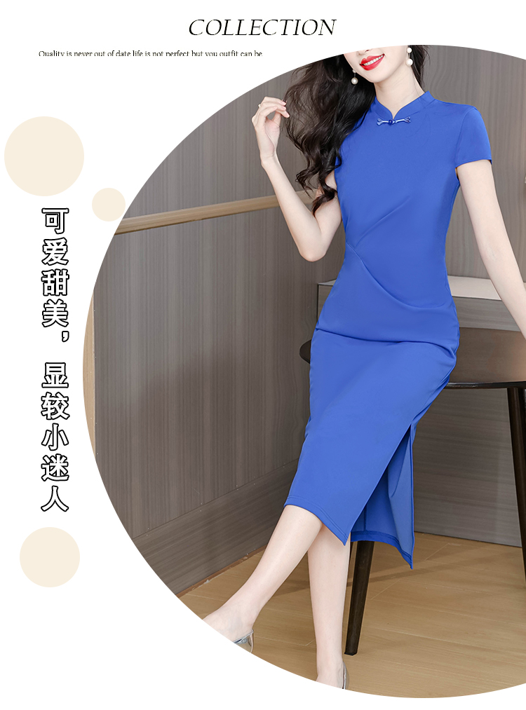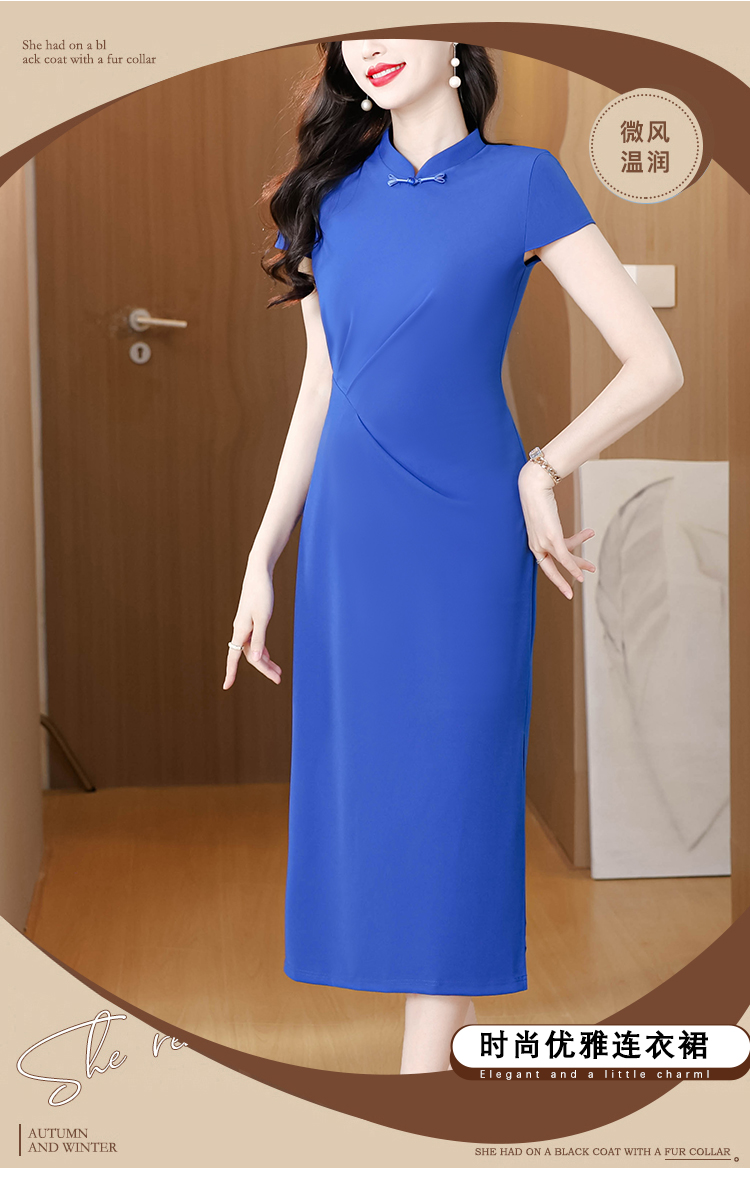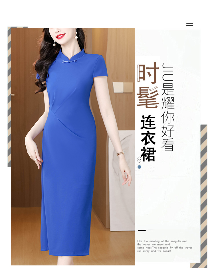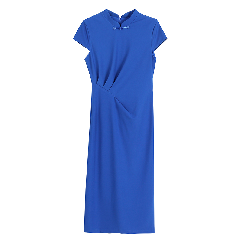RY3288# 国风蓝色褶皱收腰连衣裙女夏新中式立领修身针织旗袍裙