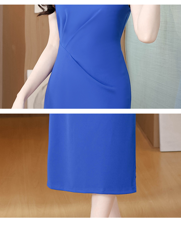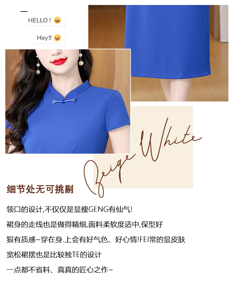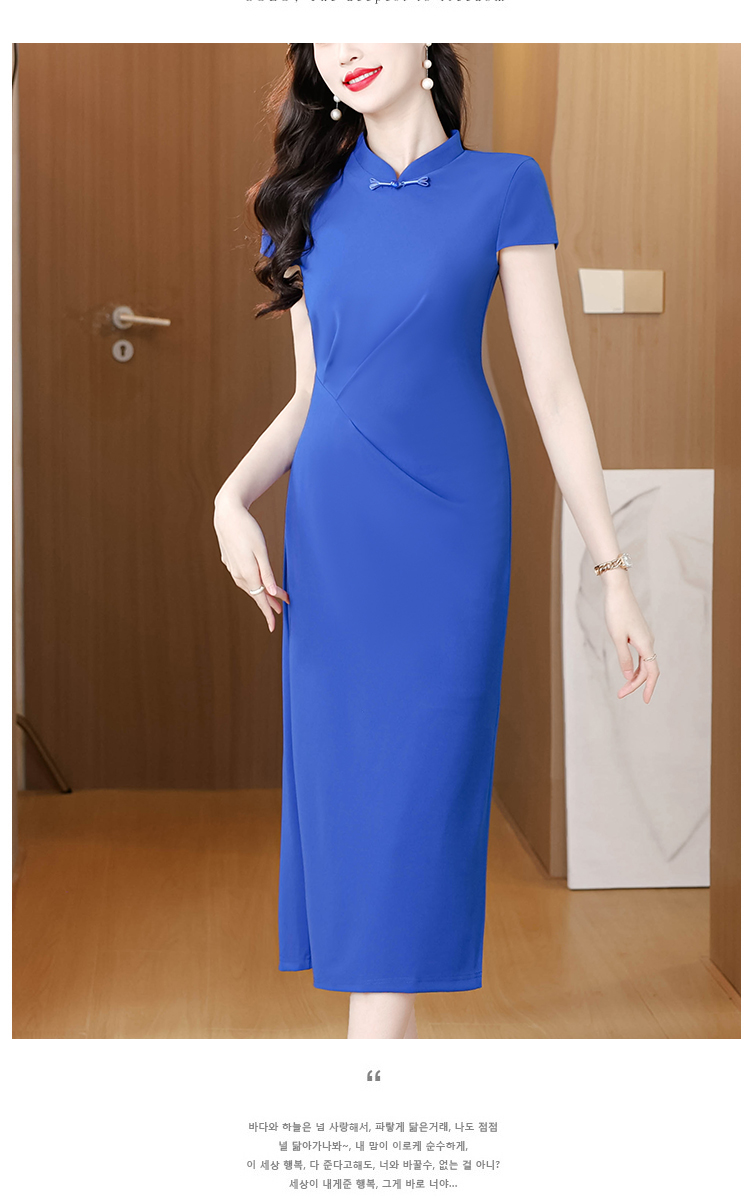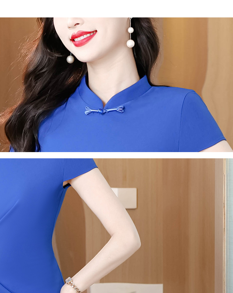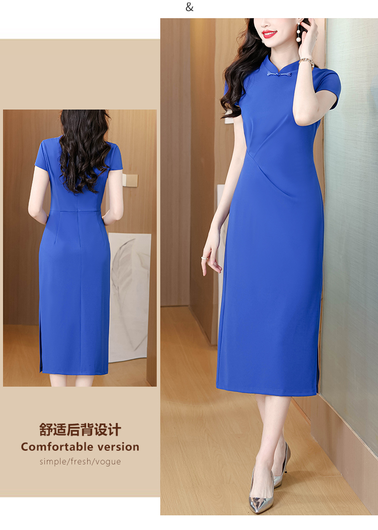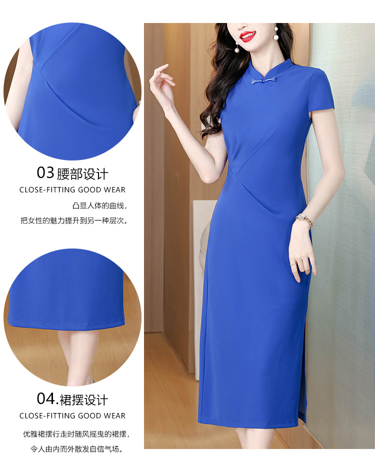 RY3288# 国风蓝色褶皱收腰连衣裙女夏新中式立领修身针织旗袍裙