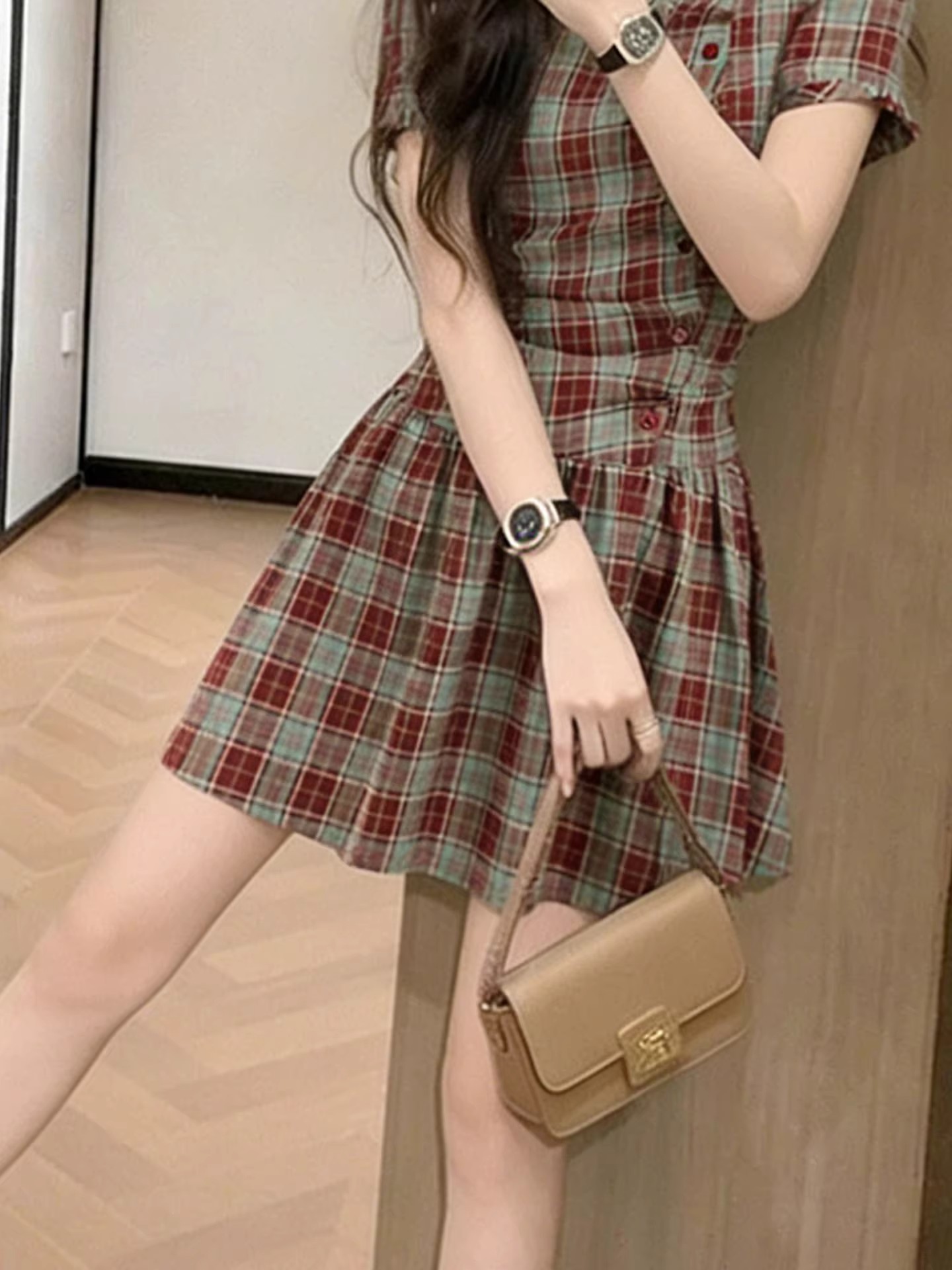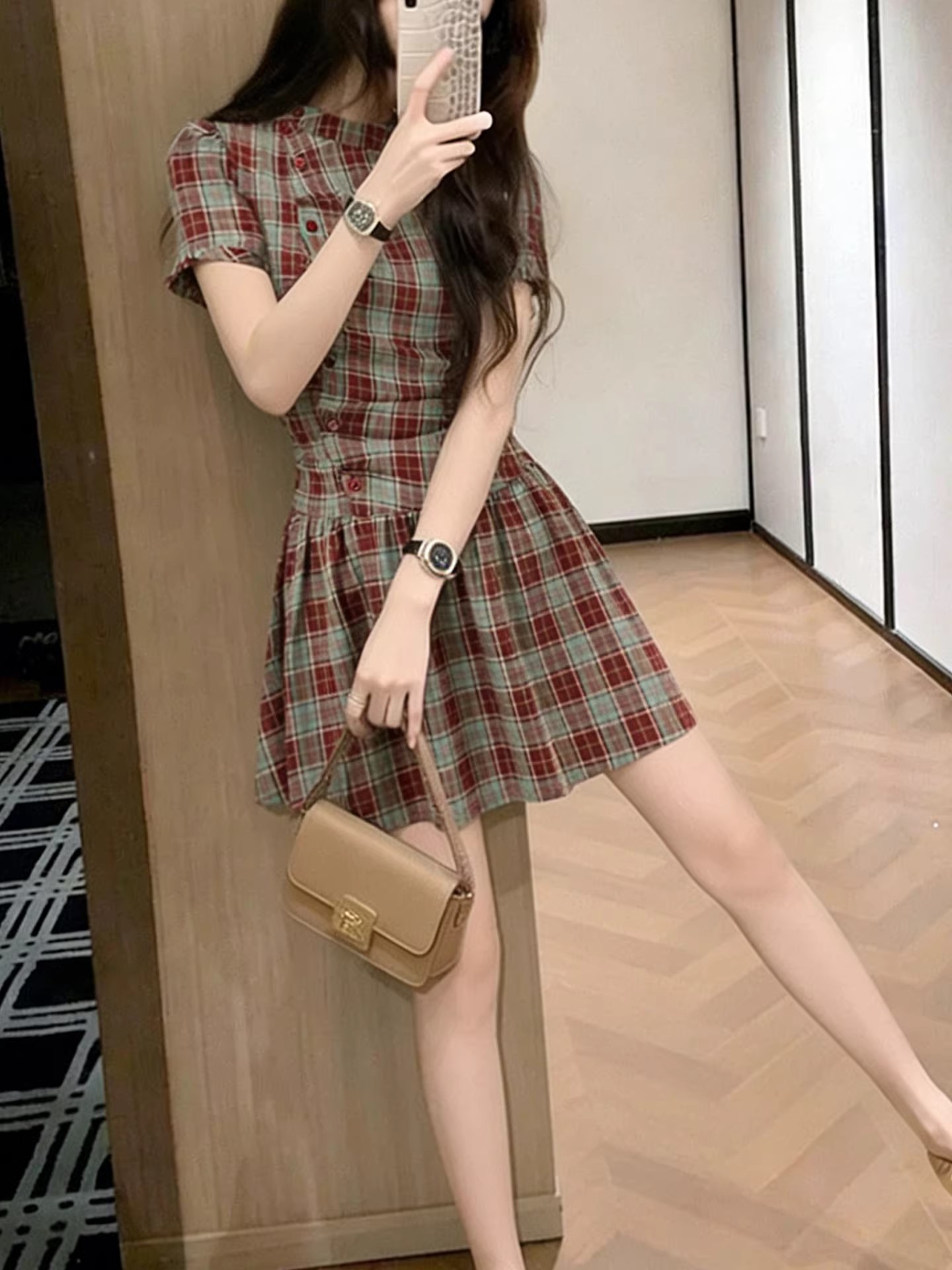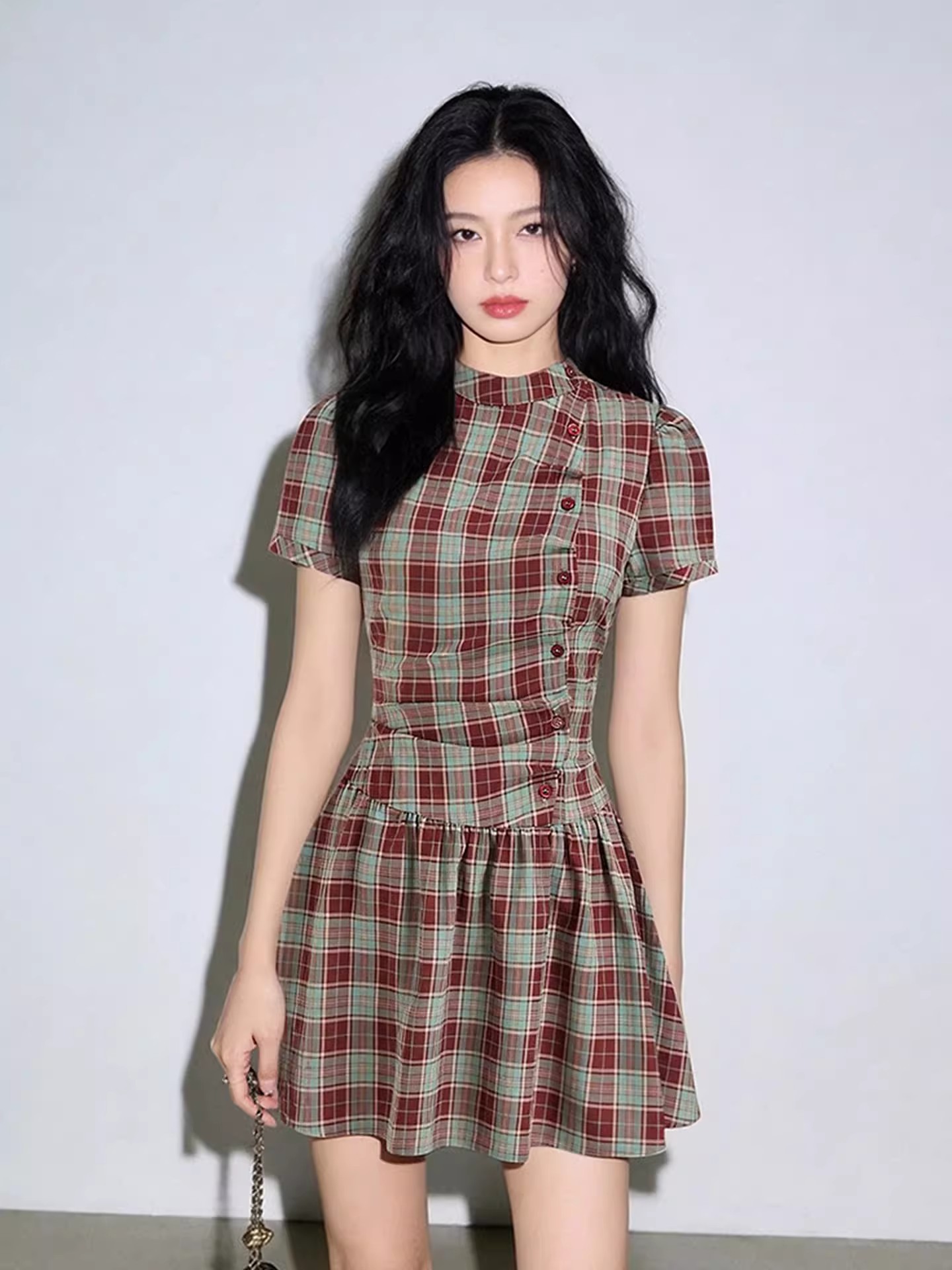 RY3299# 复古酒红色格纹收腰连衣裙女时尚洋气小众斜扣设计感a字短袖裙子