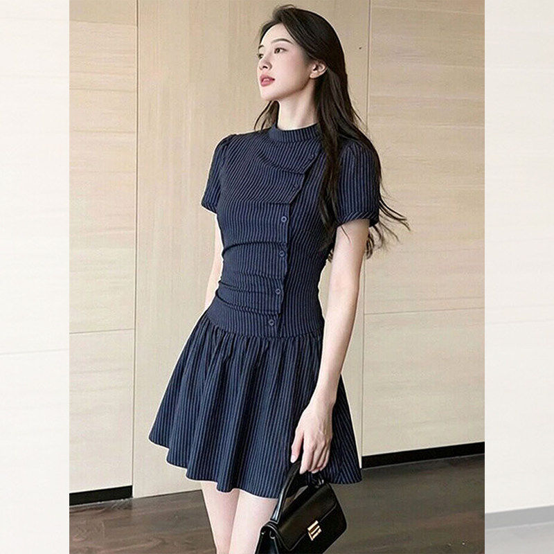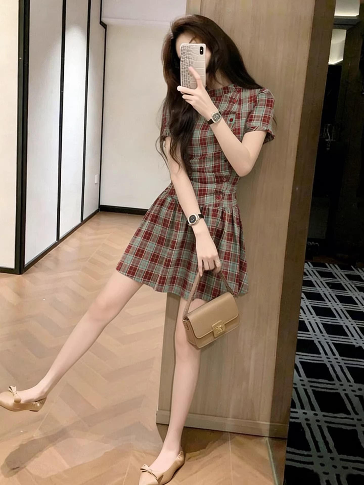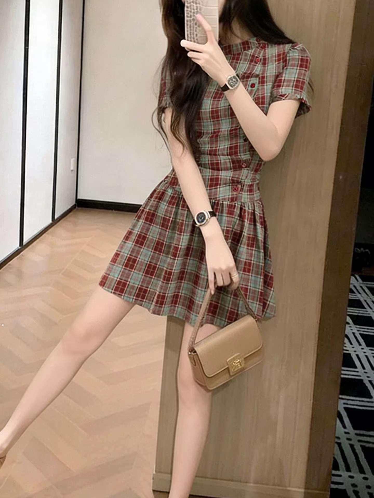 RY3299# 复古酒红色格纹收腰连衣裙女时尚洋气小众斜扣设计感a字短袖裙子