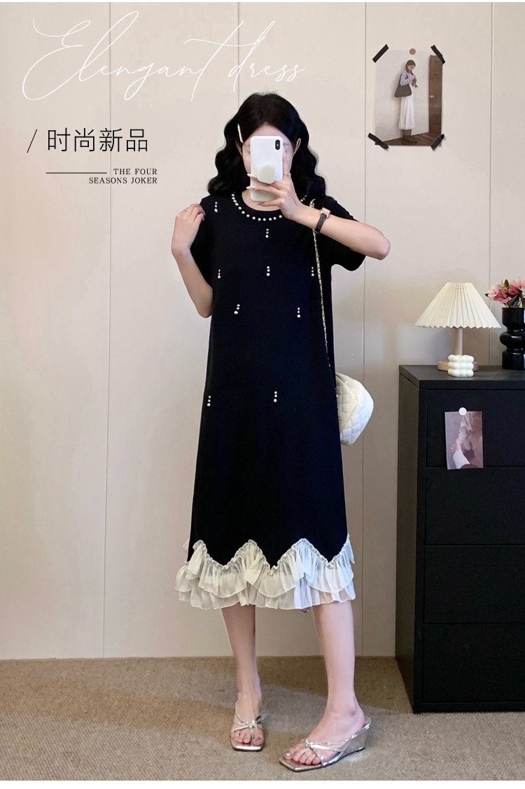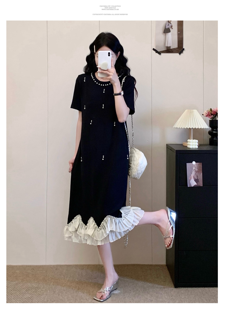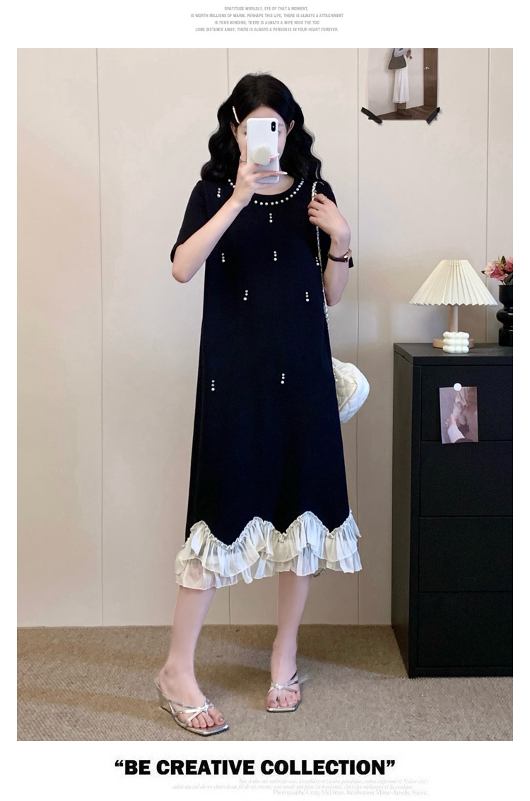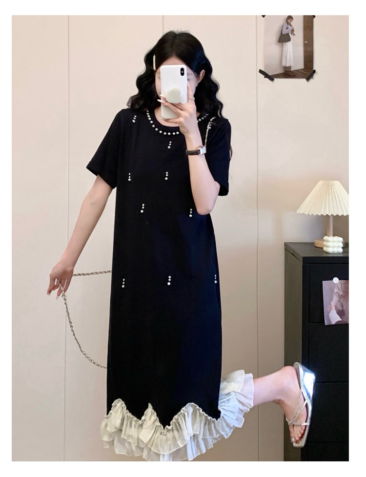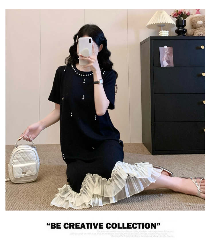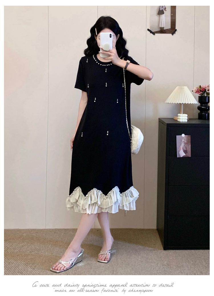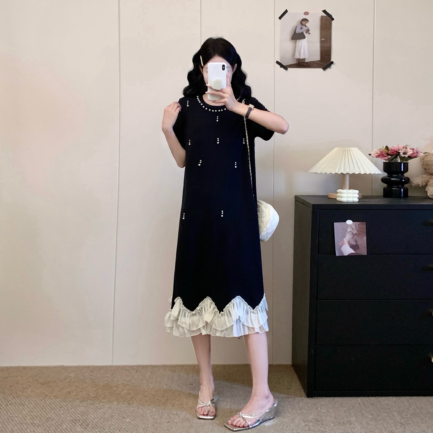 RY3303# 实拍设计感重工连衣裙大码胖MM女夏季圆领宽松显瘦花边裙