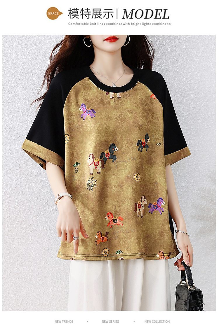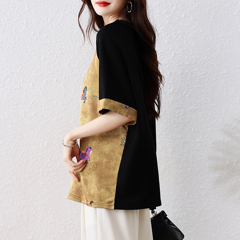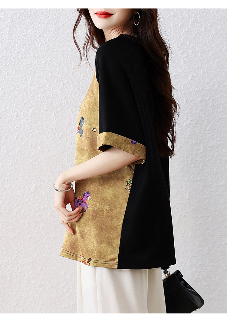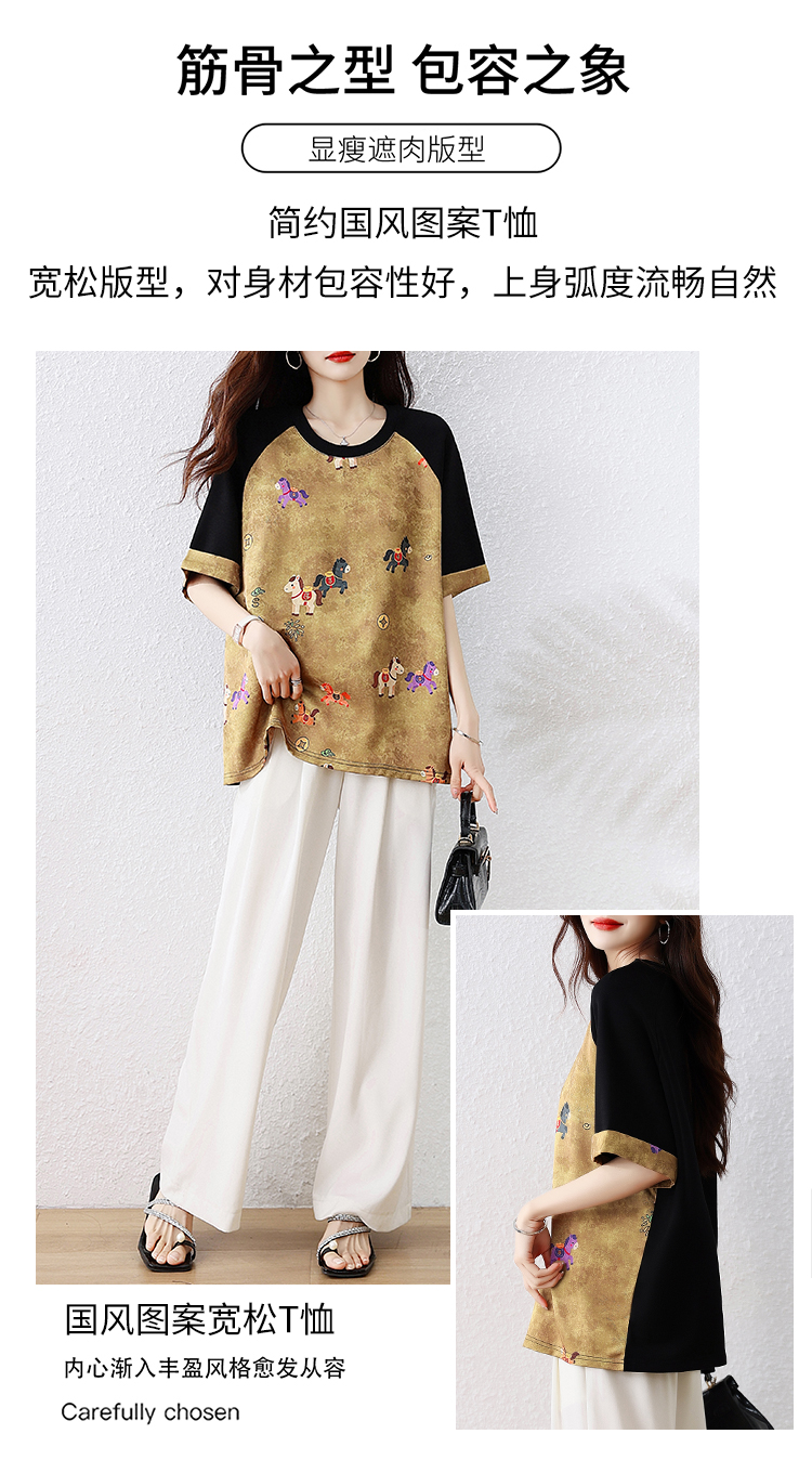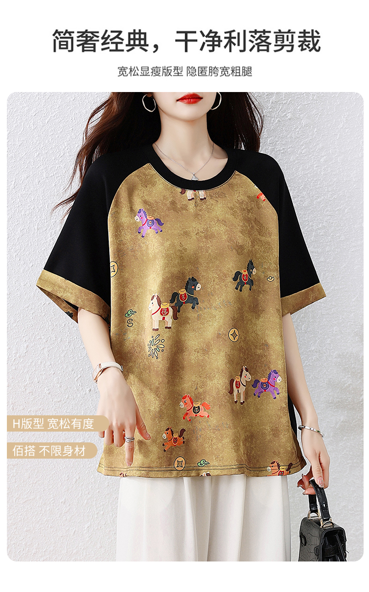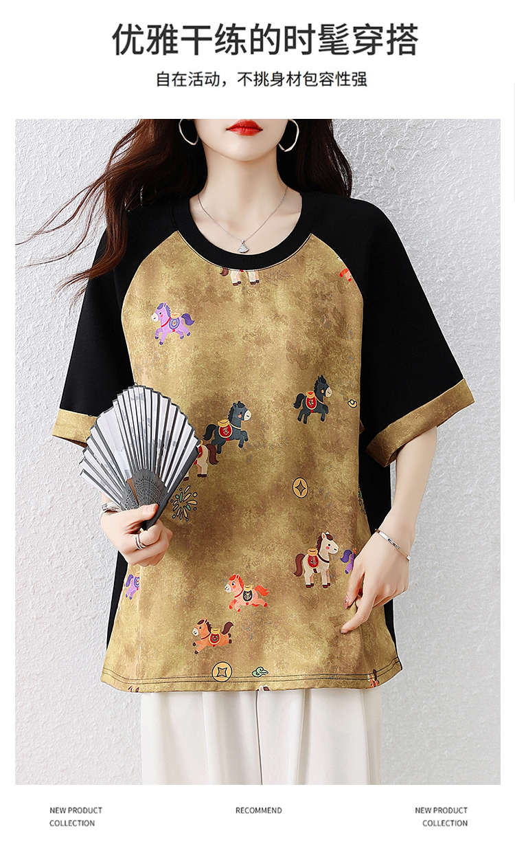 RY3312# 实拍2026夏季新款大码时尚宽松显瘦国风拼接提花撞色印花T恤上衣