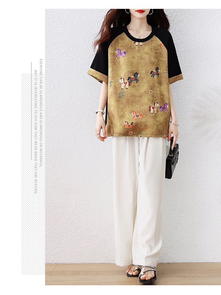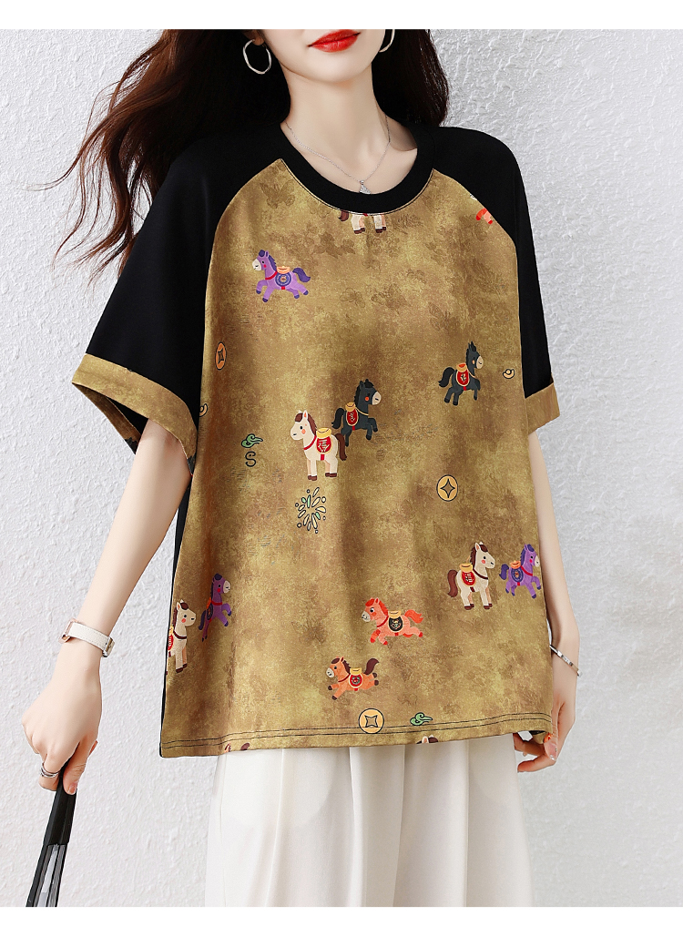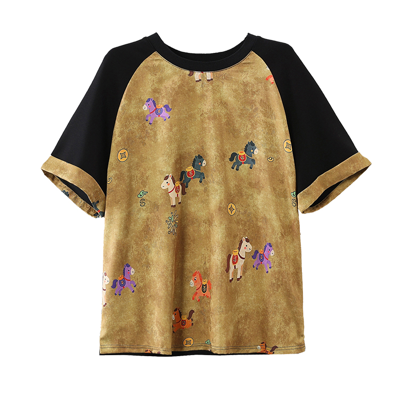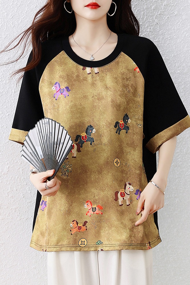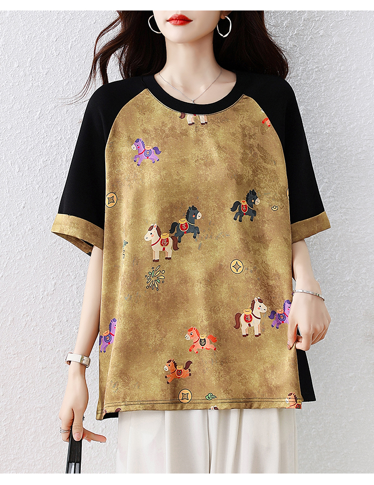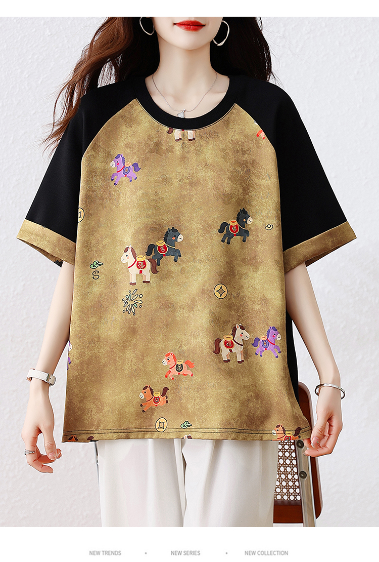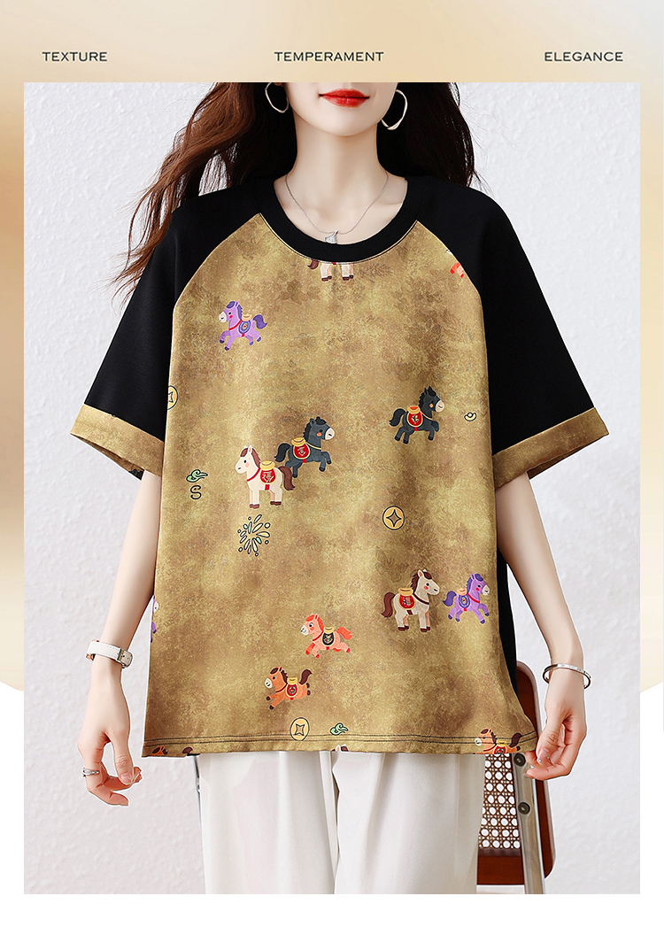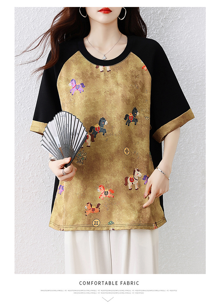 RY3312# 实拍2026夏季新款大码时尚宽松显瘦国风拼接提花撞色印花T恤上衣
