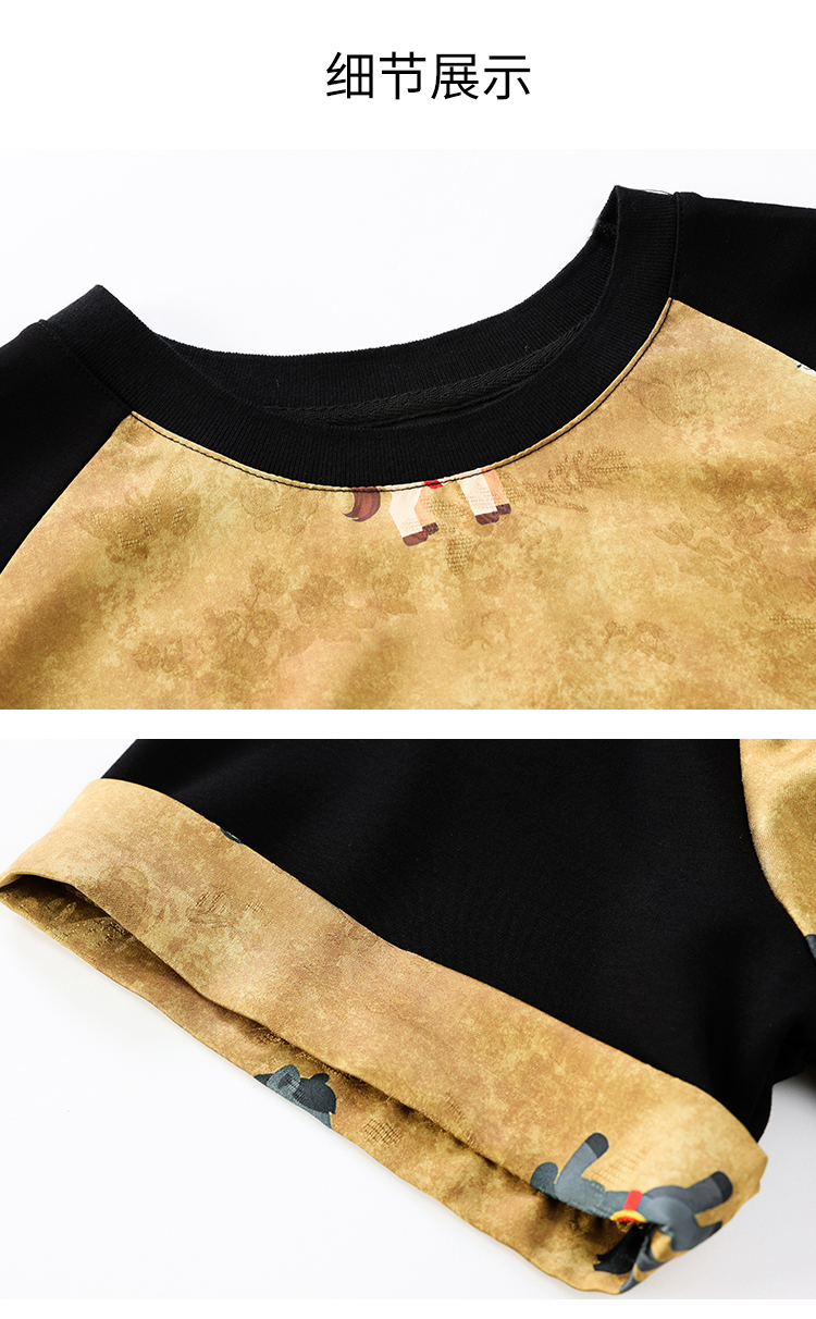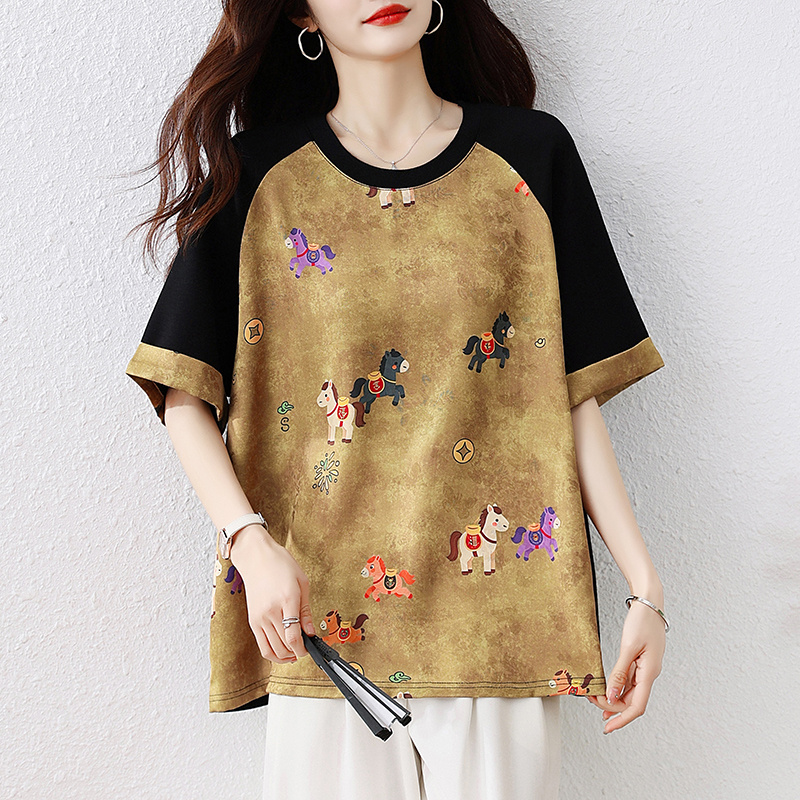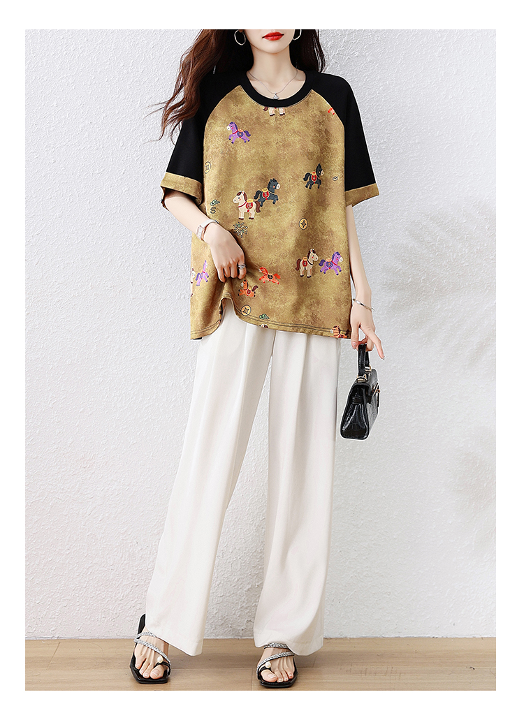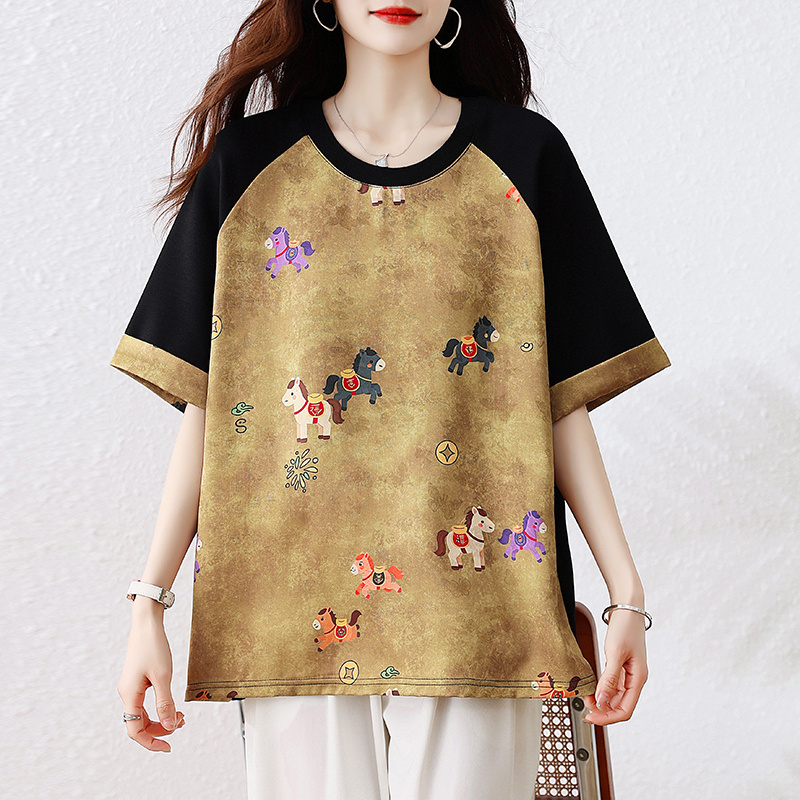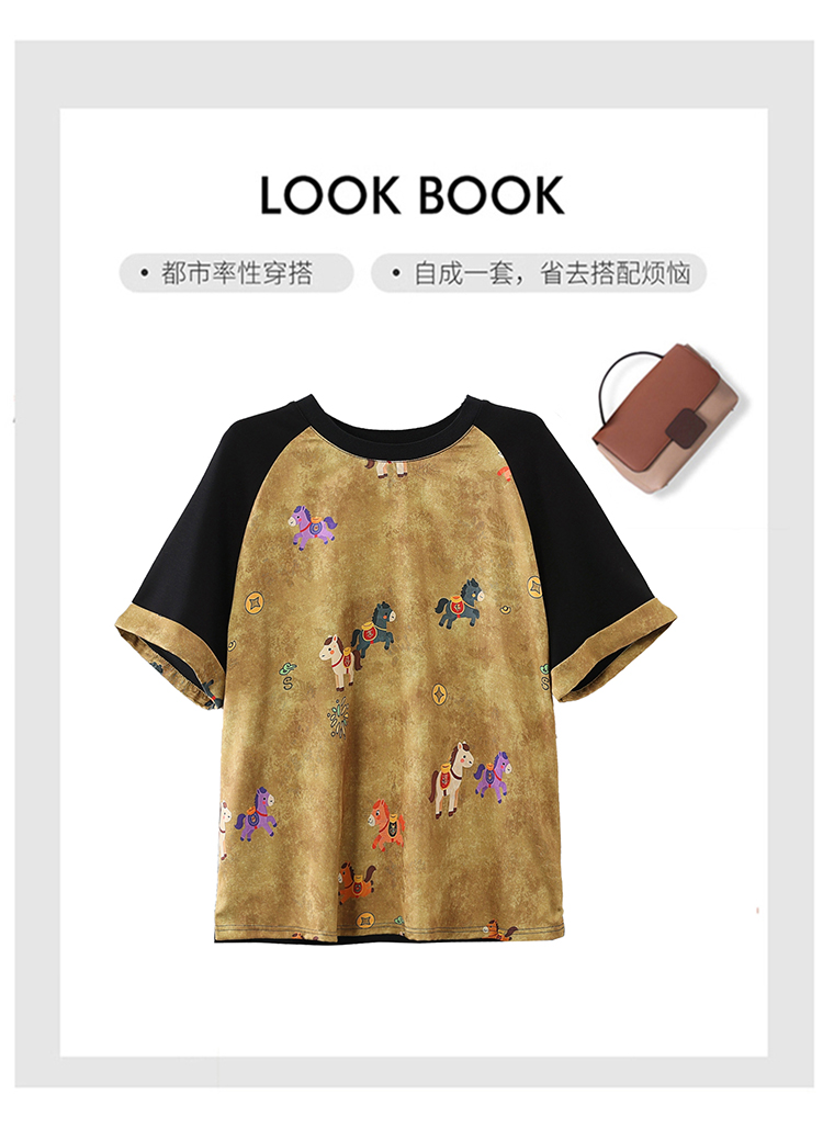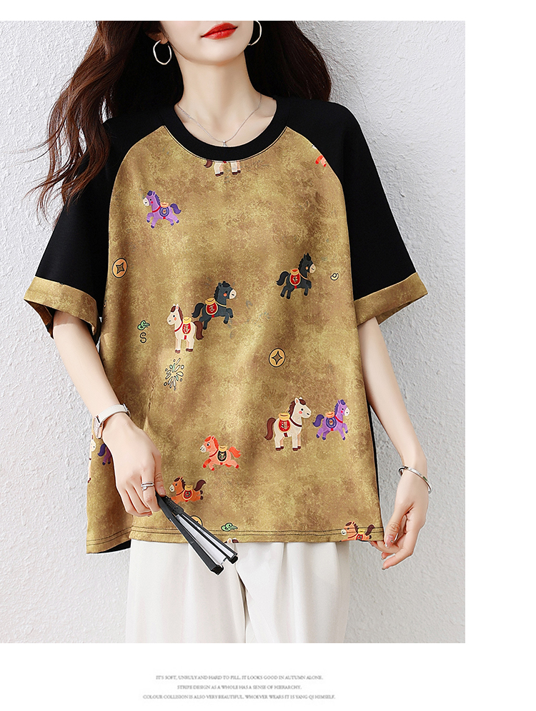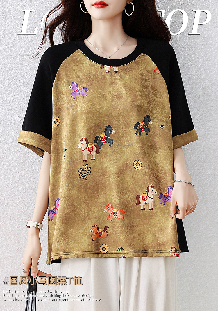 RY3312# 实拍2026夏季新款大码时尚宽松显瘦国风拼接提花撞色印花T恤上衣