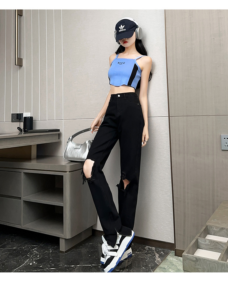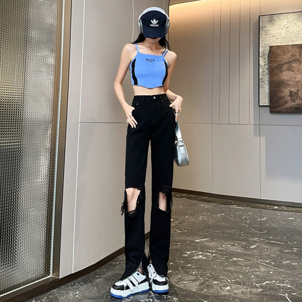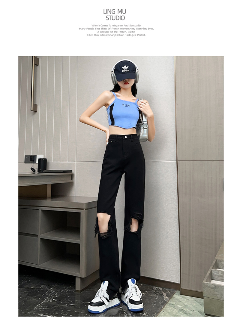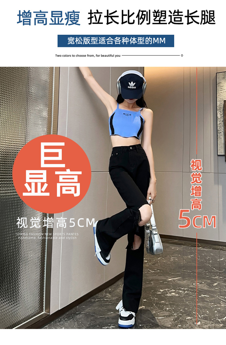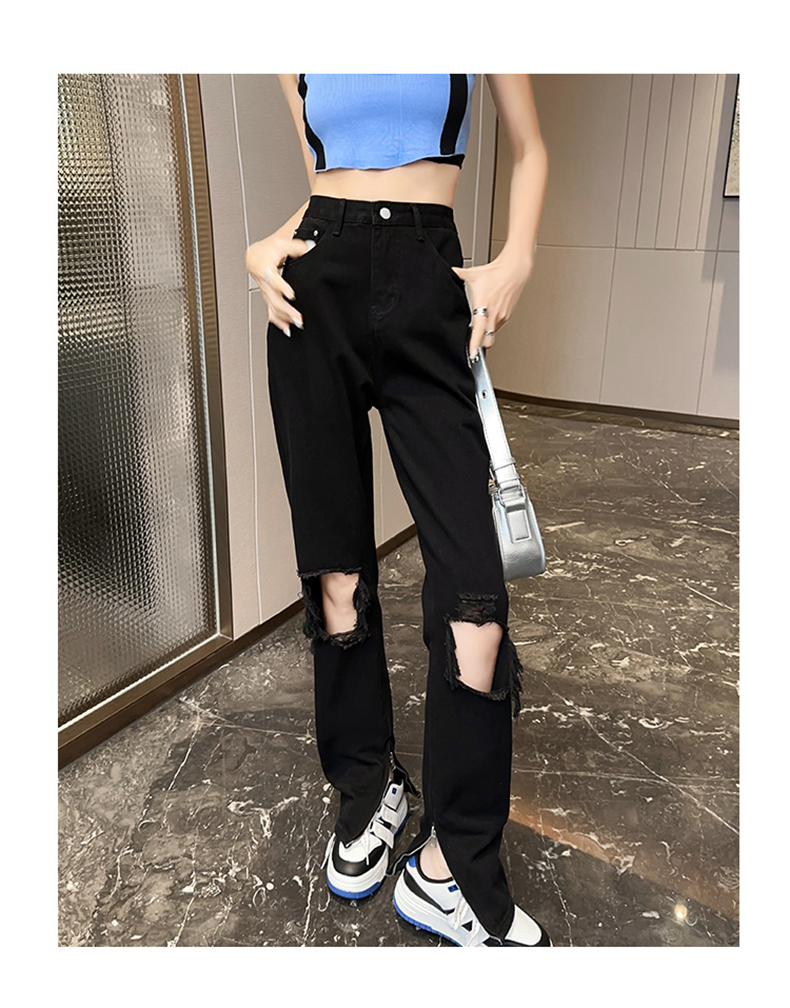 RM7781#黑色破洞牛仔裤女宽松高腰显瘦美式高街开叉直筒拖地长裤子