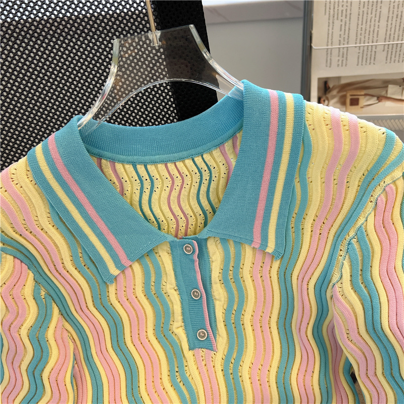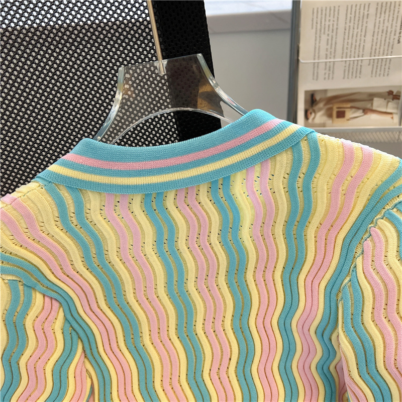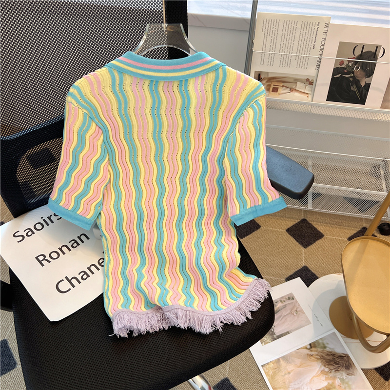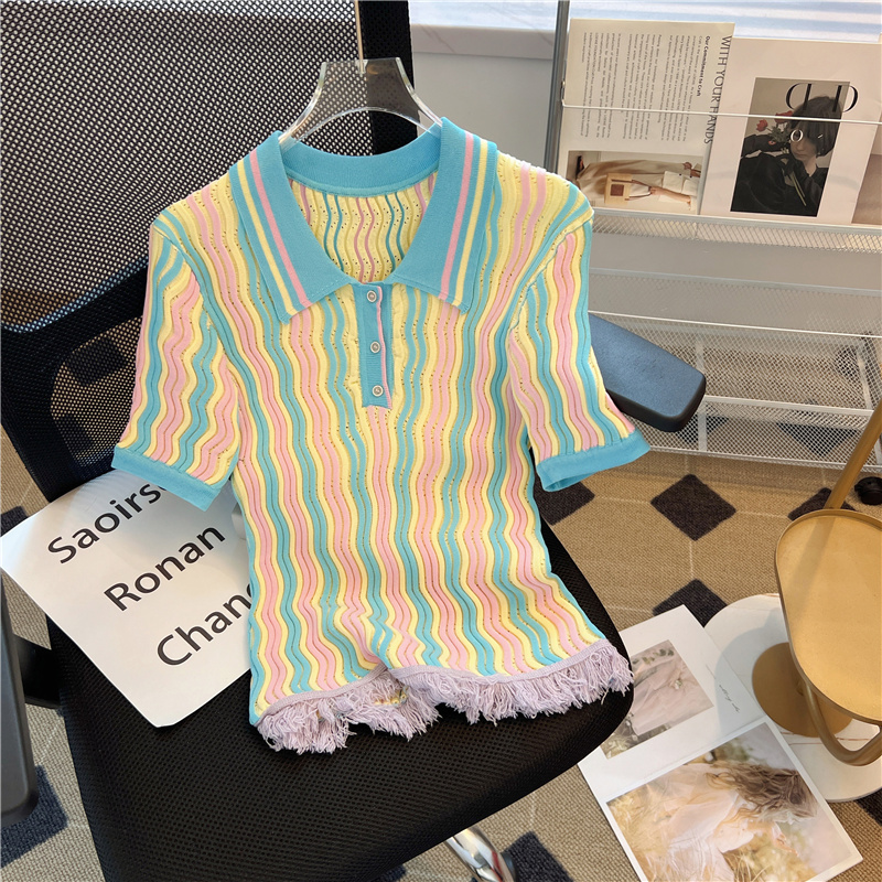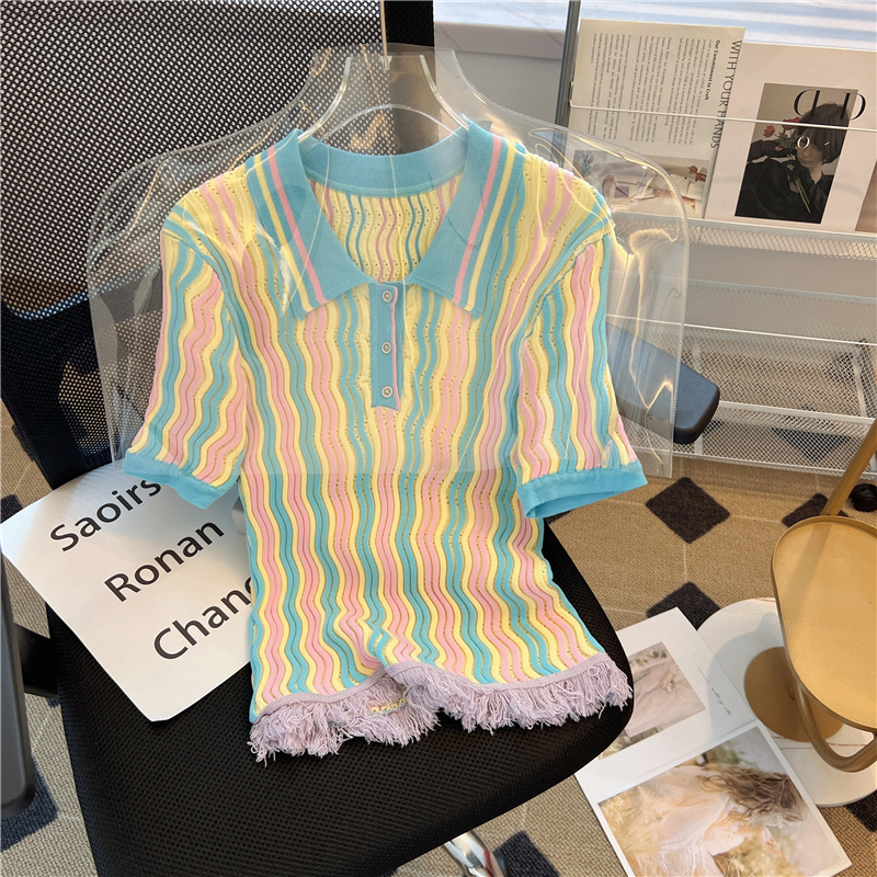 RM18571#甜美撞色条纹Polo领针织短袖女2023夏季新款法式别致流苏上衣