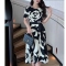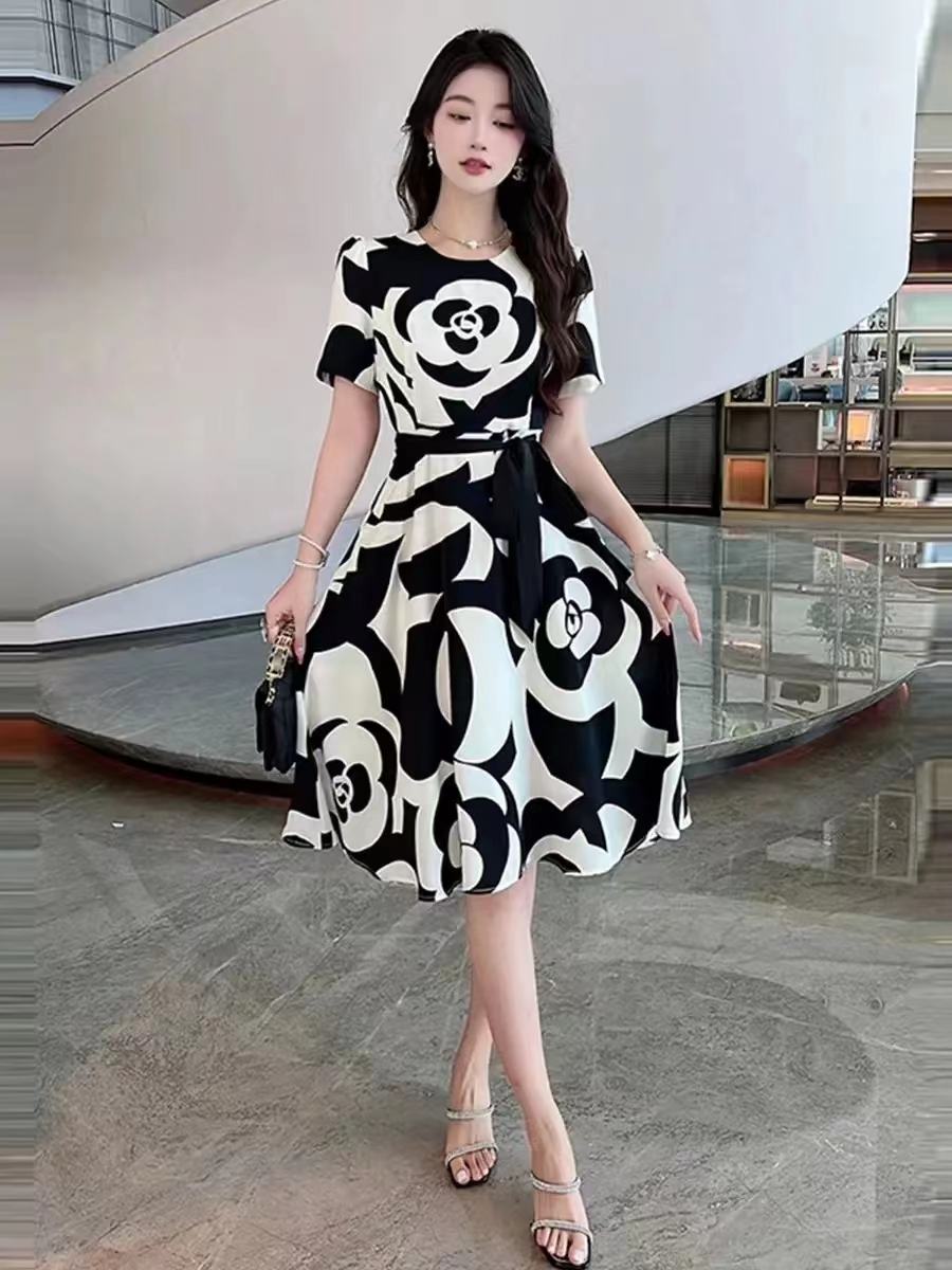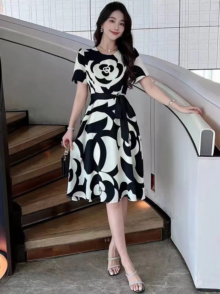 RM19313#大码女装夏季新款2023山茶花短袖收腰显瘦气质中长款连衣裙