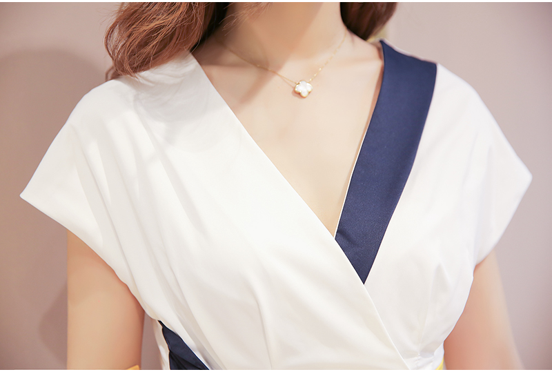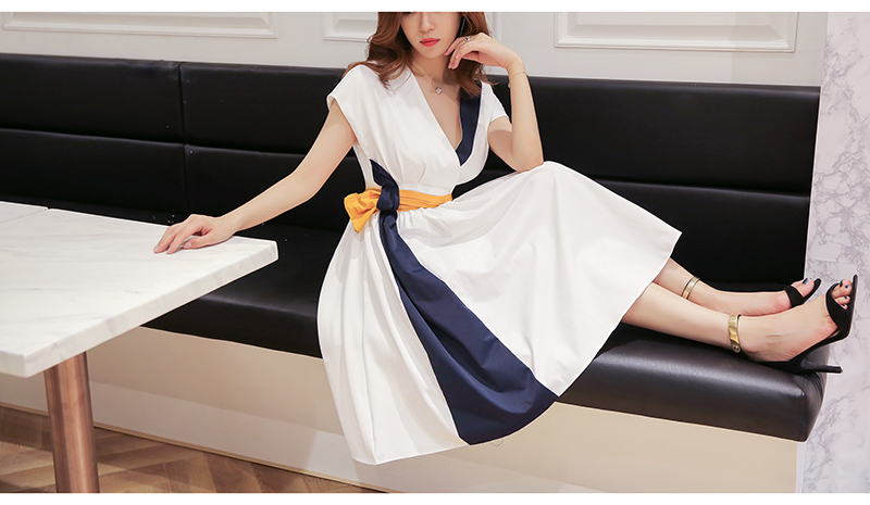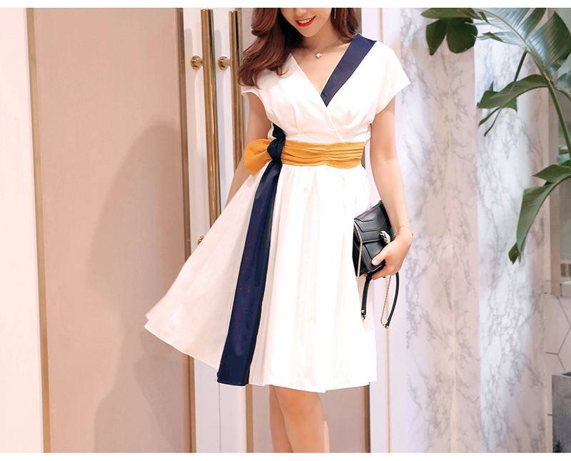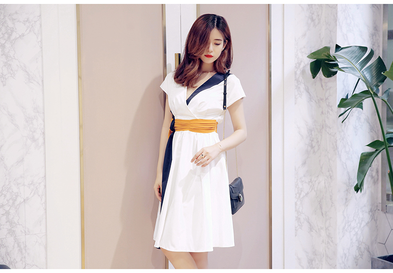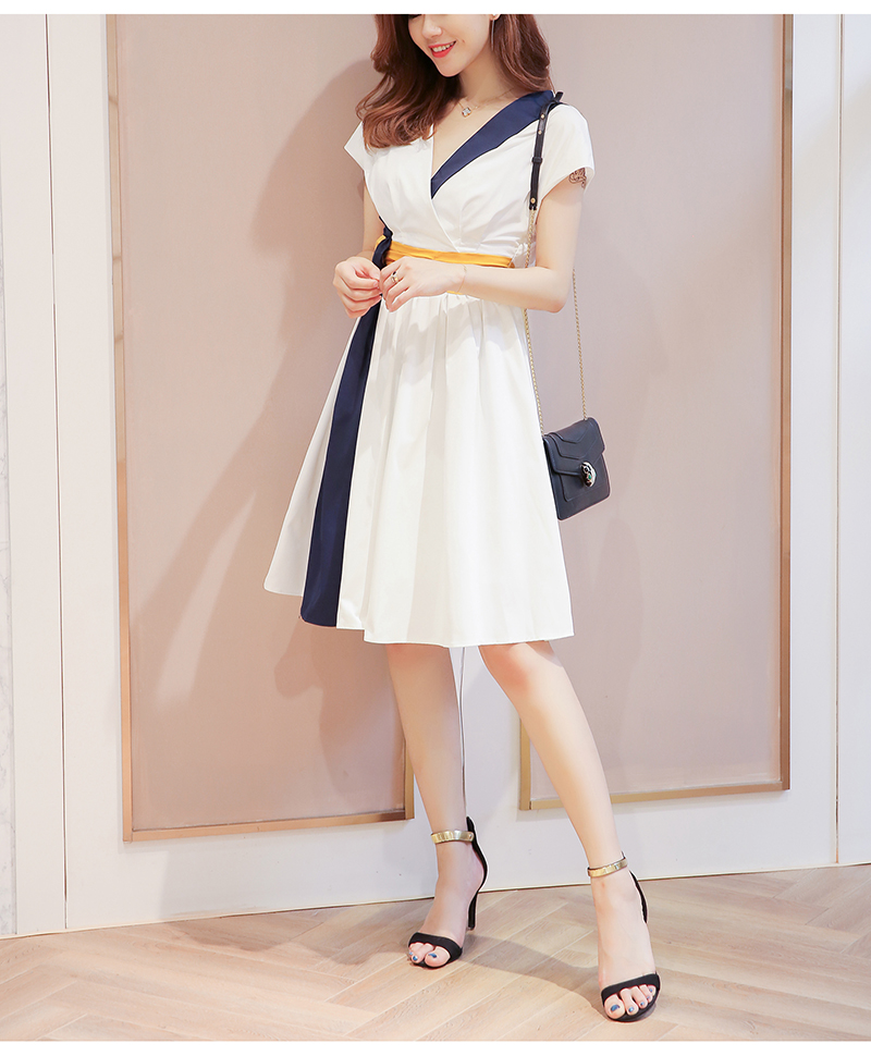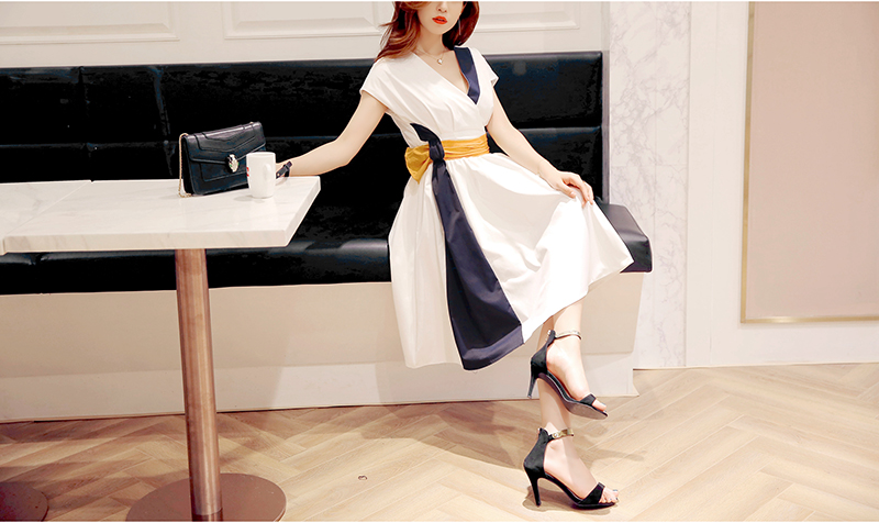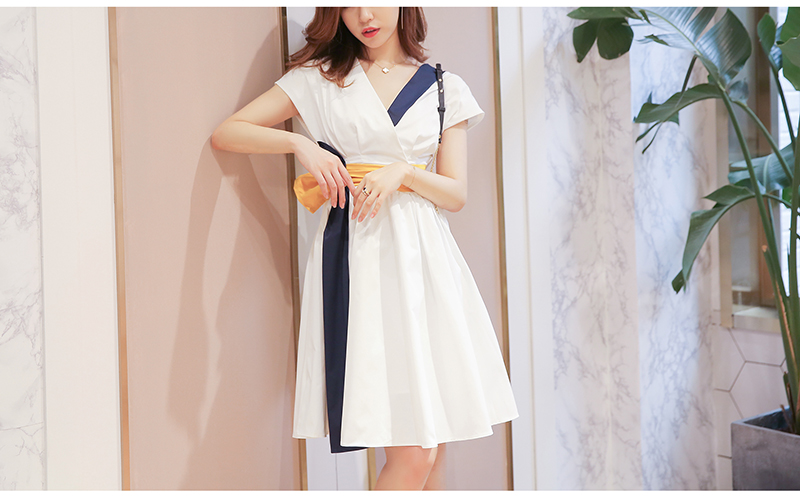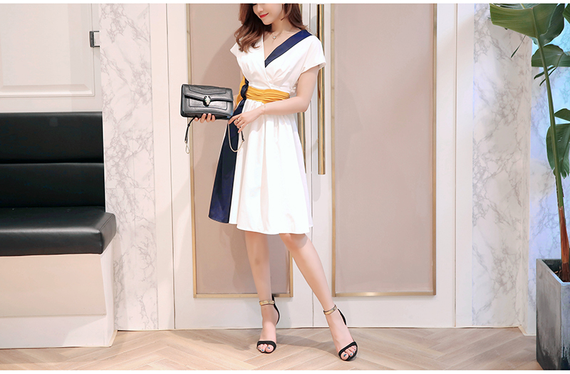 Home > 女装批发-夏款 > 短袖连衣裙 > RM21783#夏装名媛新款职业装修身复古拼色显瘦礼服OL连衣裙子