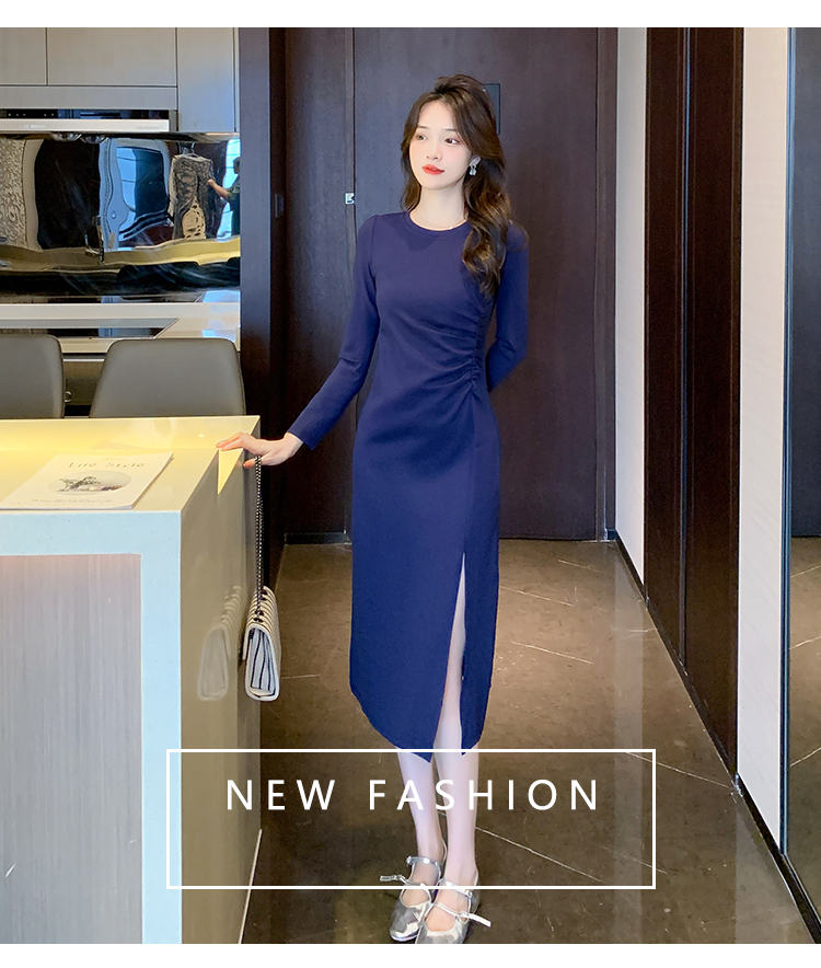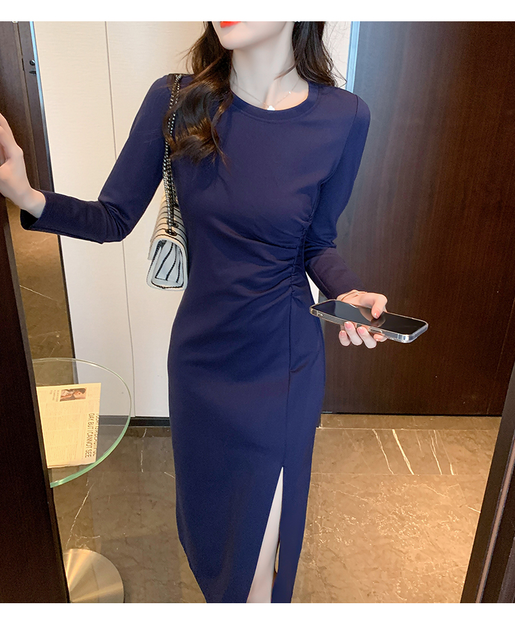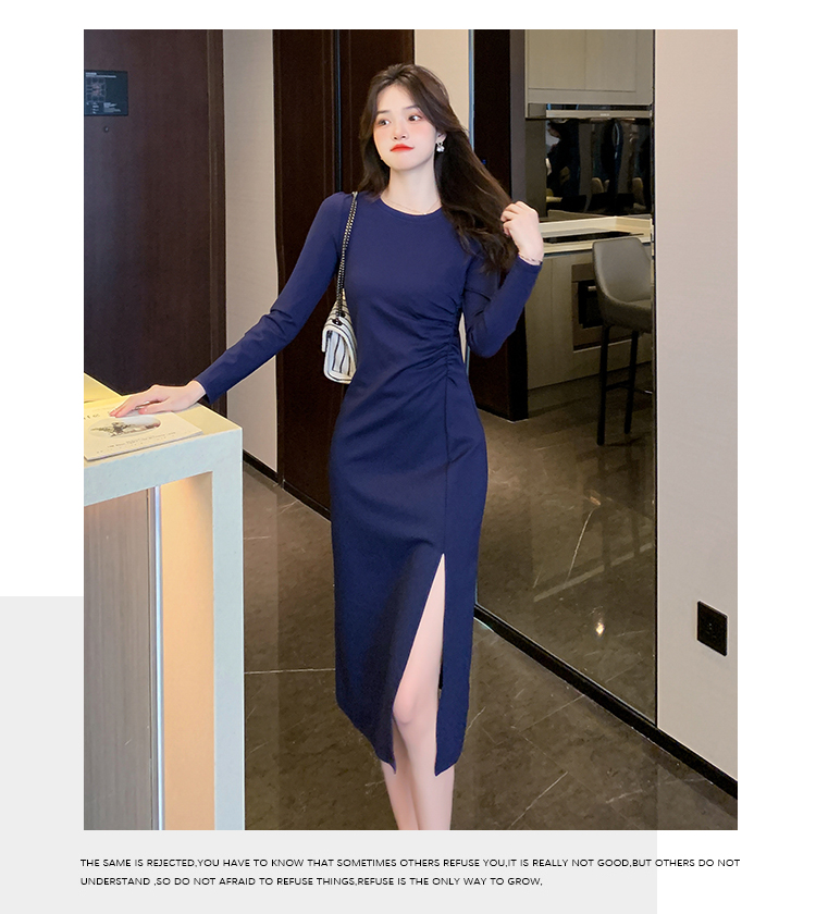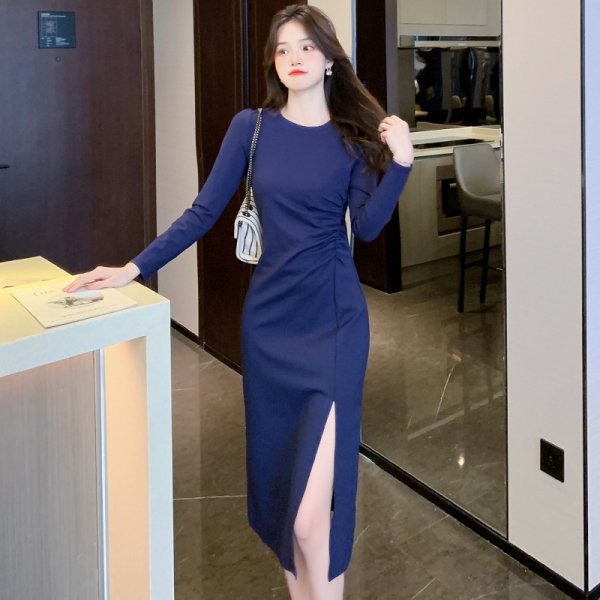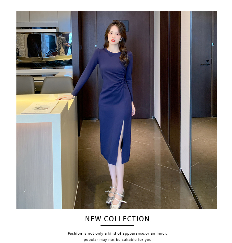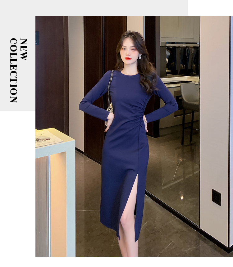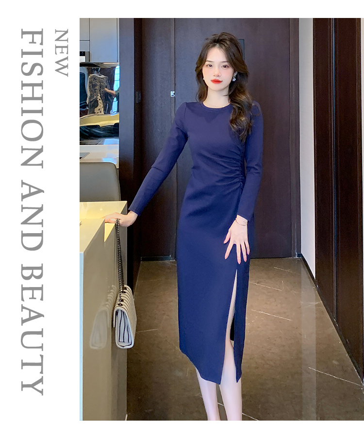 RM22614#藏青色连衣裙2023秋装新款收腰显瘦气质女神范长袖开叉裙