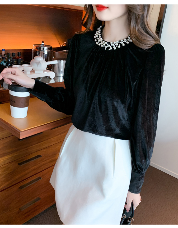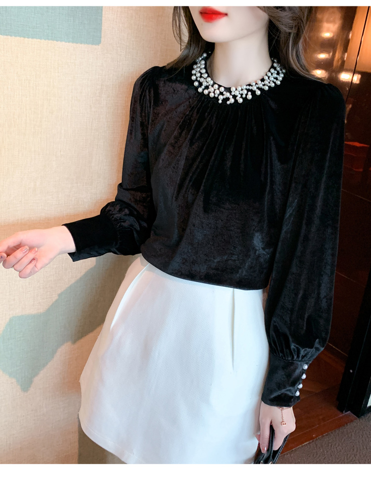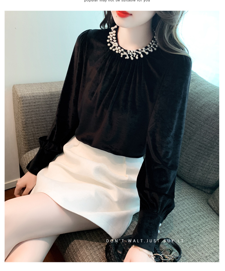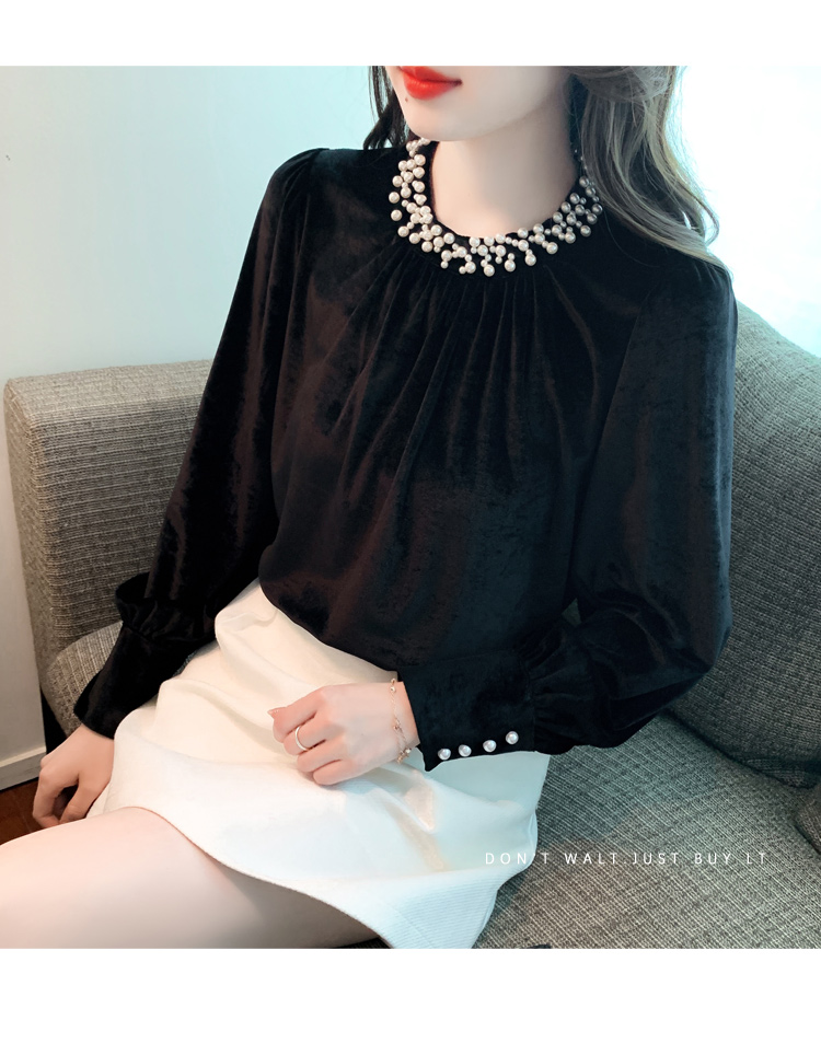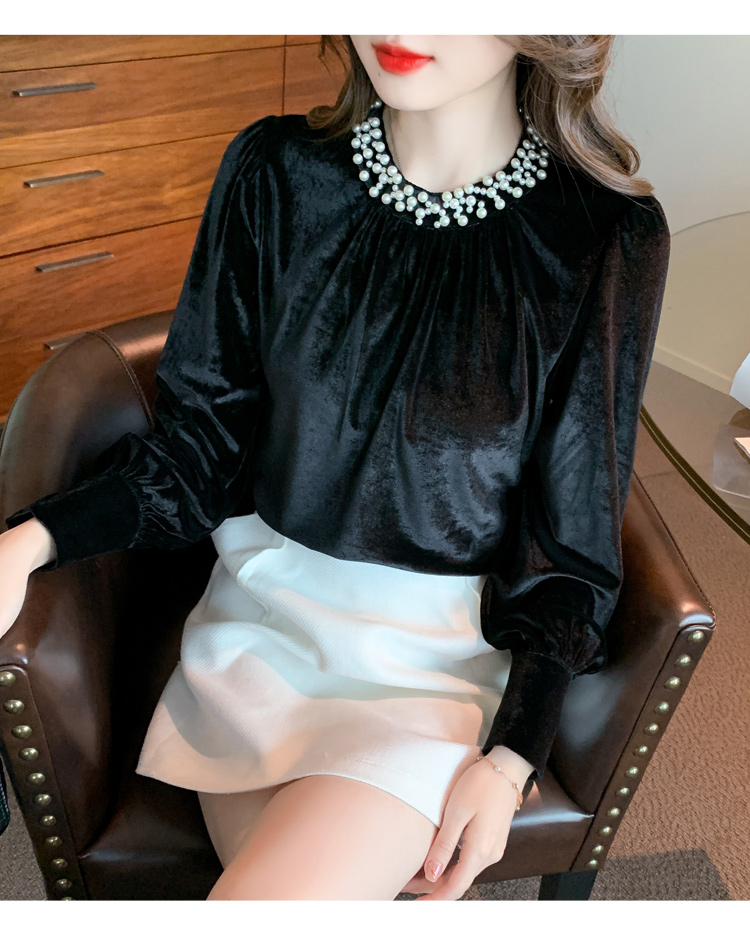 RM23603#新款金丝绒打底衫女洋气内搭长袖小衫珍珠长袖上衣