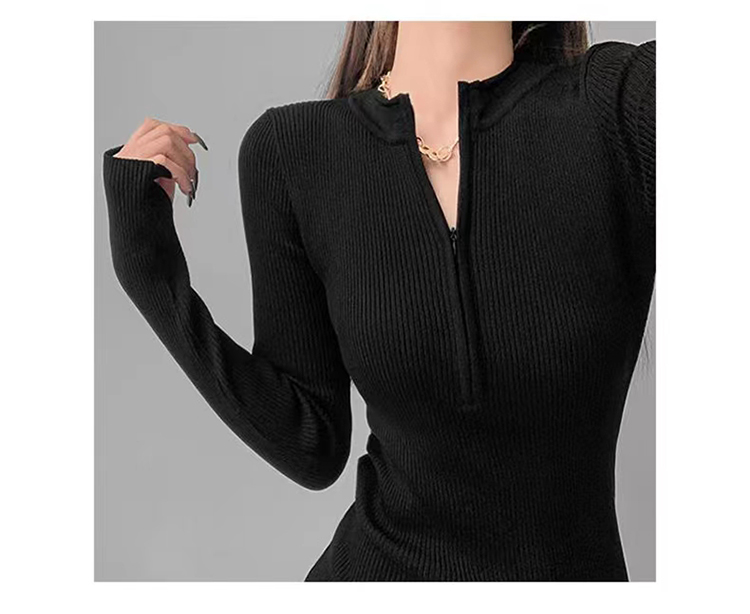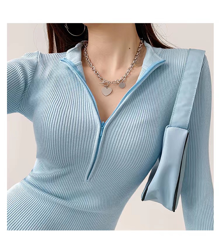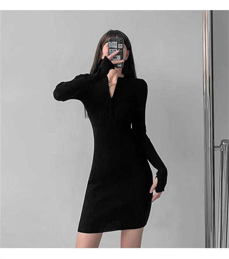 RM24842#新款半高领露肩长袖修身针织包臀连衣裙子气质中长