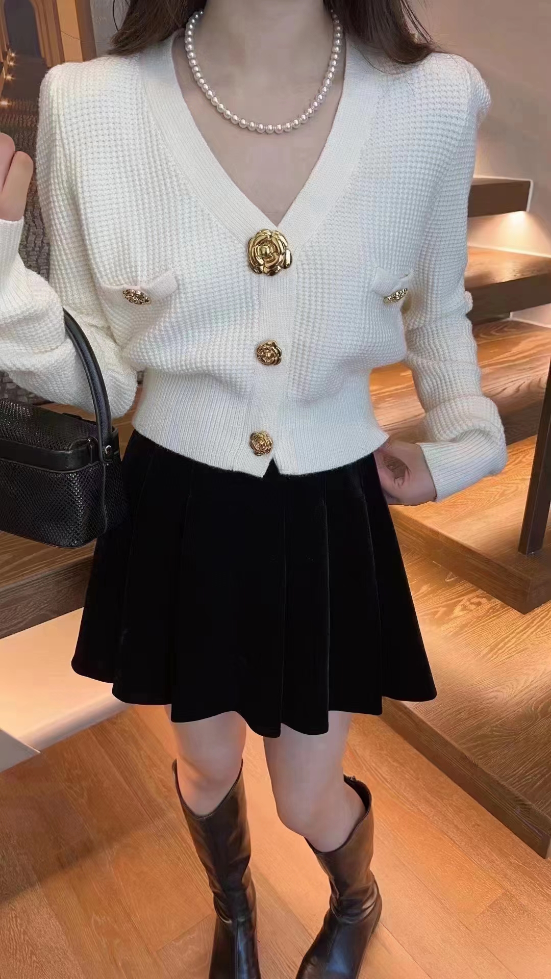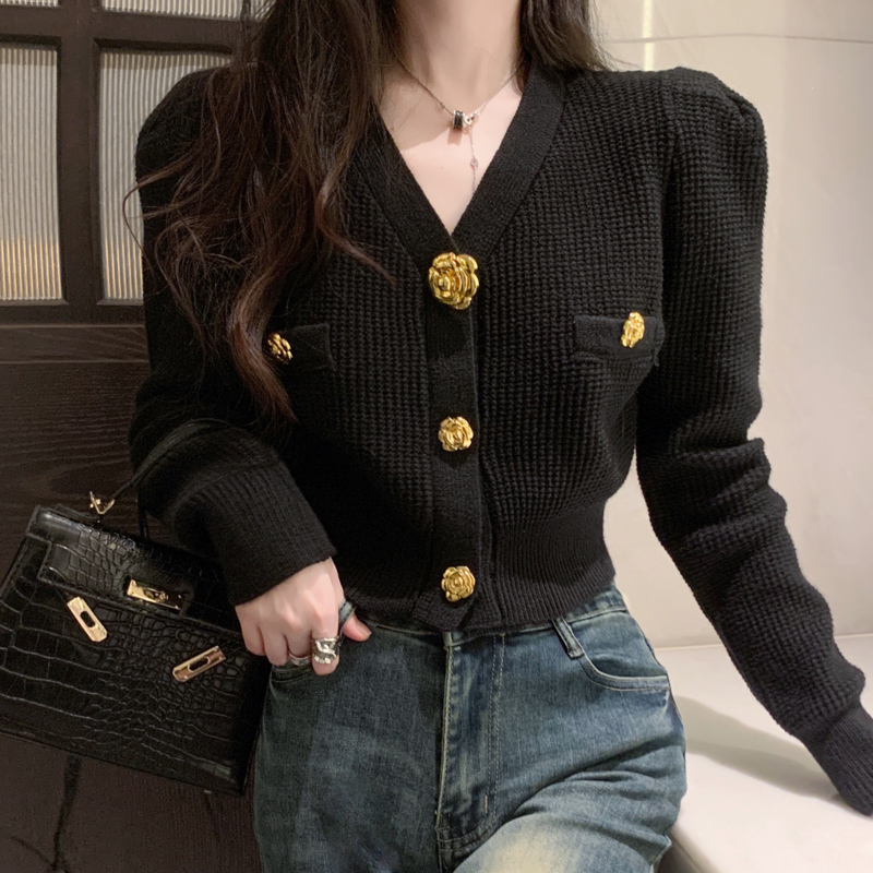 RM28537#小香风法式红色毛衣秋冬加厚金丝高级感针织开衫外套短款泡泡袖