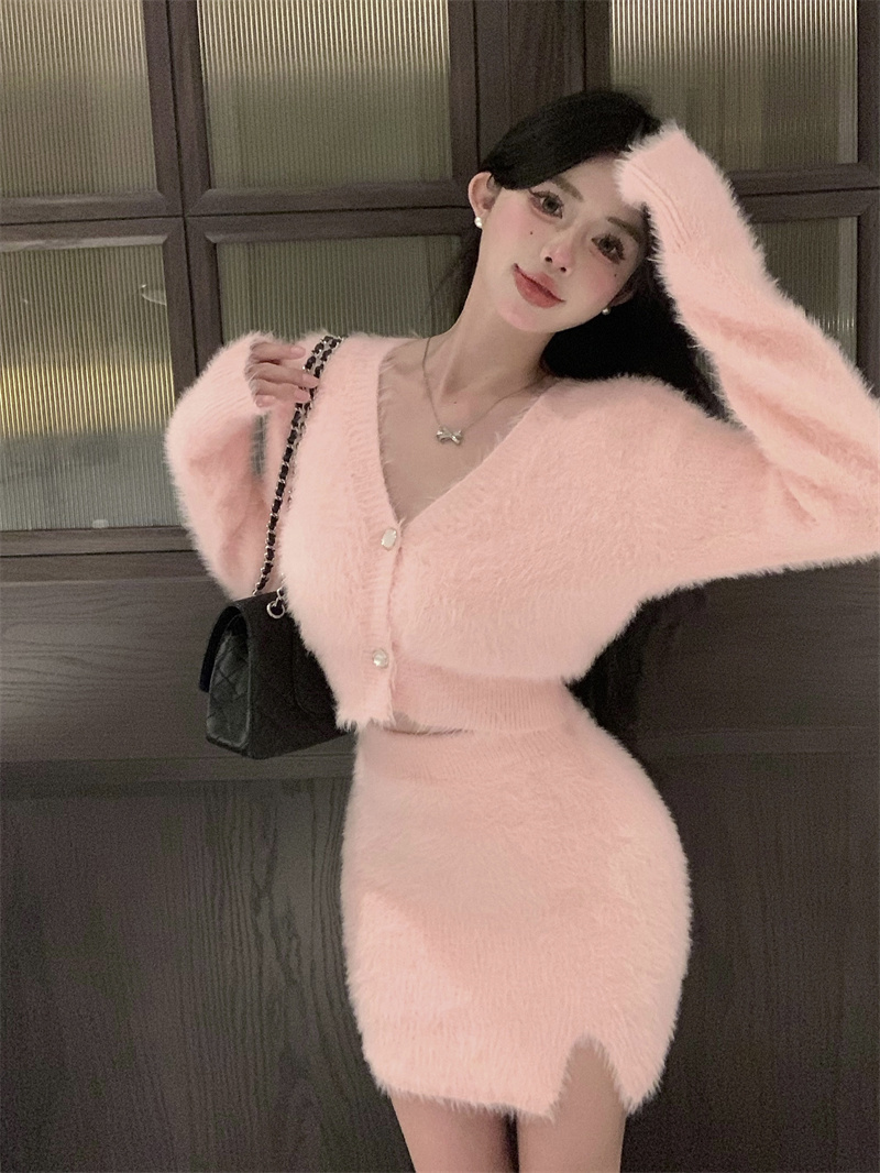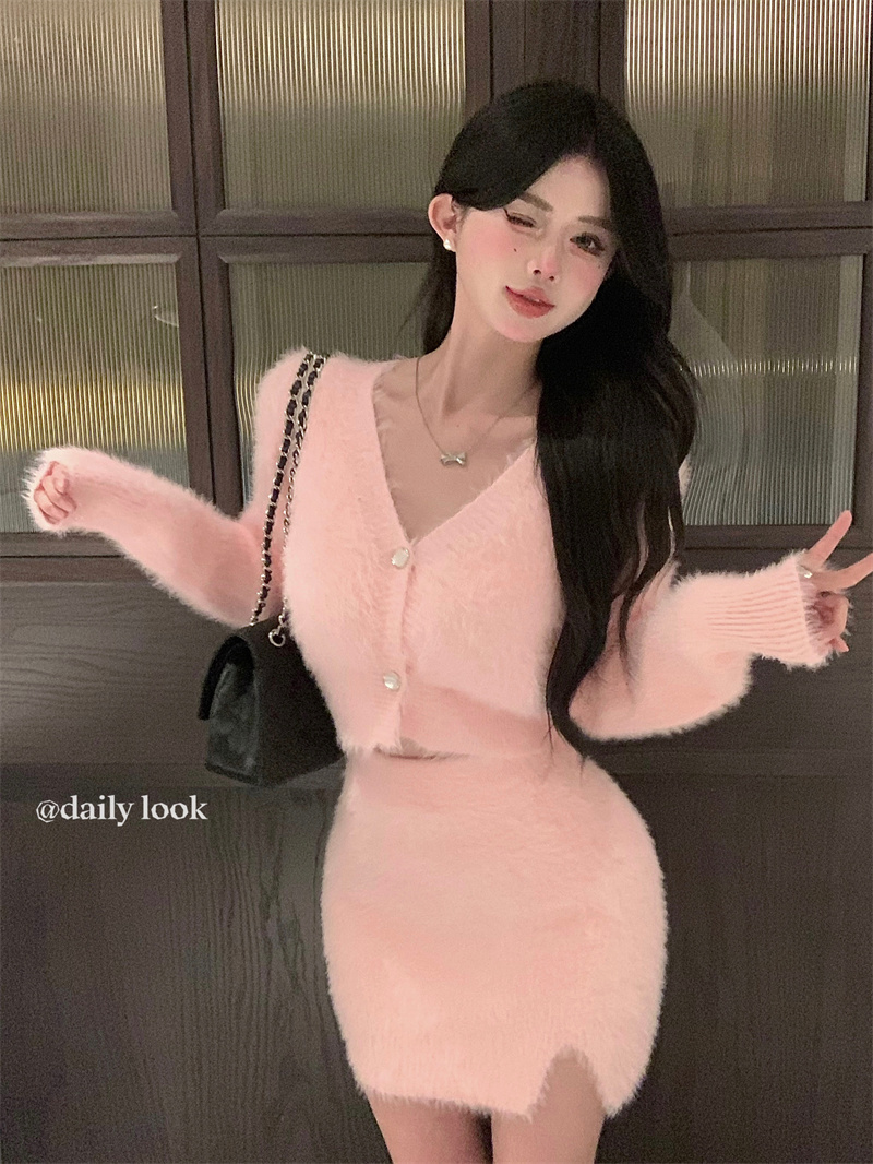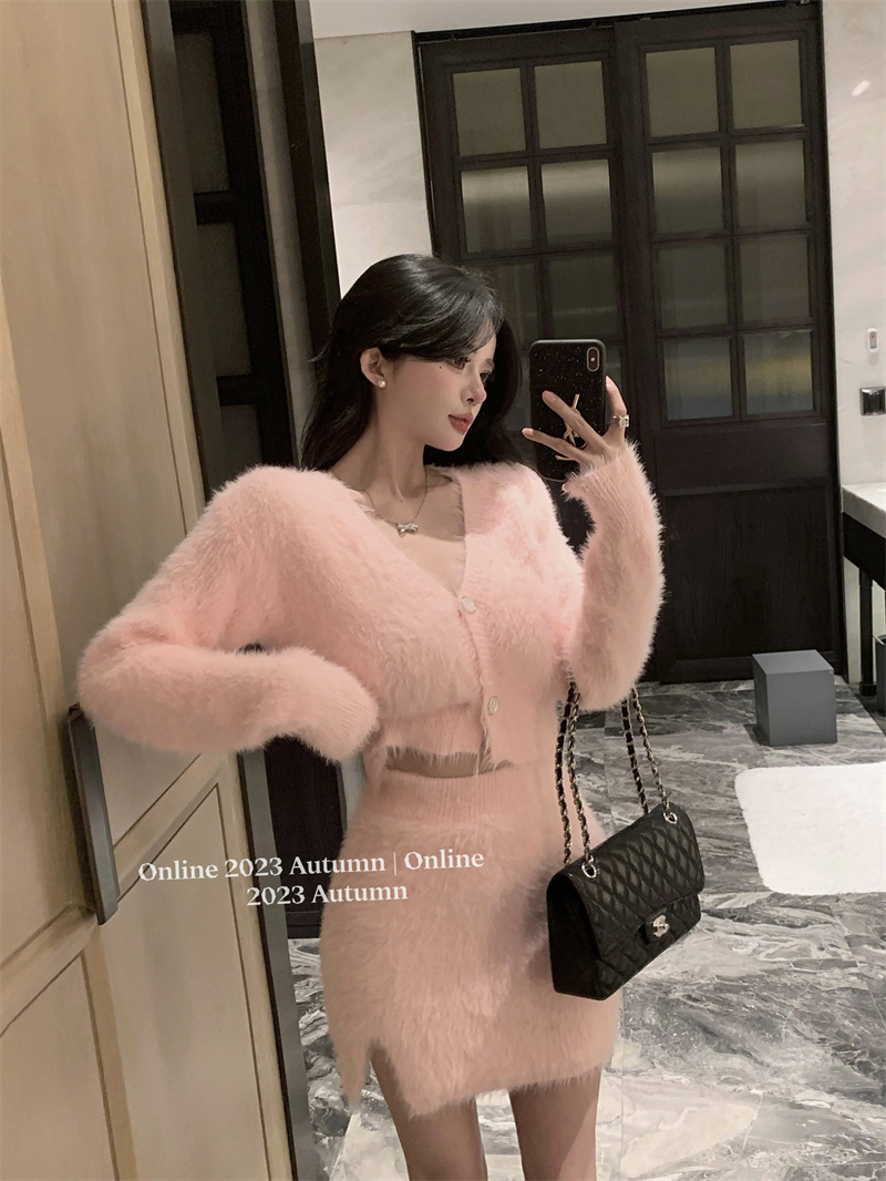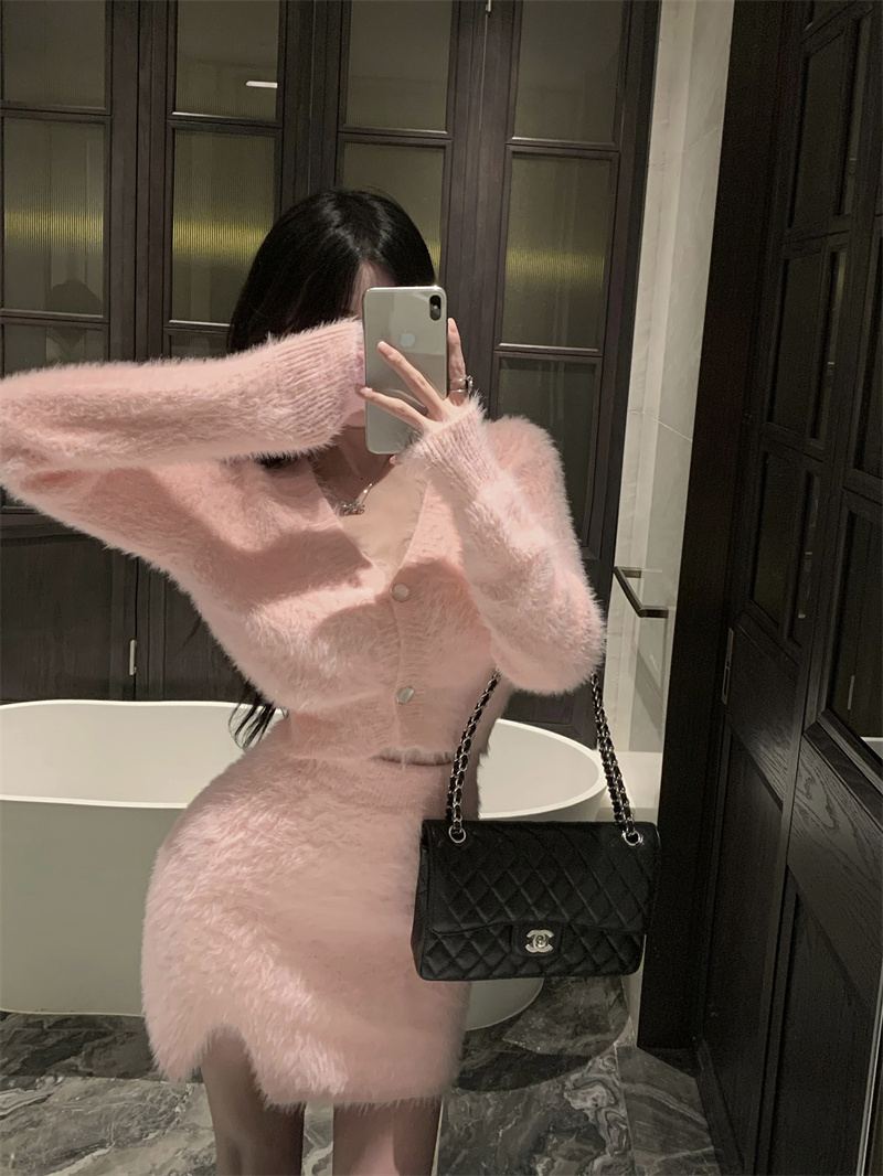 RM30770#辣妹纯欲海马毛纯色开衫性感包臀半身裙针织毛衣两件套